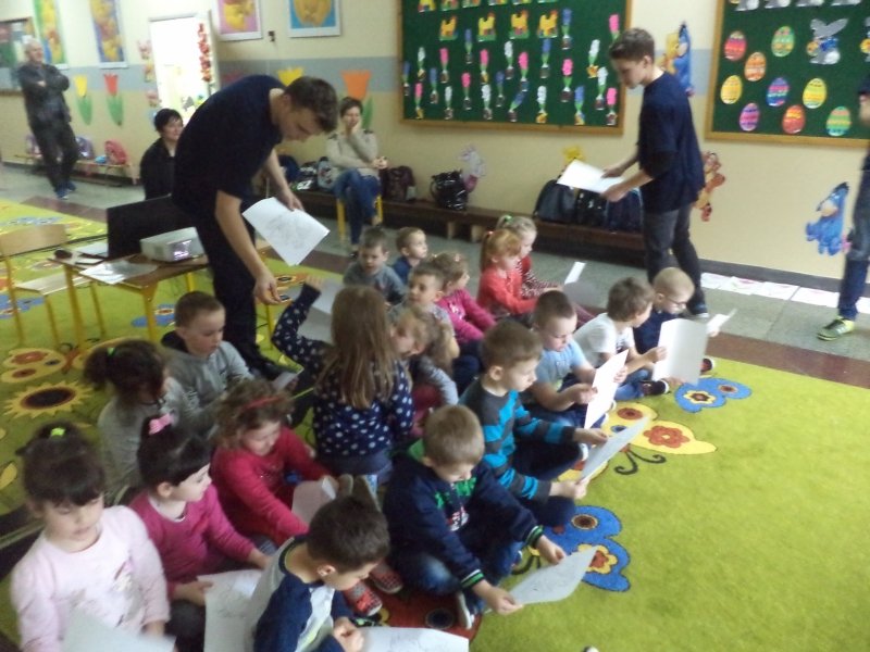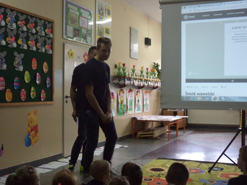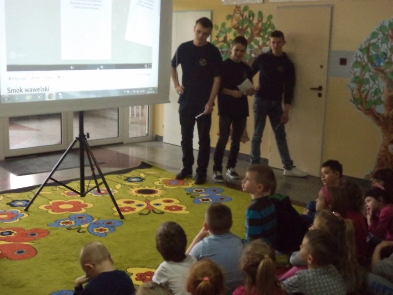 Natomiast grupa projektowa gimnazjalistów, w której znaleźli się: Mateusz Burmistrzak, Hubert Koźlik, Marcin Kubacki, Kamil Lemański oraz Jakub Mielcarek przygotowała występ dla dzieci z oddziału „0”. Chłopcy przedstawili legendę o Smoku Wawelski, ukazując fantastyczny świat słowa.