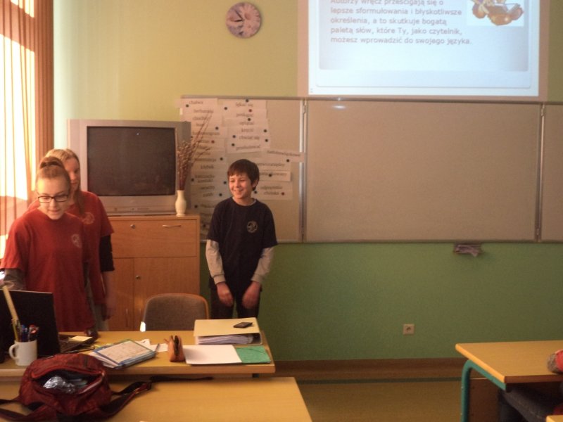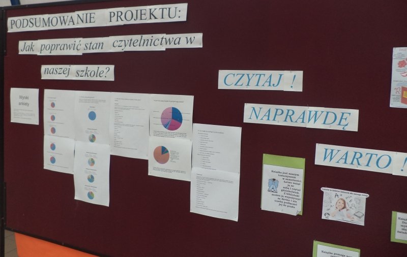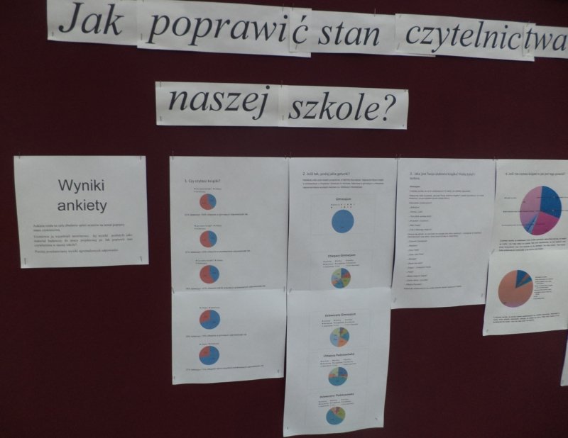 Grupa 10 uczniów z kl. IIIa i IIId wzięła udział w projekcie gimnazjalnym, którego zadaniem było sprawdzenie stanu czytelnictwa uczniów naszej szkoły, a także wprowadzenie metod, które mogłyby go poprawić. Przeprowadzona ankieta w klasach IV ujawniła, że uczniowie szkoły podstawowej bardzo chętnie czytają książki i je wypożyczają. Niestety, przez okres 3 lat ten stan się zmienia i już w I klasach gimnazjum 50% uczniów przyznaje w ankiecie, że nie czyta. Szczegółowe wyniki ankiety były zaprezentowane na gazetce szkolnej w łączniku. Zespół w skład, którego weszli: Daria Drgas, Jakub Dembowiak, Andżelika Lehmann, Monika Włodarczak oraz Nikola Wróbel, przedstawił także swoim klasom prezentację na temat korzyści płynących z czytania.