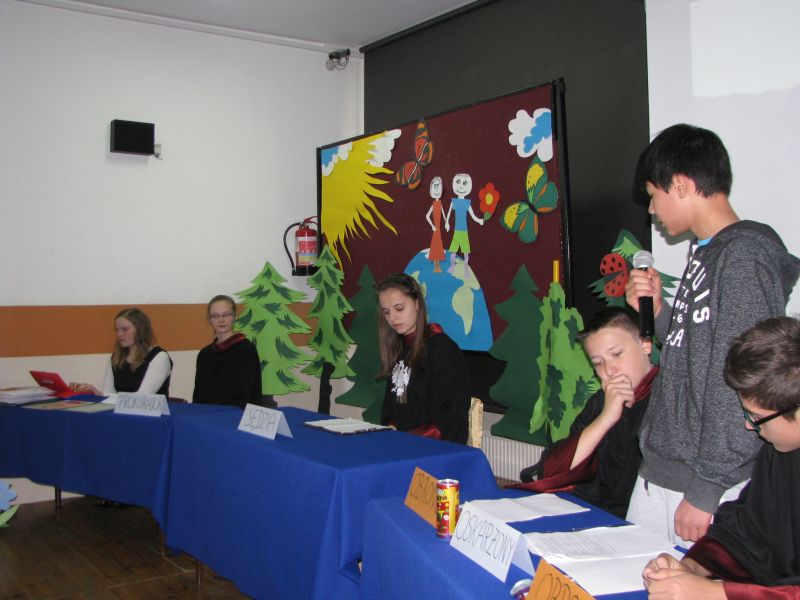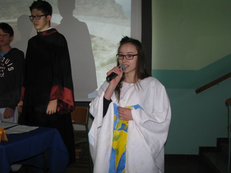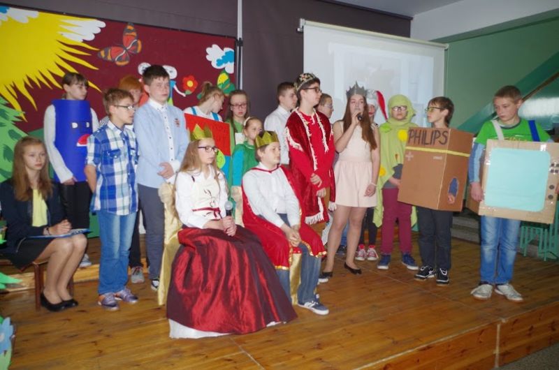 Po przemarszu uczniowie gimnazjum obejrzeli przedstawienie pt. „METAMORFOZA, czyli jak lekkoduch dojrzewa do rozważnych decyzji i działań…” przygotowane przez klasę 2a. Później Pani Dyrektor Bogumiła Andrzejewska wręczyła nagrody w konkursach „Szukamy zysku w odzysku” oraz „Listy dla Ziemi”.