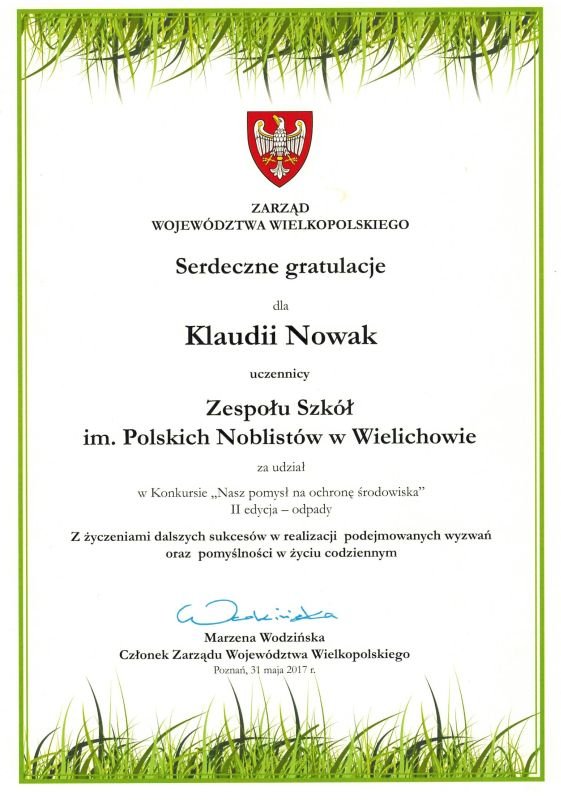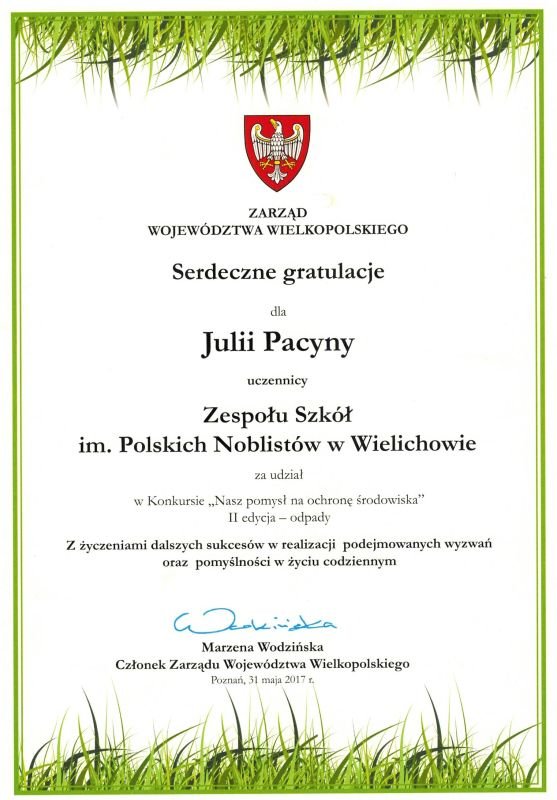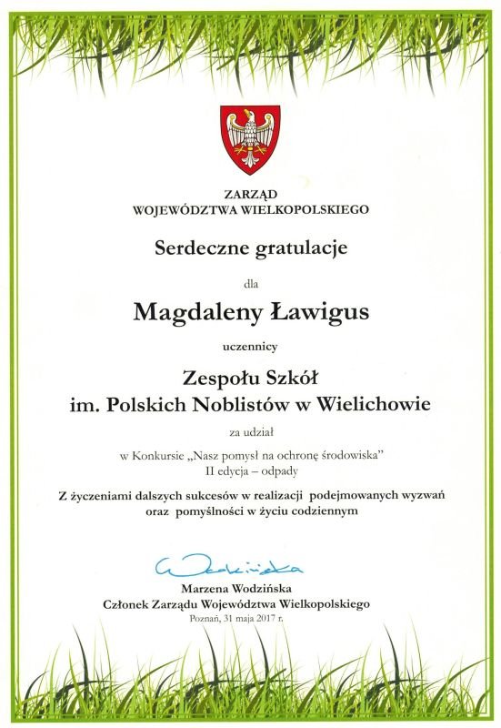 Urząd Marszałkowski Województwa Wielkopolskiego zorganizował II edycję konkursu pt. „Nasz pomysł na ochronę środowiska”.  Uczniowie naszej szkoły wykonali postery dotyczące zagospodarowania odpadów. W etapie szkolnym konkursu zwyciężyła praca zespołowa uczennic z klasy II c: Magdaleny Łowigus, Julii Pacyny i Klaudii Nowak.