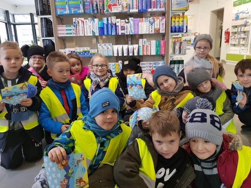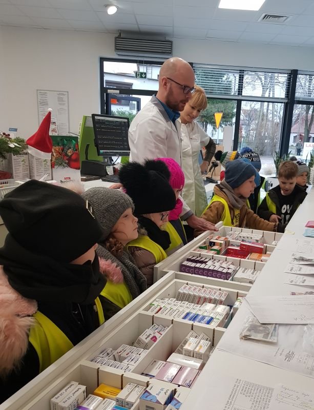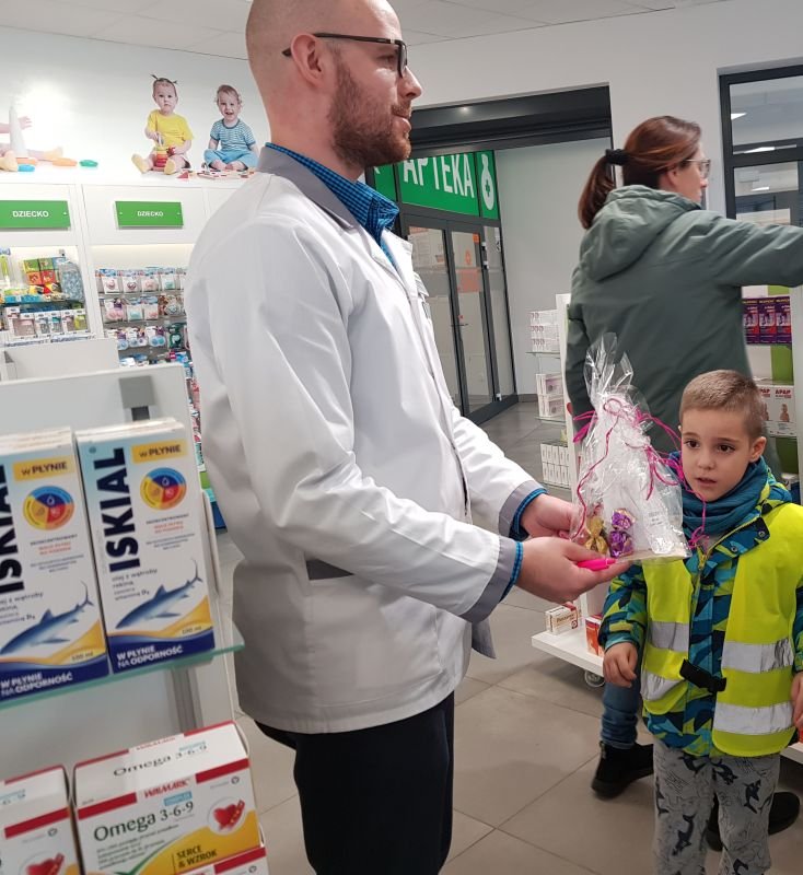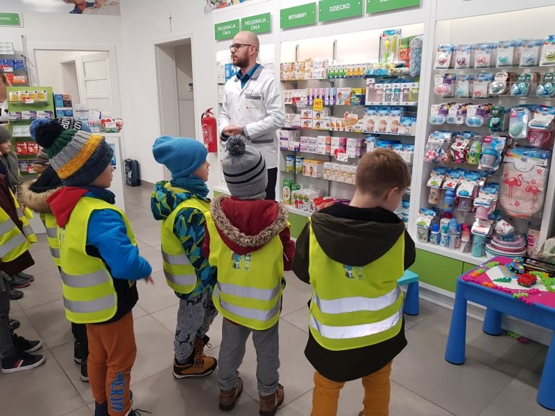 W piątek 29.11.2019r. grupa „Tygrysków” i „Kubusiów” wybrała się na wycieczkę do pobliskiej apteki. Podczas wizyty dzieci miały okazję zobaczyć jej wnętrze z bliska. Okazało się, że od środka apteka kryje wiele fascynujących miejsc i rzeczy. Pan farmaceuta pokazał dzieciom różne maści, krople, syropy, tabletki oraz plastry, które pomagają w walce z chorobą. Przypomniał, że pod żadnym pozorem nie można bawić się lekarstwami oraz, że lekarstwa możemy brać tylko pod czujnym okiem osoby dorosłej. Przedszkolacy zobaczyli izbę receptur nazywaną „sercem apteki”, gdzie wykonuje się tylko leki na zamówienie, według podanych przepisów. Dowiedzieli się również, że zostanie farmaceutą to długa i ciężka droga, a praca w aptece jest bardzo ważna i odpowiedzialna. Na koniec po pamiątkowym zdjęciu dzieci zostały obdarowane miłymi upominkami.