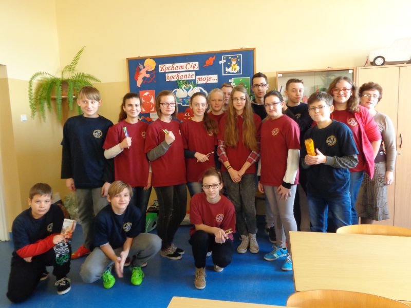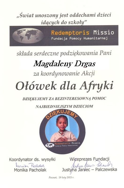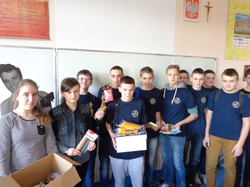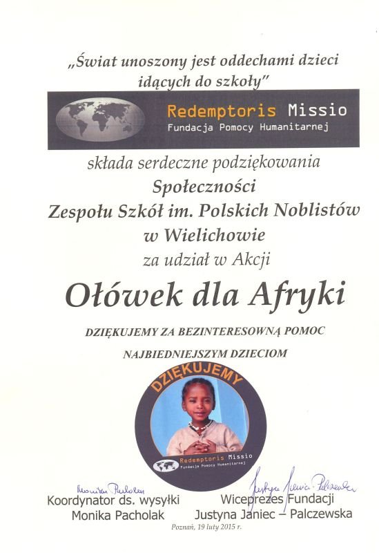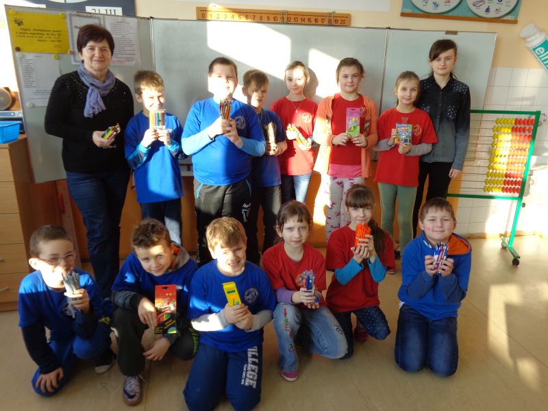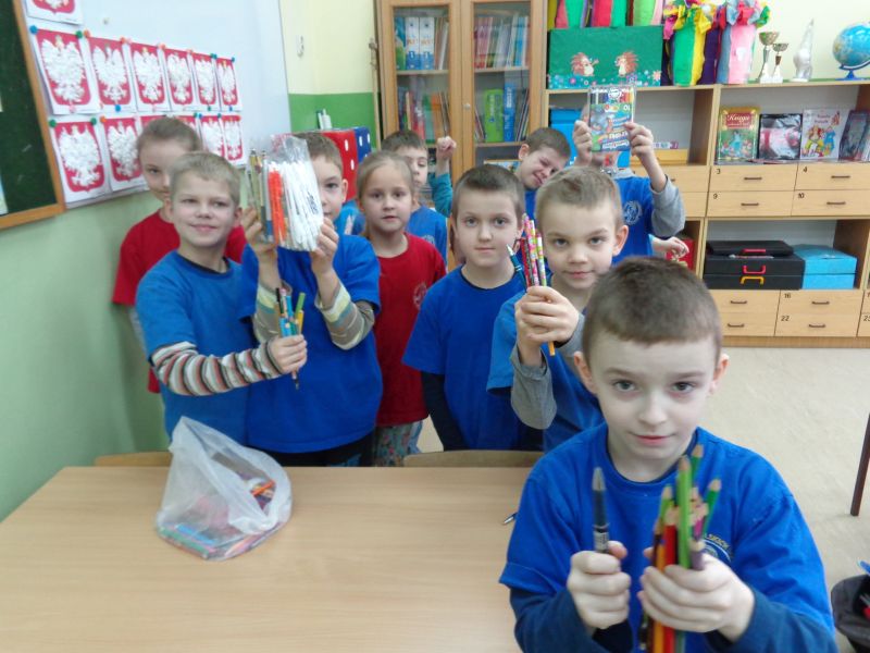 W ramach akcji pt. „Ołówek dla Afryki” zorganizowałam zbiórkę artykułów szkolnych - ołówków, kredek oraz długopisów. Mogły być one zarówno nowe, jak i używane. Zbiórka trwała do 13.02.2015r. Każdy ołówek, każdy długopis i kredka były na wagę złota. Nam zalegały w szufladach i torebkach, a dzieciom w Afryce były potrzebne. Zebraliśmy ogromną liczbę pomocy, bo aż 5911 sztuk. Dzięki nim, afrykańskie dzieci będą mogły pójść do szkoły i zapewnić sobie lepszą przyszłość. W akcję włączyli się nie tylko uczniowie szkoły podstawowej oraz gimnazjum, ale także grono pedagogiczne i pracownicy placówki z Panią Dyrektor na czele. Bardzo dziękuję wszystkim za pomoc i wsparcie podczas trwania całej akcji