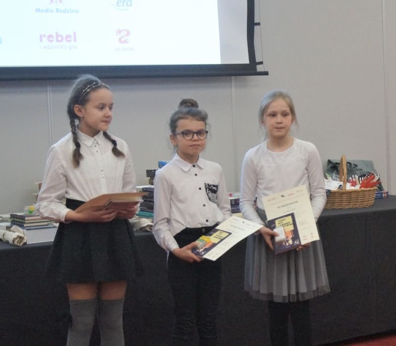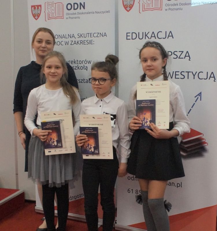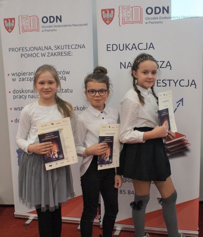 W miniony piątek, 1 marca, podczas Targów Edukacyjnych w Poznaniu trzy uczennice naszej szkoły – Jagoda Łabińska, Michalina Matuszewska i Weronika Przybyła odebrały wyróżnienie w konkursie pt. „Książkomania” organizowanym przez Ośrodek Doskonalenia Nauczycieli w Poznaniu. Polegał on na stworzeniu filmowej reklamy książki. Wybór padł na ciekawą i tajemniczą opowieść Antoniny Kasprzak pt. „Wiłka smocza dziewczynka”. Dziewczynki otrzymały gratulacje z rąk organizatorów oraz dyplomy i nagrody książkowe. Po uroczystej gali wzięły udział w kinowej lekcji nt. korespondencji sztuk w filmie, a na koniec miały okazję obejrzeć ekranizację powieści Markusa Zusaka pt. „Złodziejka książek”.