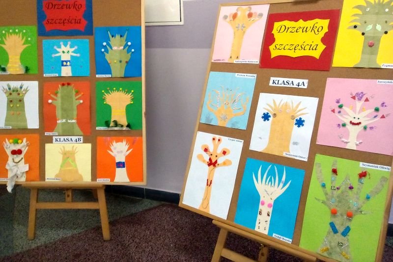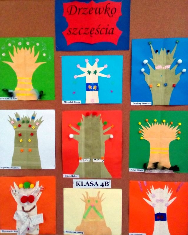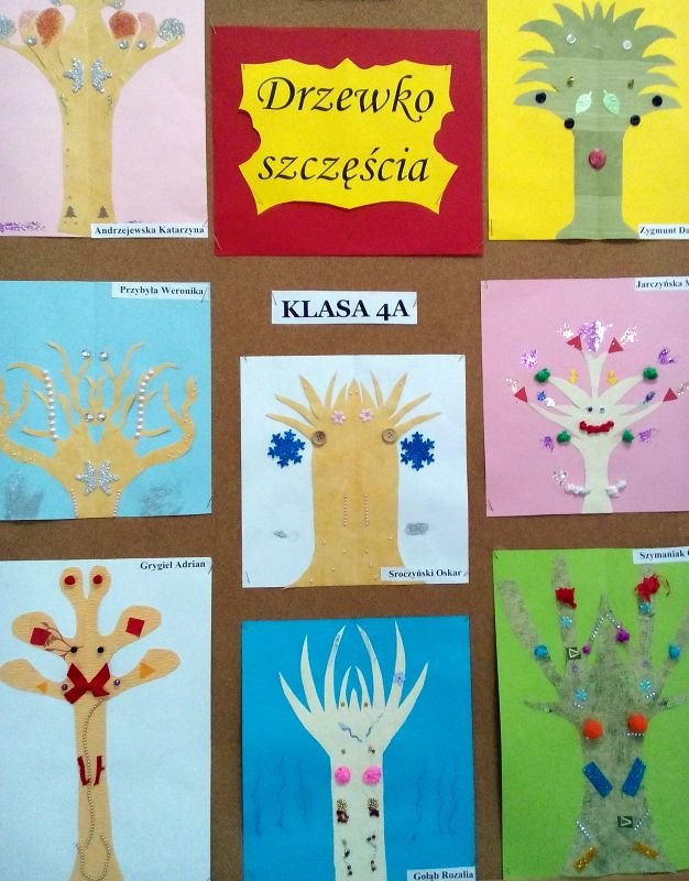 Kompozycją idealnie zrównoważoną jest kompozycja symetryczna- taka, której obie połowy po dwóch stronach osi są takie same lub bardzo do siebie podobne. Znajomością tej kompozycji wykazali się uczniowie klas czwartych tworząc „Drzewko szczęścia”.