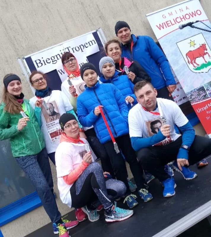Mimo iż towarzyszył nam deszcz i duży wiatr, pogoda ducha dopisała wszystkim. Na linii startu pojawiło się około 160 zawodniczek i zawodników. W tym roku uczestnicy w Wielichowie, dzięki wsparciu Fundacji PKO Banku Polskiego, biegli dla Julki i Anny. Imprezę rozpoczęła wspólna rozgrzewka, którą poprowadziła Pani Magdalena Śledź-Roesler. Pierwszy odbył się bieg najmłodszych Wilcząt, którzy mieli do pokonania dystans 400 metrów. Każdy dobiegł do mety szczęśliwy, gdzie otrzymał medal wręczany przez Panią Burmistrz, Panią Dyrektor i harcerzy. Odbył się także Bieg Honorowy na dystansie 1963 metrów – dla upamiętnienia roku śmierci ostatniego Żołnierza Niezłomnego – w którym biegacze wystartowali w 3 kategoriach: 8-12 lat, 13-15 lat oraz 16+. Walka o najwyższe miejsca toczyła się do samego końca. W kategorii 8-12 lat zwyciężył Ignacy Pudliszewski, drugie miejsce zajął Adam Górczyński, a trzecie Wojtek Minge. W kategorii 13-15 lat najlepszy okazał się Maksymilian Donaj, drugi Ksawery Pudliszewski, trzeci Emil Sobecki, a w 16+ zwyciężył Pan Michał Tic, drugi był Pan Paweł Górczyński, a trzecia Pani Karolina Klemenska. Podobnie jak w roku ubiegłym uczestnicy mogli zmierzyć się w biegu na dystansie 8 km. Wystartowało w nim ponad 90 biegaczy. Przełajowa, w niektórych miejscach pełna błota, trasa prowadziła lasem przez Dębsko z powrotem do Wielichowa. Pierwsze miejsce w kategorii kobiet zajęła Pani Magdalena Śledź-Roesler, drugie Pani Agnieszka Wachowska, a trzecie Pani Małgorzata Nowacka. W kategorii mężczyzn pierwsze miejsce zajął Pan Łukasz Kaczmarek, drugie Pan Łukasz Popiołkiewicz, a trzecie Pan Marek Mocek.