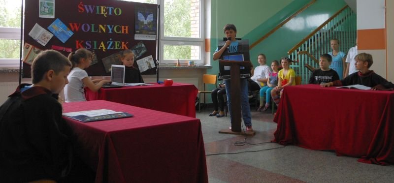 W pierwszej części spotkania uczniowie klas piątych zaprezentowali przedstawienie "Książka przed sądem", w którym wcielając się w role sędziego, prokuratora, obrońcy, świadków oraz oskarżonej (w tym wypadku książki), rozstrzygali problem czy we współczesnym świecie potrzebna jest książka, czy też można ją zamknąć w archiwum i zastąpić np. płytami CD.
