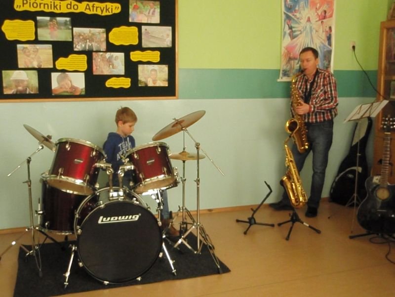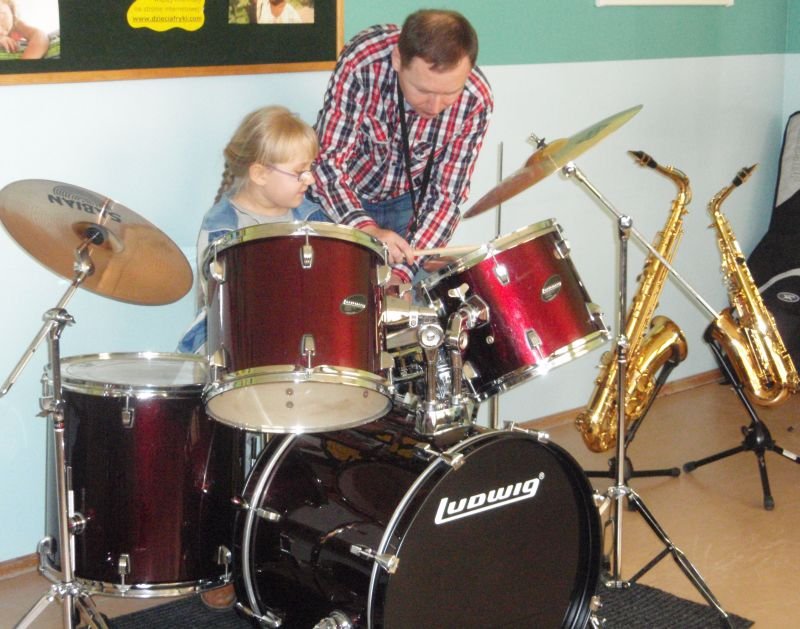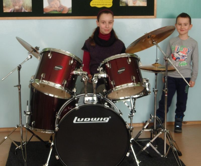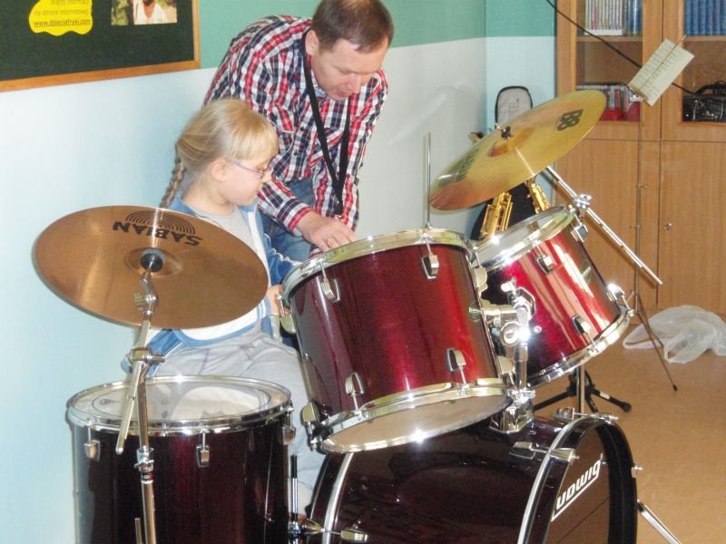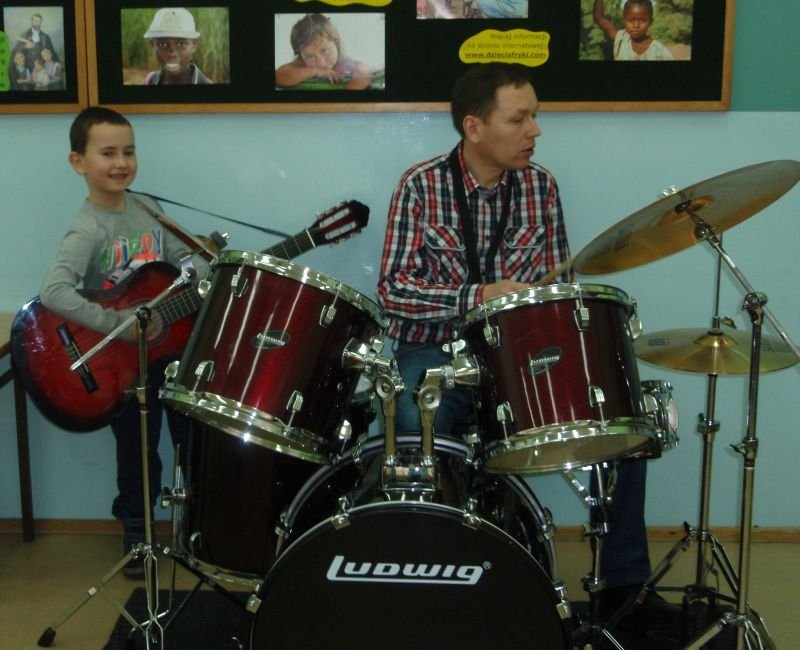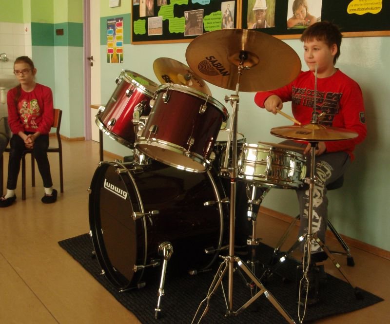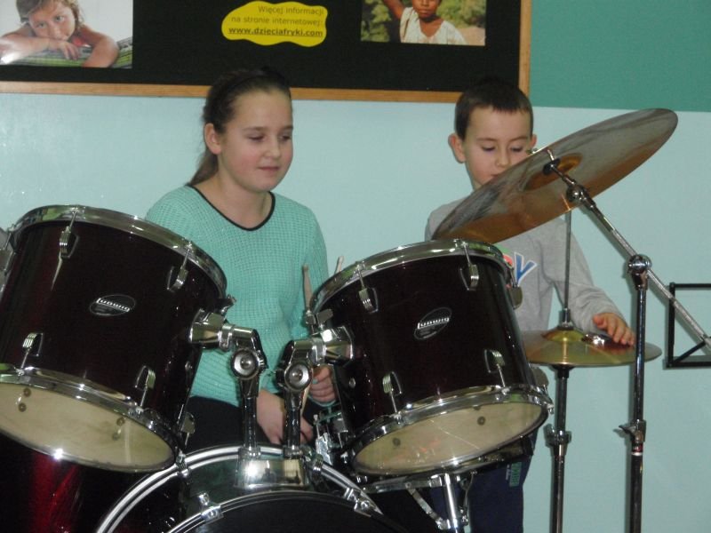 Największym jednak zainteresowaniem wśród dzieci cieszyła się perkusja. Wszyscy uczestnicy zasiadali przy niej po kilka razy, a niektóre dzieci odkryły w sobie poczucie rytmu, co może w przyszłości zaowocować chęcią nauki gry na którymś z instrumentów.