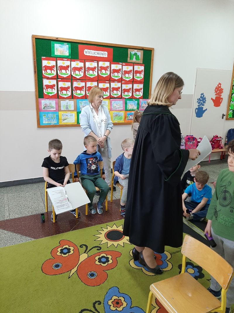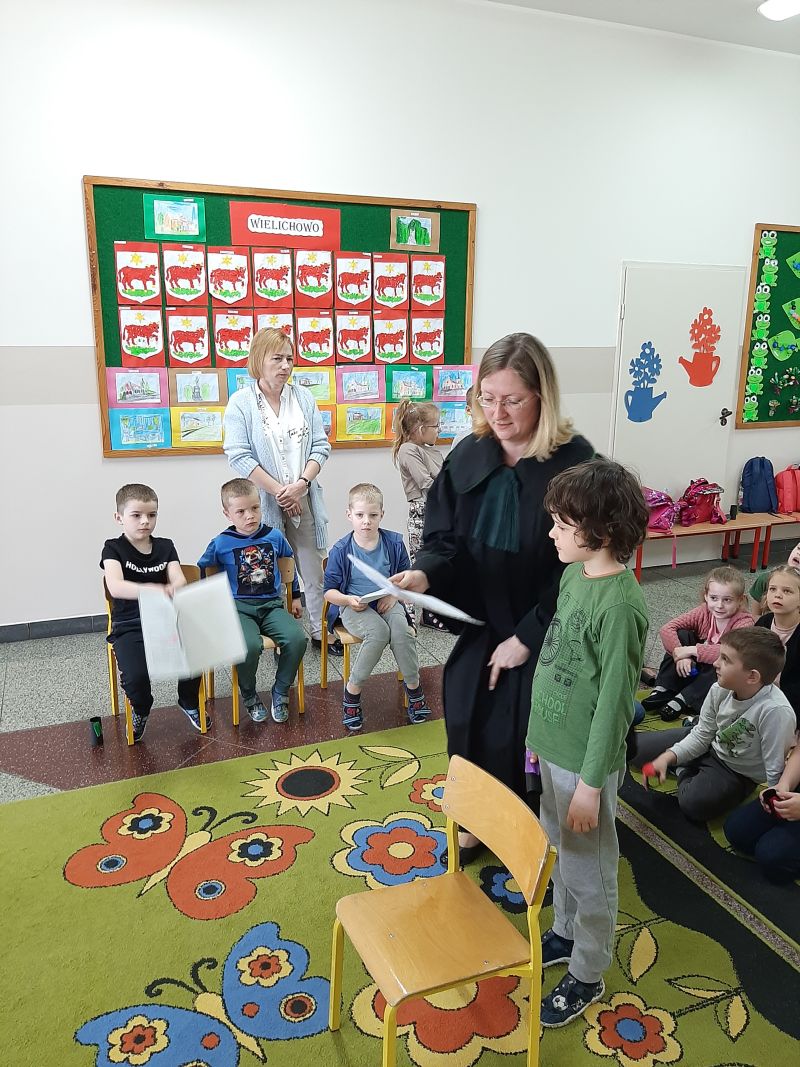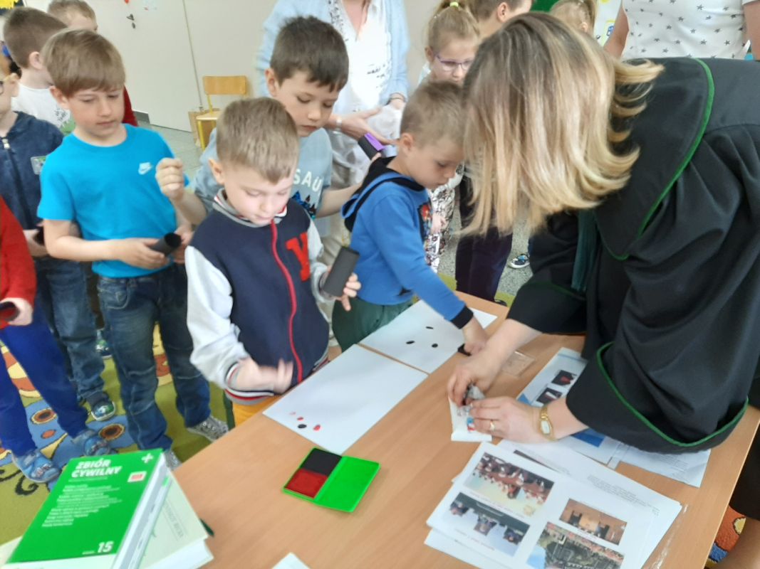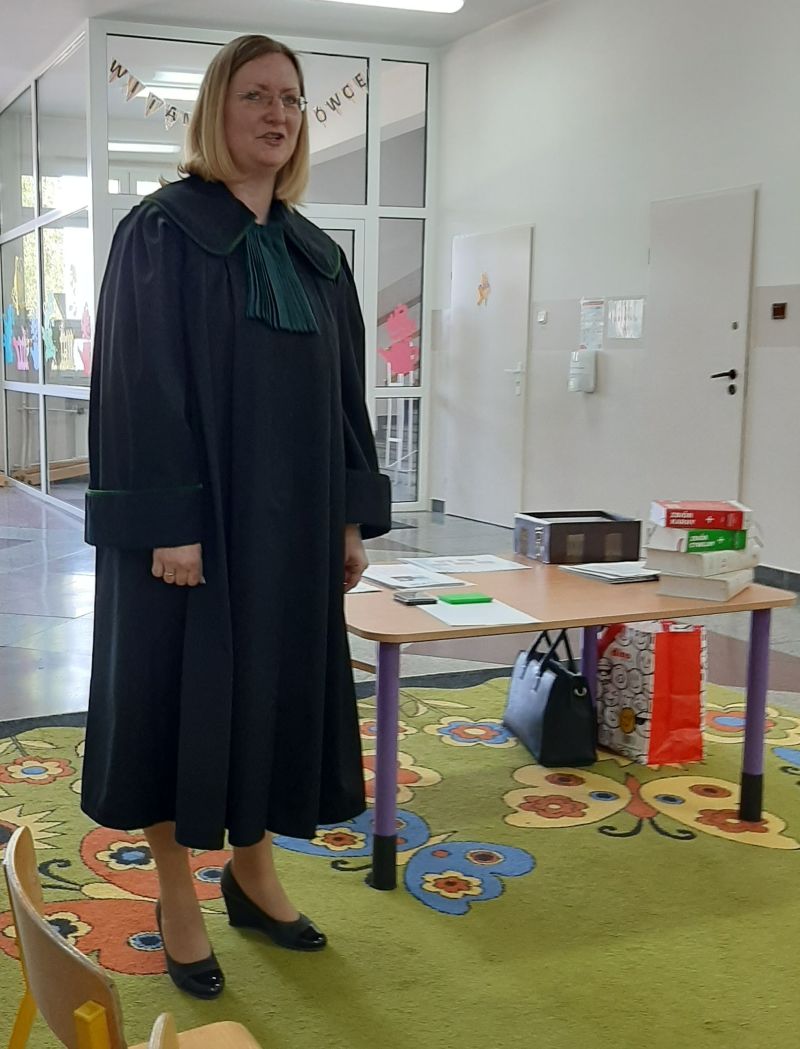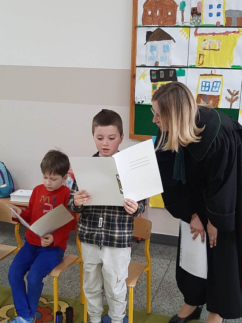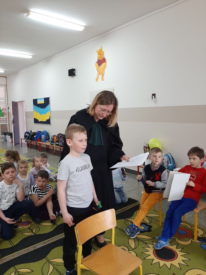 5 maja 2022r. naszą Zerówkę odwiedziła mama naszego kolegi z grypy Kubusiów - Pani Małgorzata Stobienia, która na co dzień pracuje jako adwokat w sądzie. Dzieci poznały na czym polega zawód adwokata, radcy prawnego czy sędziego. Pani przybliżyła im najważniejsze tajniki tego zawodu. Dzieci miały możliwość odbijania swoich linii papilarnych, oglądać grube książki z kodeksami prawnymi, zapoznać się z salą sądową , a także zobaczenia adwokata w stroju sądowym- todze. Największym wyzwaniem dla dzieci było wcielenie się w role pracowników sądowych (adwokat, sędzia, prokurator, protokolant, świadek, oskarżony) po to, aby odzwierciedlić toczącą się rozprawę sądową o kradzież hulajnogi. Spotkanie to było bardzo owocne, a zarazem emocjonujące. Może w przyszłości ktoś z naszych przedszkolaków wybierze zawód adwokata.