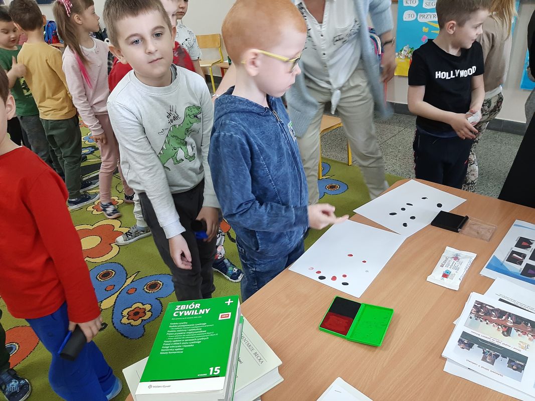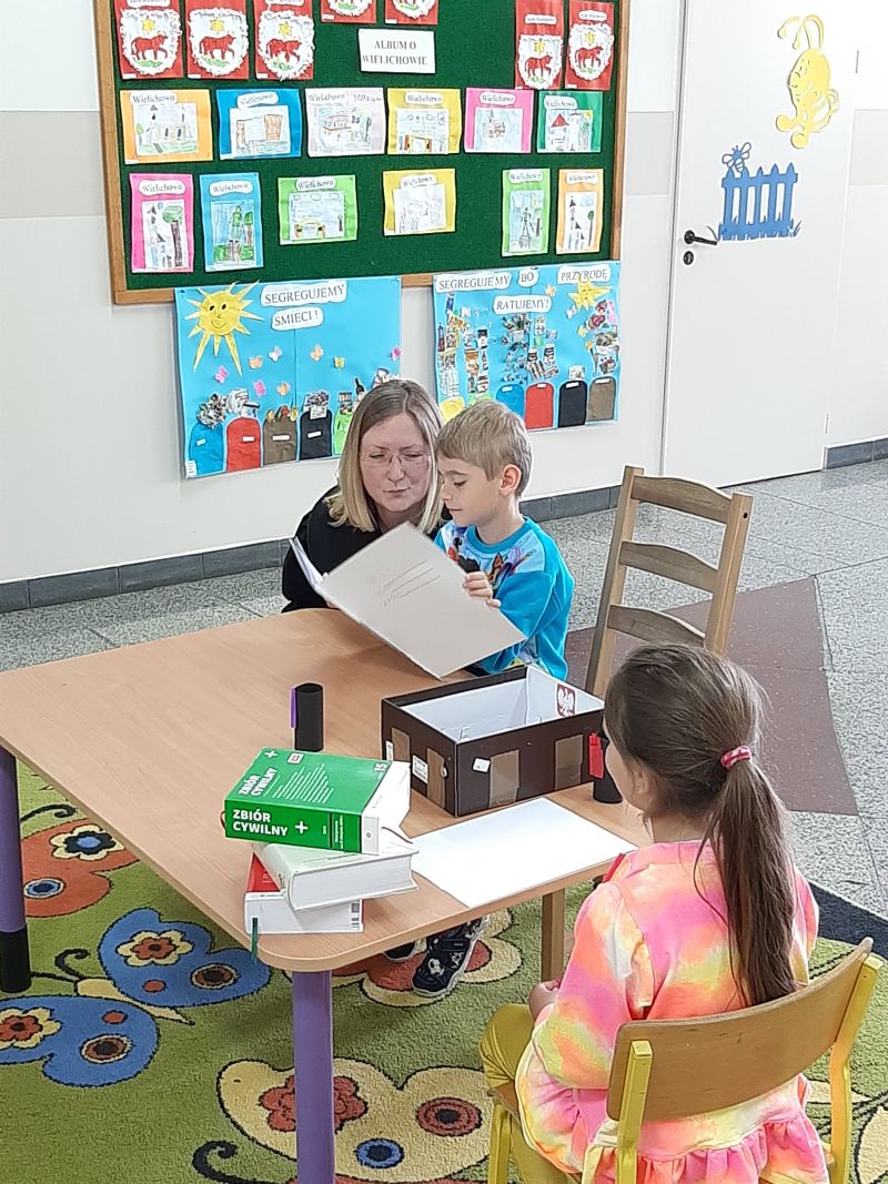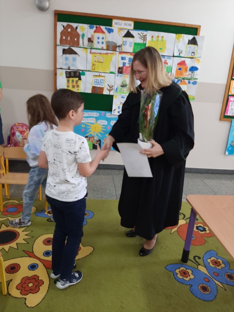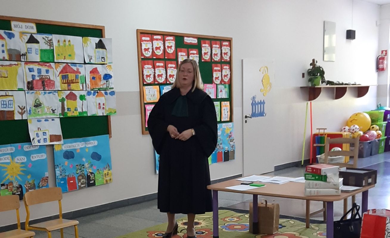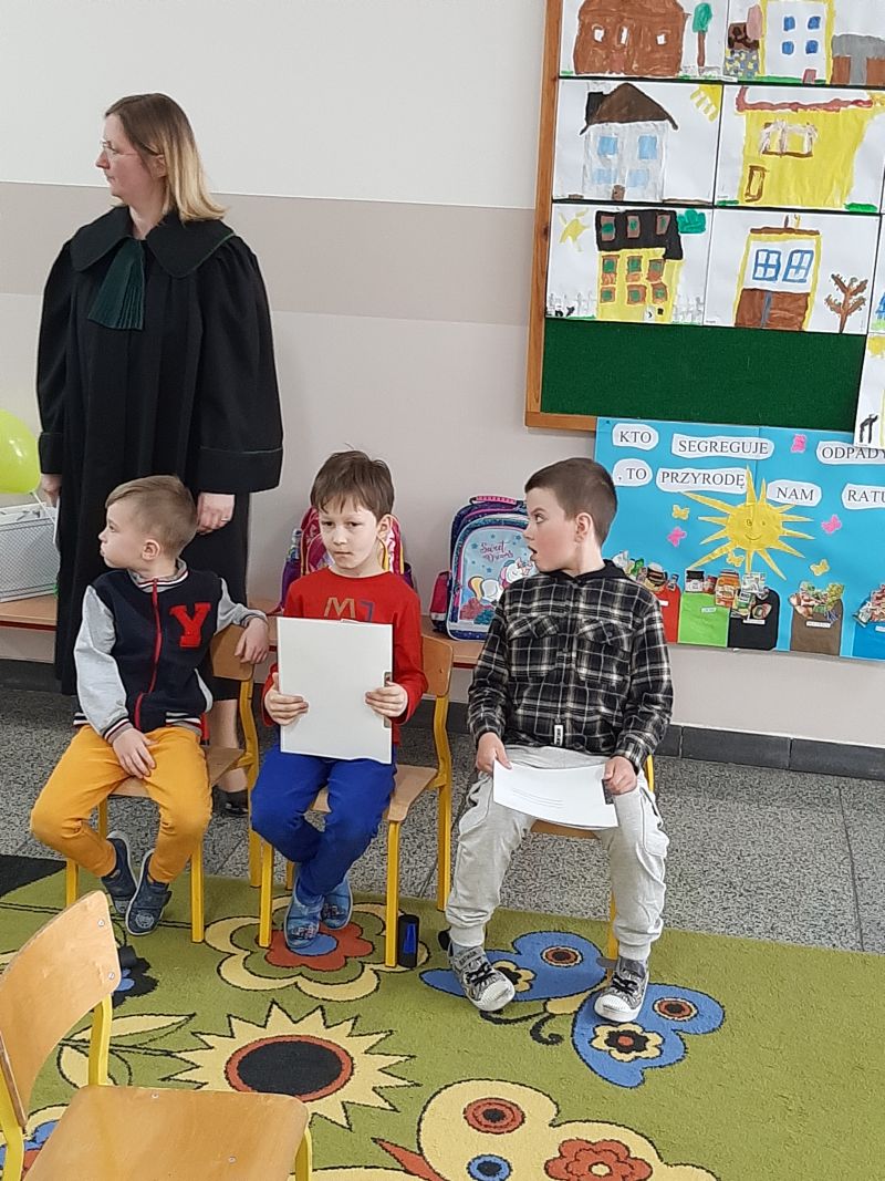 5 maja 2022r. naszą Zerówkę odwiedziła mama naszego kolegi z grypy Kubusiów - Pani Małgorzata Stobienia, która na co dzień pracuje jako adwokat w sądzie. Dzieci poznały na czym polega zawód adwokata, radcy prawnego czy sędziego. Pani przybliżyła im najważniejsze tajniki tego zawodu. Dzieci miały możliwość odbijania swoich linii papilarnych, oglądać grube książki z kodeksami prawnymi, zapoznać się z salą sądową , a także zobaczenia adwokata w stroju sądowym- todze. Największym wyzwaniem dla dzieci było wcielenie się w role pracowników sądowych (adwokat, sędzia, prokurator, protokolant, świadek, oskarżony) po to, aby odzwierciedlić toczącą się rozprawę sądową o kradzież hulajnogi. Spotkanie to było bardzo owocne, a zarazem emocjonujące. Może w przyszłości ktoś z naszych przedszkolaków wybierze zawód adwokata.