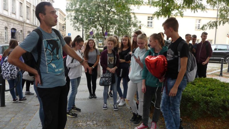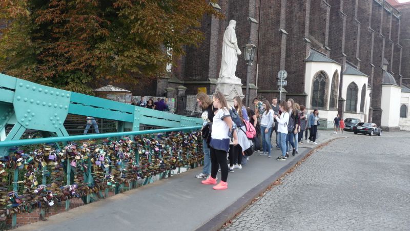Później grupą zaopiekował się p. przewodnik opowiadając wiele ciekawych historii i legend. Młodzież zobaczyła budowle Starego Miasta - ciekawe, ze względów architektonicznych, Rynek, Halę Targową, ciekawe mosty ( jednemu  z mostów gimnazjaliści nadali nową nazwę). Zaprzyjaźnili się również z napotkanym po drodze krasnalami.