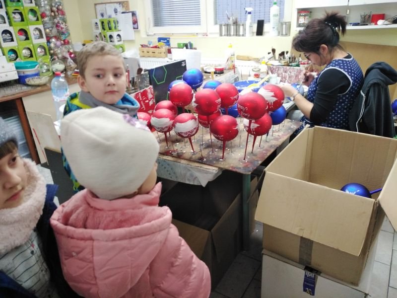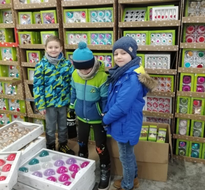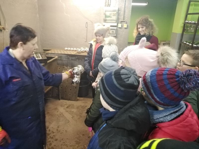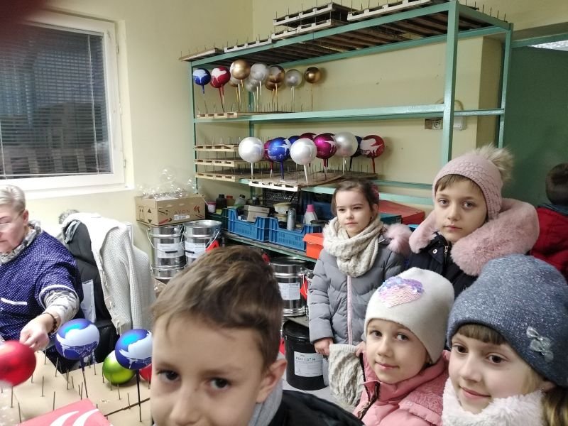 W poniedziałek 16 grudnia 2019r. uczniowie klasy 1b i 3c z wychowawczyniami p. Z. Kucharczak i p. M. Andrzejewską pojechali na wycieczkę do Fabryki Ozdób Choinkowych w Stodolsku. Podczas pobytu w zakładzie zobaczyli cały proces produkcyjny szklanych bombek choinkowych. Od pierwszego etapu, gdzie ze szklanych rurek podgrzewanych palnikami wydmuchiwane są bombki, poprzez srebrzalnię i lakiernię do dekoratorni - tutaj na bombkach malowane są przeróżne wzory ozdabiane brokatami i koralikami. Następnie zapakowane w pudełka bombki trafiają do magazynu, gdzie można podziwiać te kolorowe cudeńka. Na koniec każde dziecko otrzymało pięknie ozdobioną bombkę ze swoim imieniem. Ten wyjazd to miło spędzony czas, który dał dzieciom możliwość poznania ciekawych zawodów i wprowadził w świąteczny nastrój.