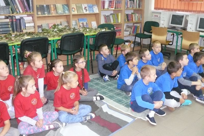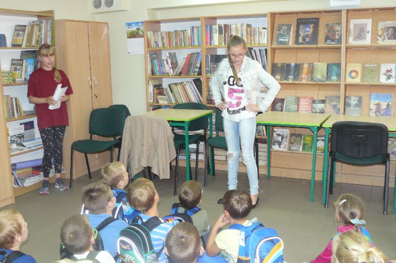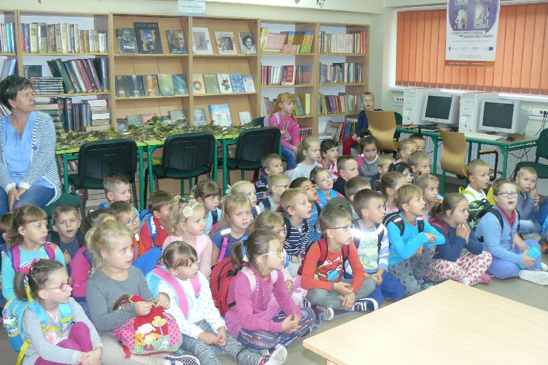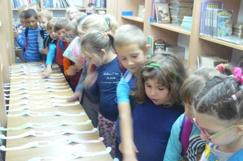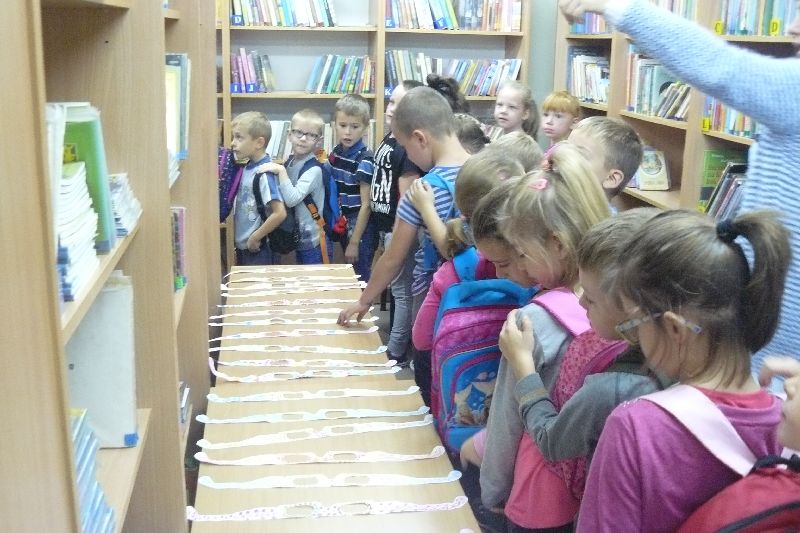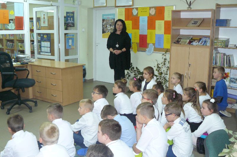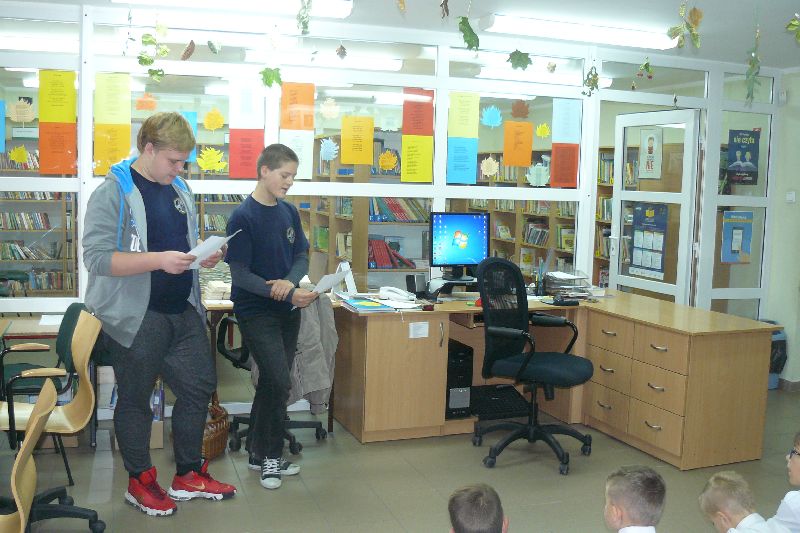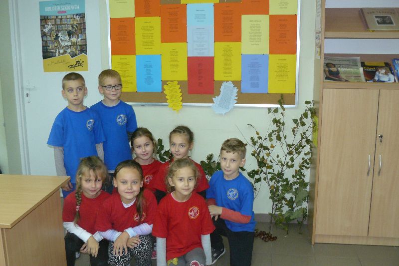 W tym roku Międzynarodowy Miesiąc Bibliotek Szkolnych był obchodzony pod hasłem „Październikowe wierszobranie.” W pierwszym tygodniu października bibliotekę odwiedziły dzieci z oddziału zerowego. Uczniowie z Koła bibliotecznego zaprezentowali im wiersz pt. „Pan Hilary” J. Brzechwy. Wychodząc z biblioteki, każdy uczeń zerówki otrzymał szablon okularów, który następnie wszyscy pokolorowali i przynieśli na wystawę do biblioteki. W drugim tygodniu uczniowie mogli się zapoznać z wystawą materiału przyrodniczego, na który składały się różnego rodzaju liście i gałęzie z okolicznych lasów, pól, łąk i ogrodów. Dla klas 1-3 szkoły podstawowej uczniowie z Koła bibliotecznego przygotowali wiersz „Dwa wiatry” J. Tuwima. Osoby odwiedzające w tych dniach bibliotekę mogły wziąć udział w konkursie dotyczącym wierszy J. Tuwima, zwycięzcy zostali nagrodzeni.