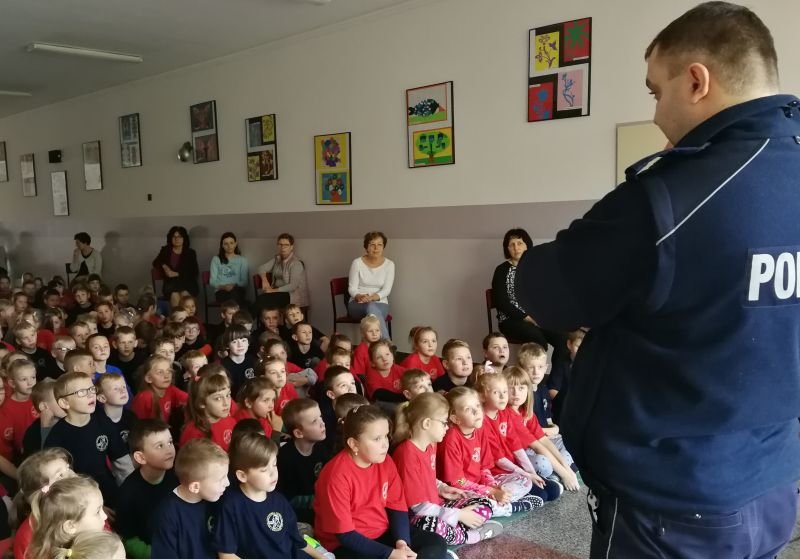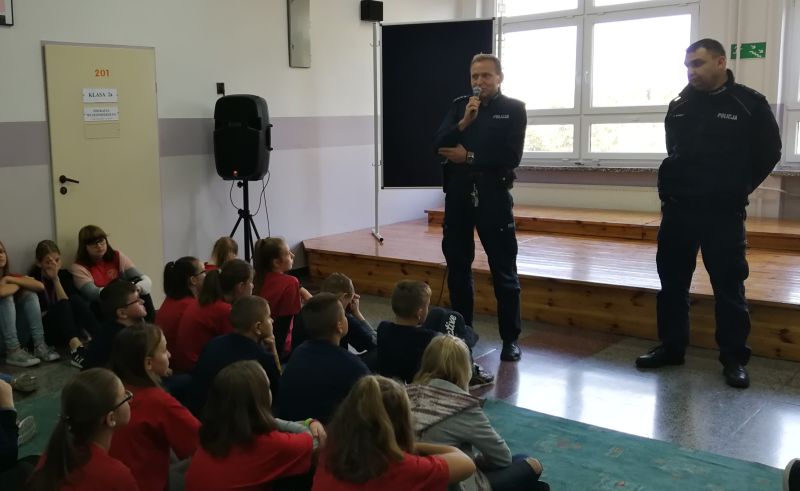 Dnia 04.10.2018 roku odwiedzili nas przedstawiciele Policji. Panowie st.asp. Mariusz Lepa i sierż.sztab. Kornel Łakomy spotkali się z uczniami wszystkich klas i przypomnieli najważniejsze informacje na temat bezpieczeństwa. Uczniowie usłyszeli w jaki sposób bezpiecznie poruszać się na drodze. Uzyskali też informacje na temat zagrożeń jakie czyhają na nich w życiu codziennym i w rzeczywistości wirtualnej.
