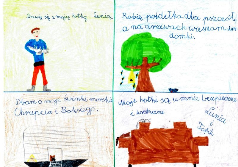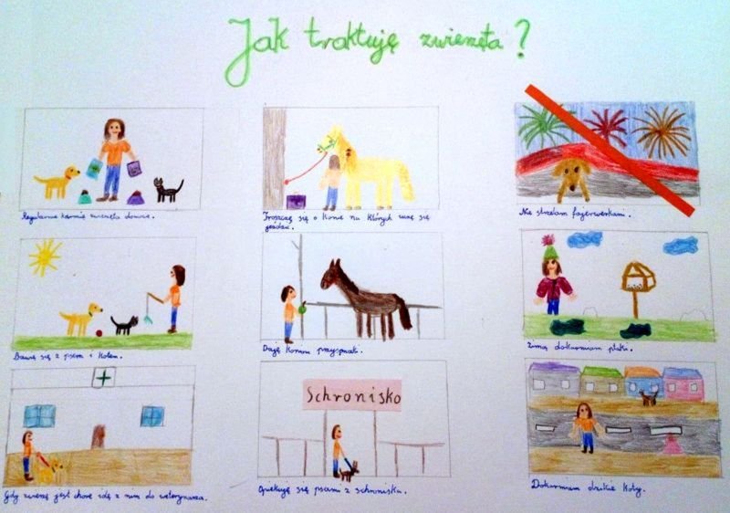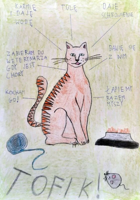 Światowy Dzień Zwierząt obchodzimy 4 października, a uczniowie naszej szkoły dbają o zwierzęta przez cały rok: troszczą się o swoich domowych pupili i nie zapominają też o psach w przytulisku, wyprowadzając je na spacery i dbając o to żeby miały co jeść. Pomimo, że ostatnie dwa tygodnie spędziliśmy w domach ucząc się zdalnie, postanowiliśmy uczcić Światowy Dzień Zwierząt konkursem plastycznym pt. „Jak traktuję zwierzęta?”. Uczniowie klas drugich, czwartych i piątej wykonali piękne prace plastyczne, na których pokazali jak dbają o swoje zwierzęta domowe oraz o zwierzęta dzikie. Rozstrzygnięcie konkursu będzie w przyszłym tygodniu. Teraz jednak zachęcamy do podziwiania prac.