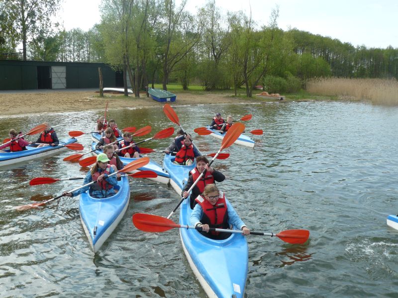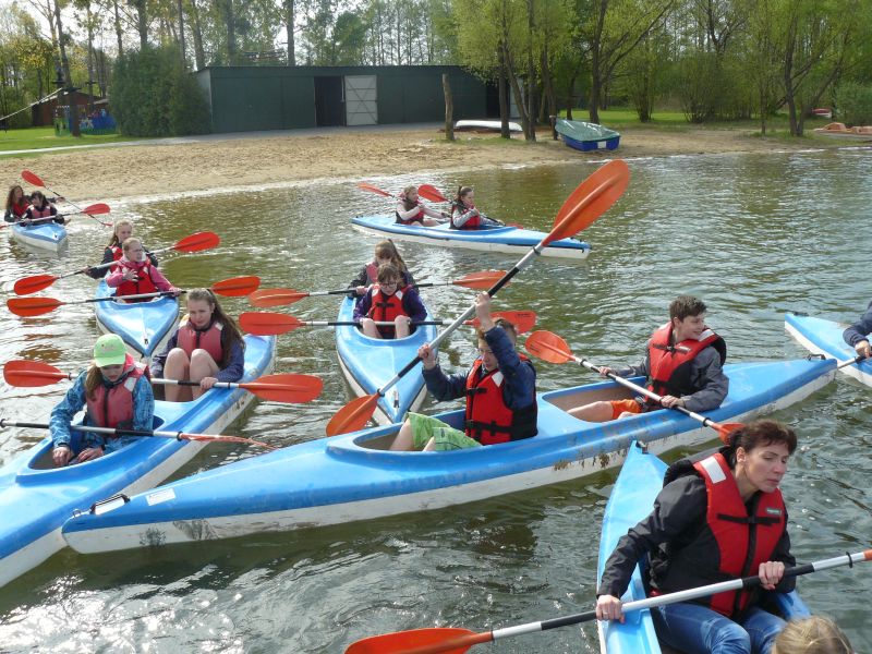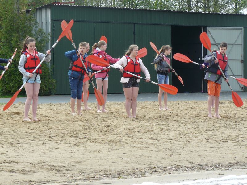 ZAJĘCIA WODNO-PLAŻOWE, czyli kajakarstwo – żadnego reżimu treningowego! Kilka słów teorii, kilka wskazówek i już wyruszyliśmy w ponad godzinny rejsik po jeziorze.
