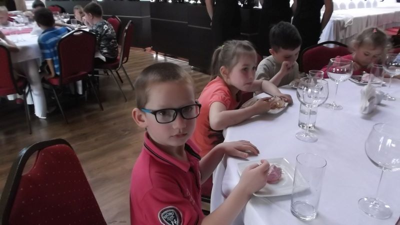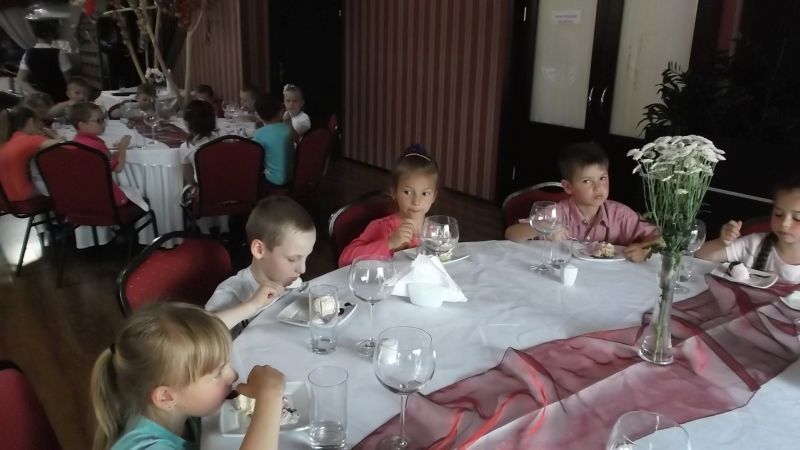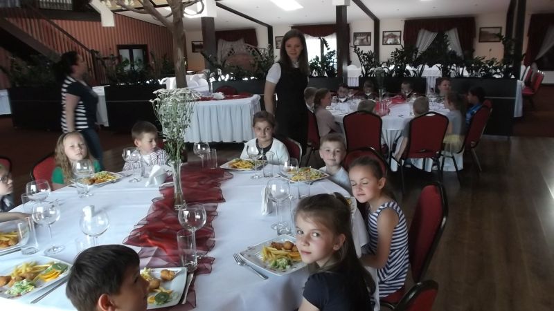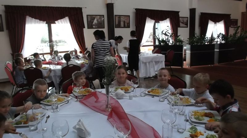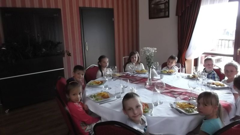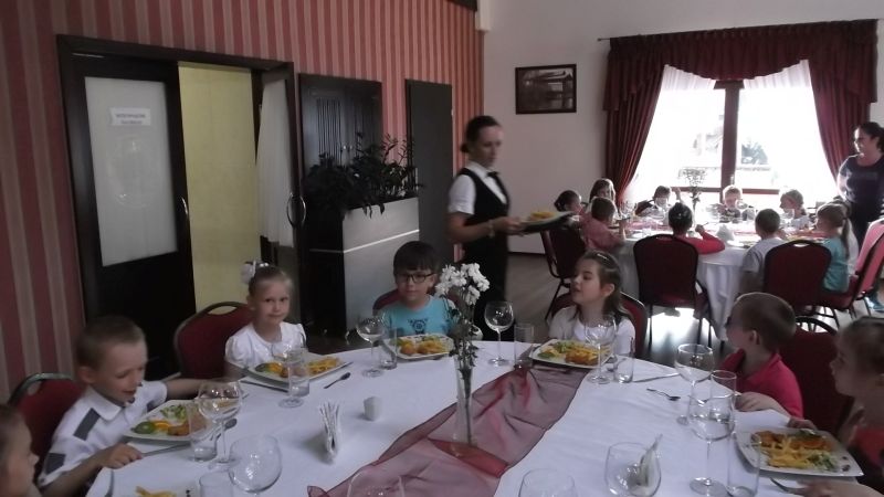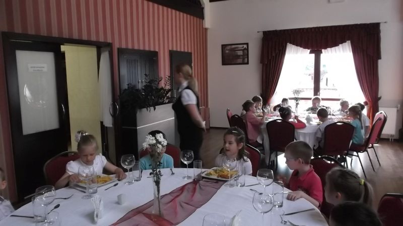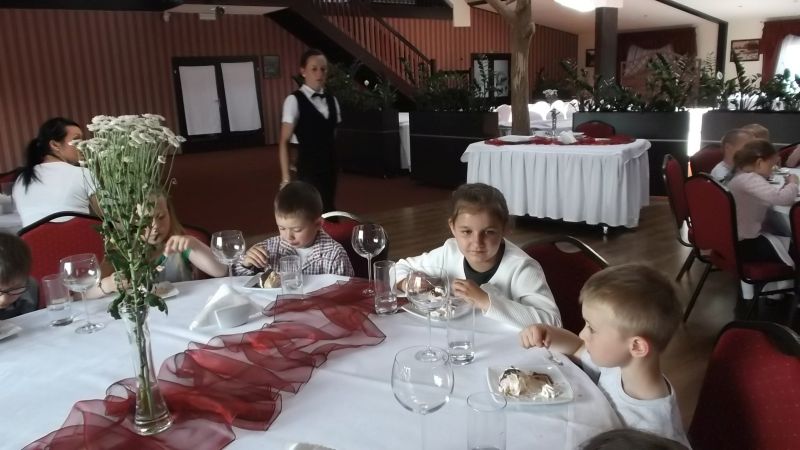 Przedszkolaki podczas wyjazdu do Kościana uczestniczyły w imprezie pt."Przyjęcie", gdzie zapoznały się z poprawnym zachowaniem  w restauracji. Uczyły się zachowania przy stole, jak zamówić jedzenie ,zawołać kelnera czy jak odkładać sztućce na talerzu.Takie nauki  na pewno na długo zostaną w pamięci dzieci i przydadzą się w przyszłości.