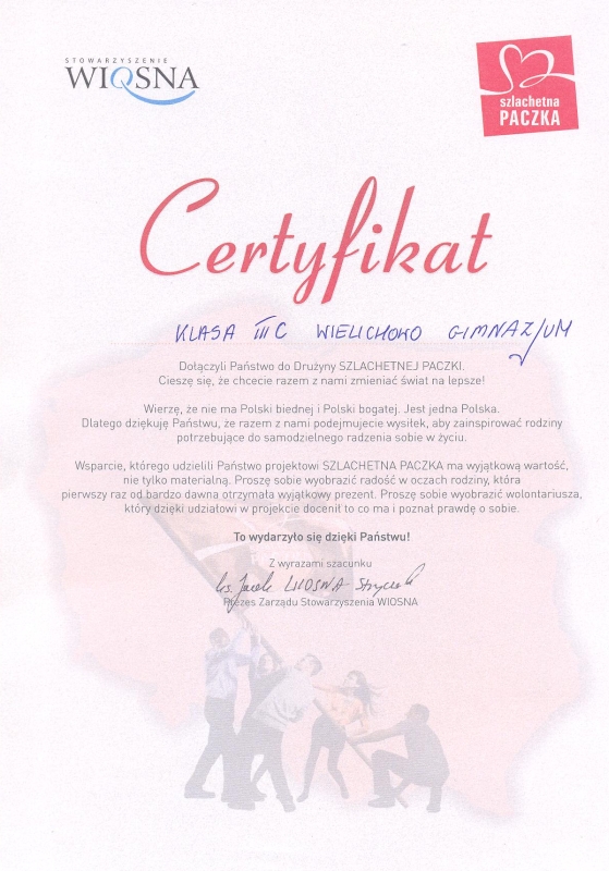 Gimnazjaliści nie brali udziału w akcji „Szlachetna paczka” dla zaszczytów, nie liczyli też na wielkie wyrazy wdzięczności, działali po prostu z potrzeby serca, w poczuciu solidarności z tymi, których los nie oszczędza. Ich gest został oczywiście ciepło przyjęty, nie tylko otrzymali oni certyfikat udziału w akcji, ale też podziękowanie własnoręcznie wykonane przez obdarowaną rodzinę. Dorośli zwykle pouczają młodzież, tym razem jednak sami powinni brać z niej przykład i pójść w jej ślady. Oby postawa wielichowskich gimnazjalistów stała się dobrym przykładem i zachętą do działania dla innych, którzy być może w przyszłym roku zechcą okazać swoje szlachetne serce i „zamknąć je w paczce”.