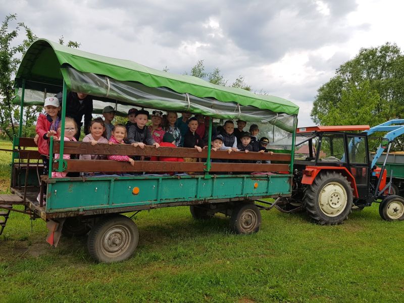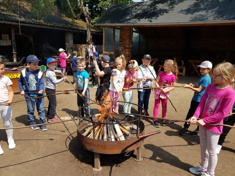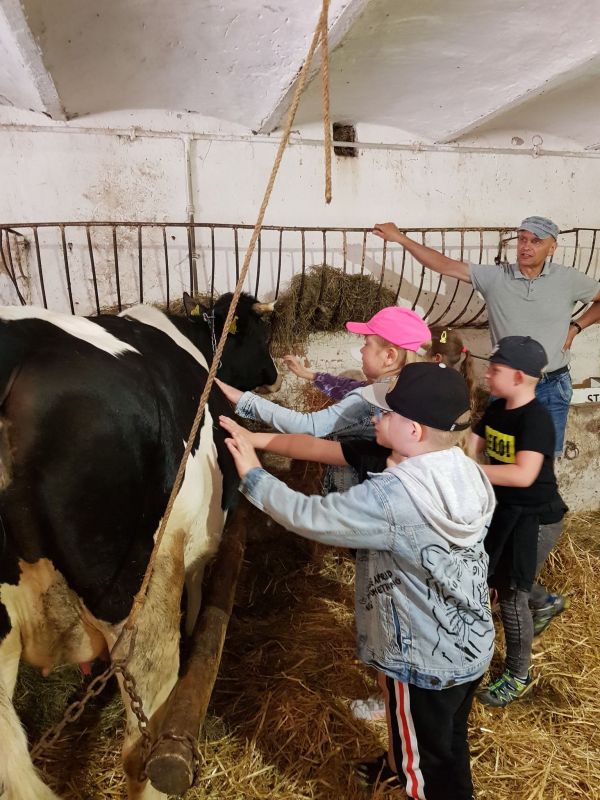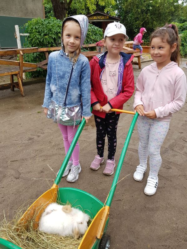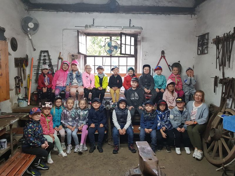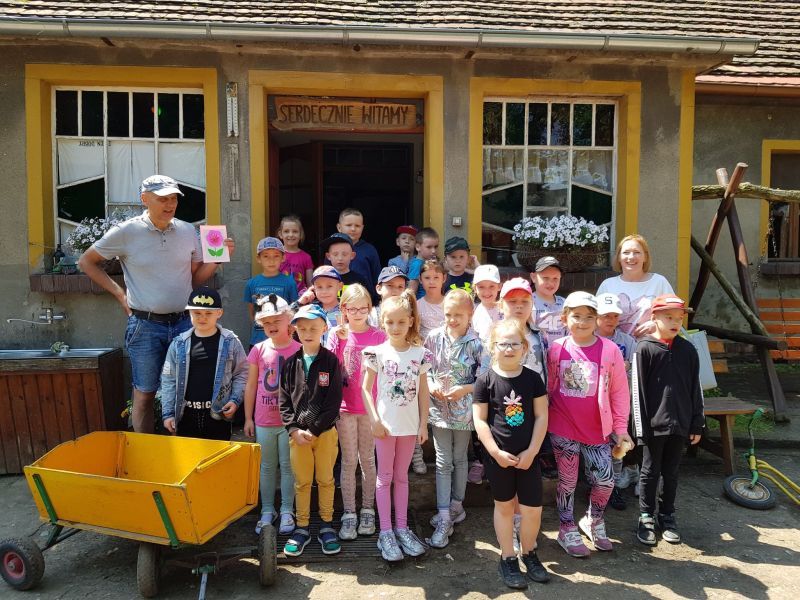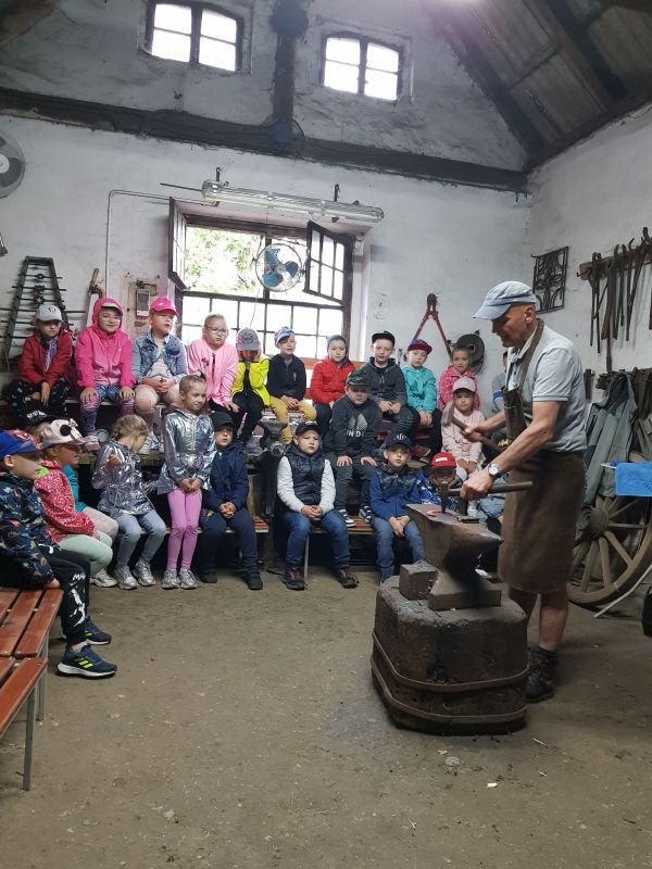 10 czerwca 2021r. grupa „Tygrysków” udała się do gospodarstwa agroturystycznego wuja Krzysia do Kluczewa. Dzieci z bliska przyglądały się pracy kowala podczas tworzenia podkowy z kawałka metalu. Na wiejskim podwórku opiekowały się królikami, obserwowały krowę i kozę. Dużo radości przyniosła wszystkim przejażdżka na przyczepie traktora oraz pobyt na placu zabaw. Gospodarz używając gwary wielkopolskiej ciekawie opowiadał o dawnych zajęciach w gospodarstwie wiejskim, pokazywał drewniane zabawki i ubrania wykonane ręcznie z owczej wełny. Z zainteresowaniem uczestnicy wycieczki obserwowali robienie świeżego masła. Nie zabrakło również smacznego poczęstunku- pysznych rogalików, a także kiełbasek pieczonych w ognisku. Dzieci wracały do domu radosne i pełne wrażeń.