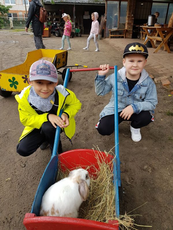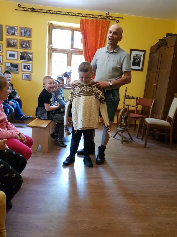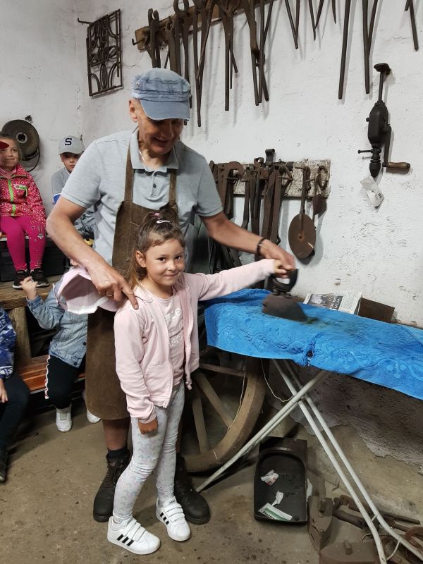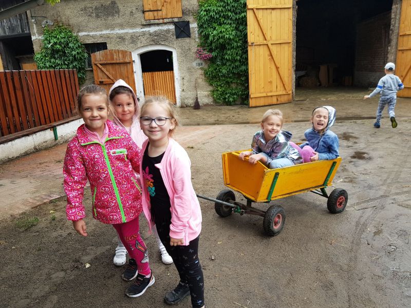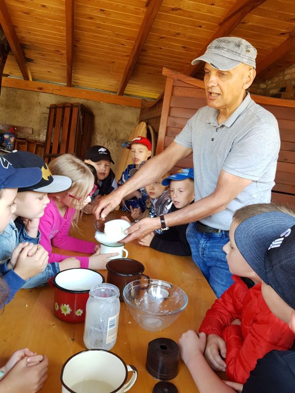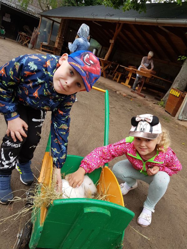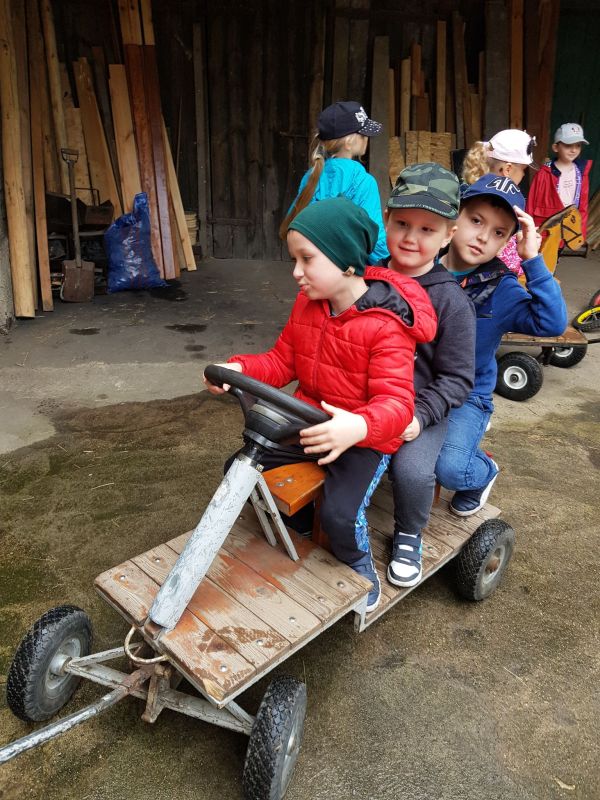 10 czerwca 2021r. grupa „Tygrysków” udała się do gospodarstwa agroturystycznego wuja Krzysia do Kluczewa. Dzieci z bliska przyglądały się pracy kowala podczas tworzenia podkowy z kawałka metalu. Na wiejskim podwórku opiekowały się królikami, obserwowały krowę i kozę. Dużo radości przyniosła wszystkim przejażdżka na przyczepie traktora oraz pobyt na placu zabaw. Gospodarz używając gwary wielkopolskiej ciekawie opowiadał o dawnych zajęciach w gospodarstwie wiejskim, pokazywał drewniane zabawki i ubrania wykonane ręcznie z owczej wełny. Z zainteresowaniem uczestnicy wycieczki obserwowali robienie świeżego masła. Nie zabrakło również smacznego poczęstunku- pysznych rogalików, a także kiełbasek pieczonych w ognisku. Dzieci wracały do domu radosne i pełne wrażeń.