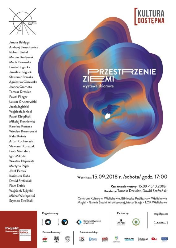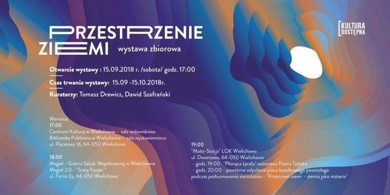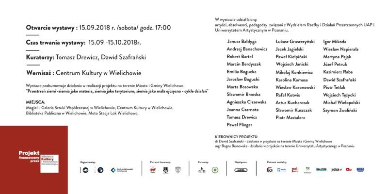 Janusz Bałdyga, Andrzej Banachowicz, Robert Bartel, Marcin Berdyszak, Marta Bosowska, Emilia Bogucka, Jarosław Bogucki, Sławomir Brzoska, Agnieszka Ciszewska, Joanna Czarnota, Tomasz Drewicz, Paweł Flieger, Łukasz Gruszczyński, Jacek Jagielski, Wojciech Janicki, Paweł Kiełpiński, Mikołaj Konkiewicz, Karolina Komasa, Wiesław Koronowski, Rafał Kotwis, Artur Kucharczak, Sławomir Kuszczak, Piotr Mastalerz, Igor Mikoda, Wiesław Napierała, Martyna Pająk, Józef Petruk, Kazimierz Raba, Dawid Szafrański, Piotr Tetlak, Wojciech Tężycki, Michał Wielopolski, Szymon Zwoliński. Miejsca: Centrum Kultury w Wielichowie - godz. 17:00 Biblioteka Publiczna w Wielichowie Magiel - Galeria Sztuki Współczesnej w Wielichowie - godz. 18:00 Magiel 2.0 - "Stary fryzjer" Moto-Stacja -LOK Wielichowo - godz. 19:00 Czas trwania wystawy: 15.09 -15.10.2018r. Wystawa jest podsumowaniem realizacji poszczególnych etapów projektu z programu MKIDN "Kultura Dostępna 2018 - "Przestrzeń ziemi -ziemia jako materia, ziemia jako terytorium, ziemia jako mała ojczyzna - cykle działań" - na terenie Miasta i Gminy Wielichowo. Na wystawie zostaną zaprezentowane prace zaproszonych artystów, dokumentacje wideo, prace uczestników poszczególnych warsztatów i działań w projekcie. Harmonogram zaplanowanych działań w dniu otwarcia wystawy - 15.09.2018r. /sobota/ Wernisaż 17:00 Centrum Kultury w Wielichowie - sala widowiskowa Biblioteka Publiczna w Wielichowie - sala wystawiennicza ul. Pocztowa 16, 64-050 Wielichowo 18:00 Magiel - Galeria Sztuki Współczesnej w Wielichowie Magiel 2.0 - "Stary fryzjer " ul. Farna 2a, 64-050 Wielichowo 19:00 Moto-Stacja - LOK Wielichowo ul. Dworcowa, 64-050 Wielichowo - godz. 19:00- "Płonąca żyrafa" autorstwa Piotra Tetlaka - godz. 20:00 - powtórne odpalenie pieca butelkowego powstałego podczas podsumowania warsztatów - "Przestrzeń ziemi - ziemia jako materia" Kierownicy projektu: dr Dawid Szafrański - działania w projekcie na terenie Miasta i Gminy Wielichowo mgr Bogna Branowska - działania w projekcie na terenie Uniwersytetu Artystycznego w Poznaniu