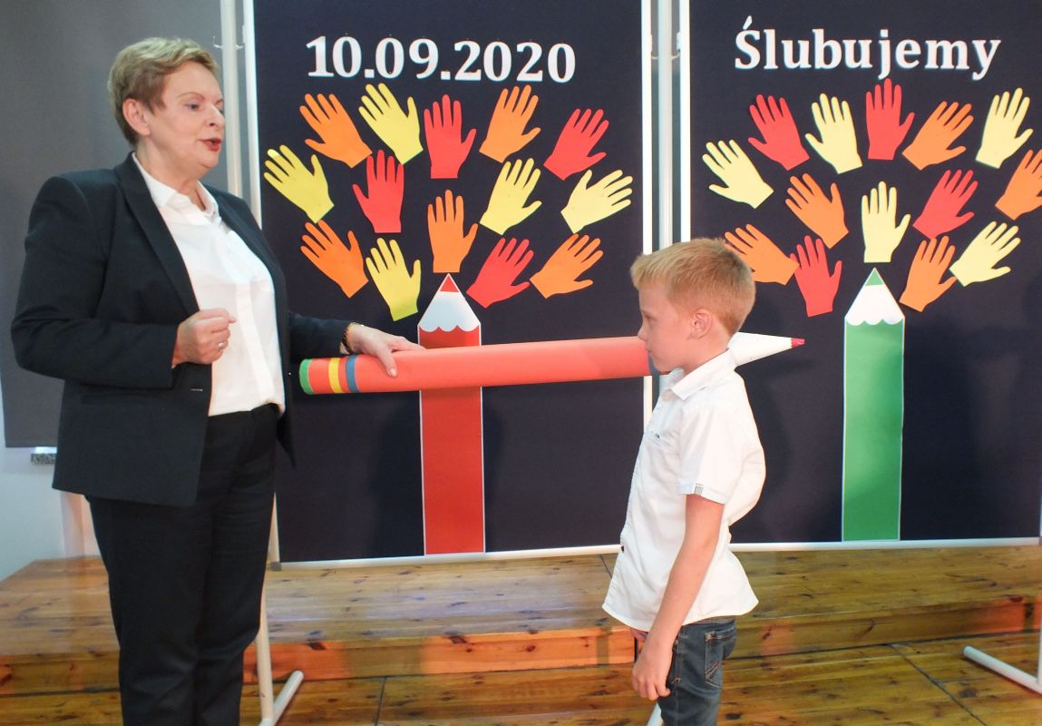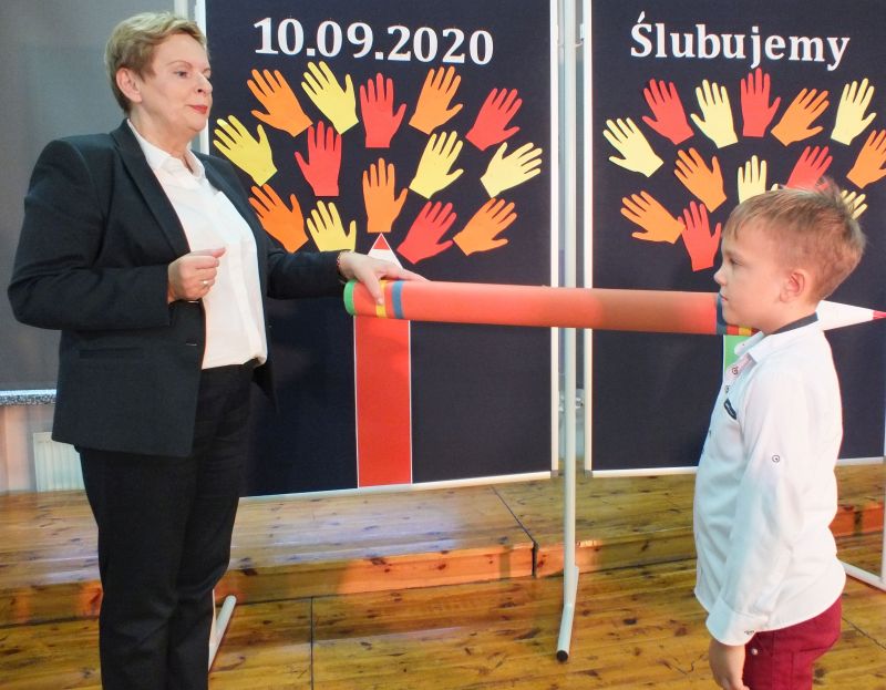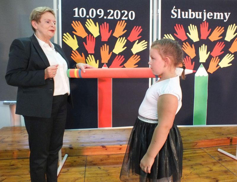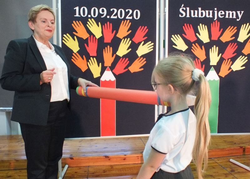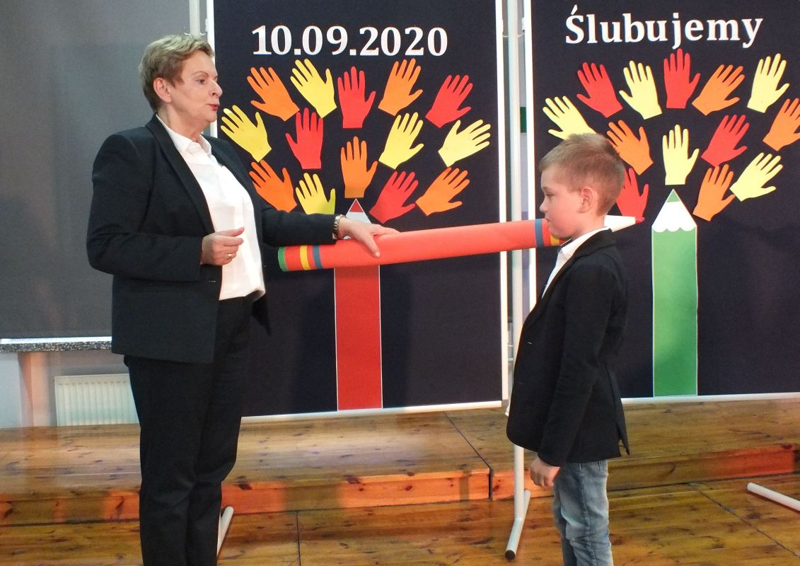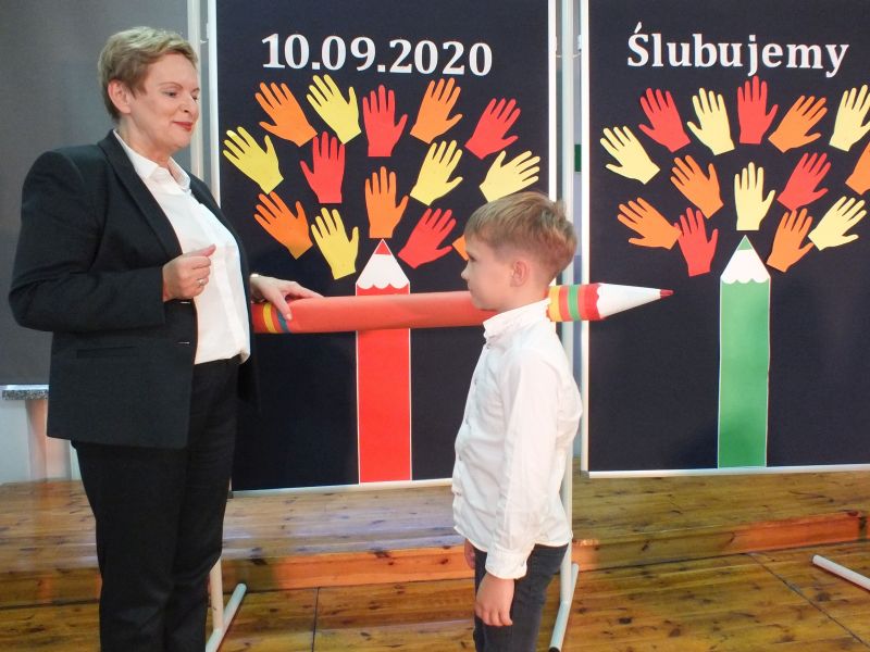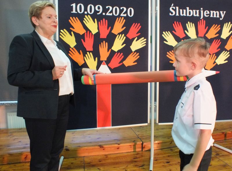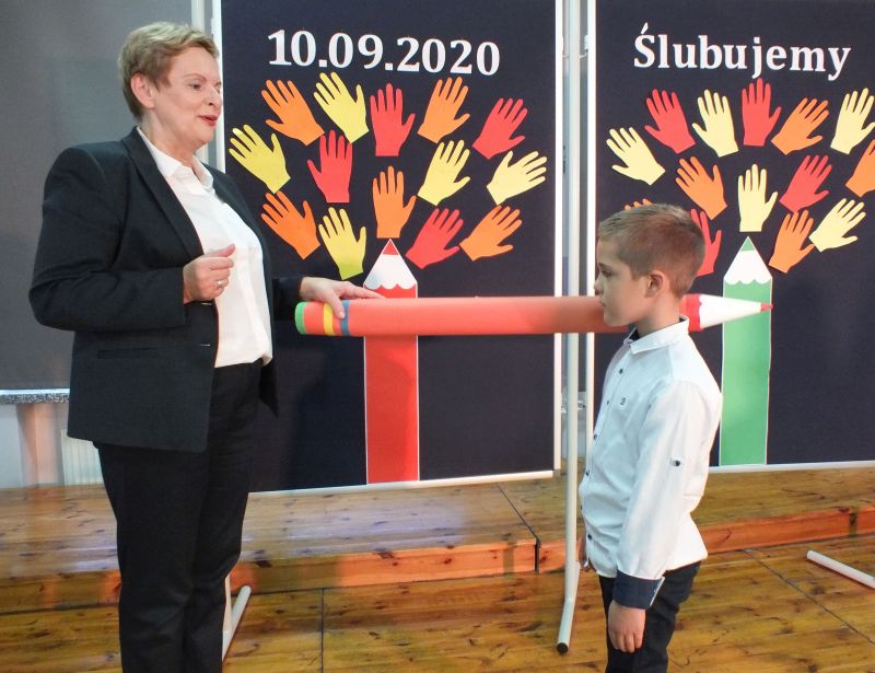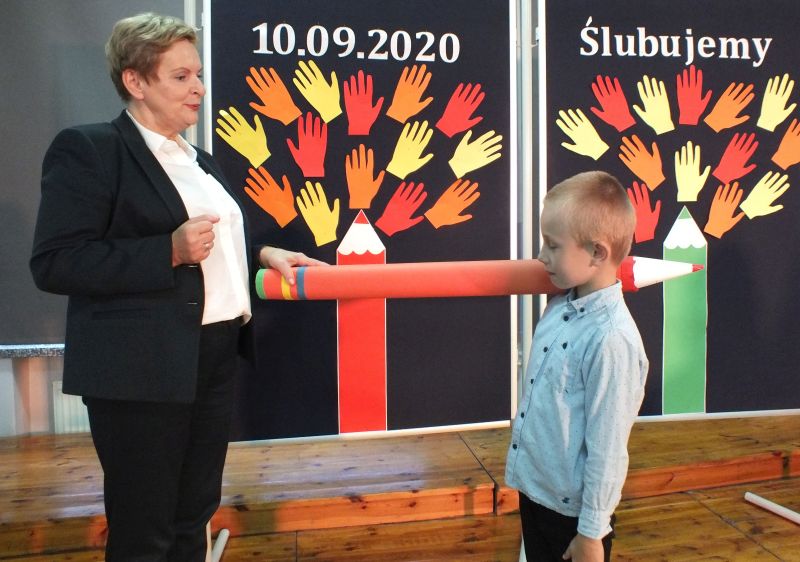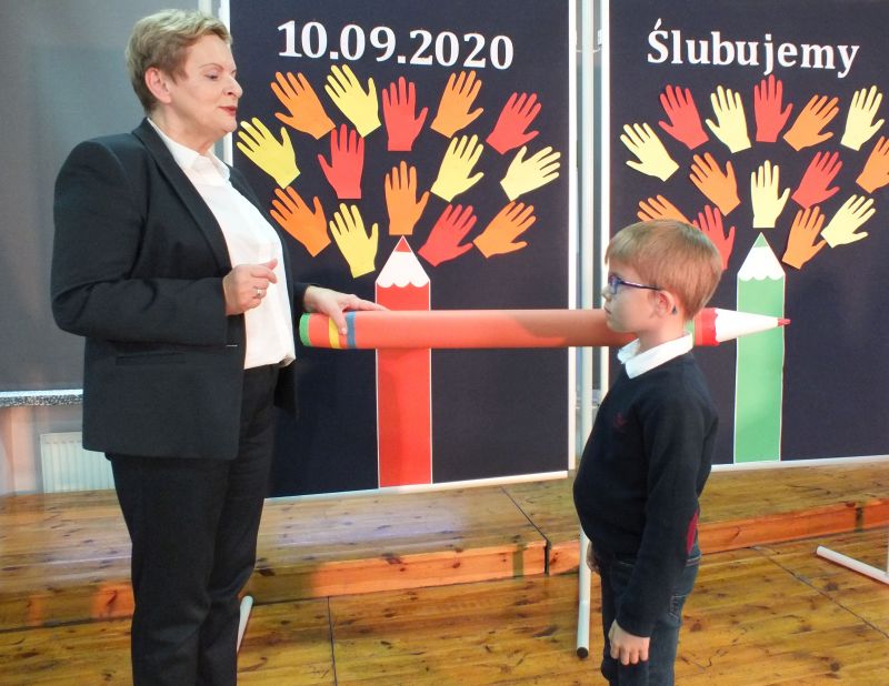 Podniosłym momentem był też obrzęd pasowania na ucznia, którego dokonała pani dyrektor, symbolicznie dotykając ramienia dużym ołówkiem.