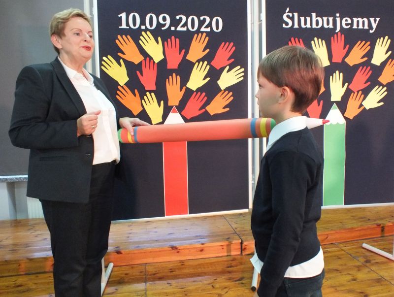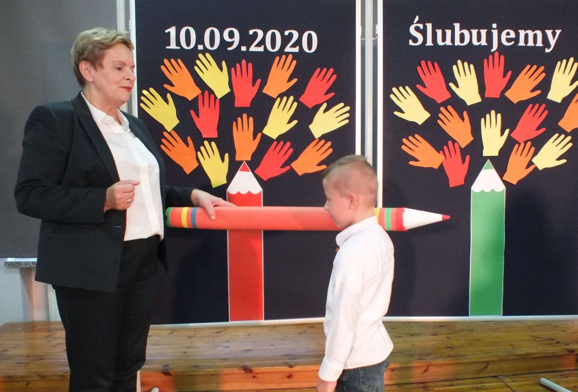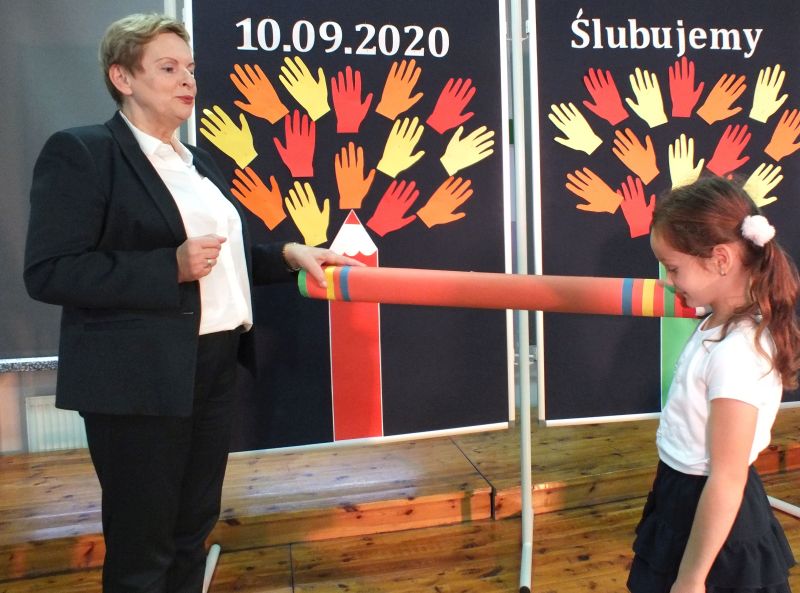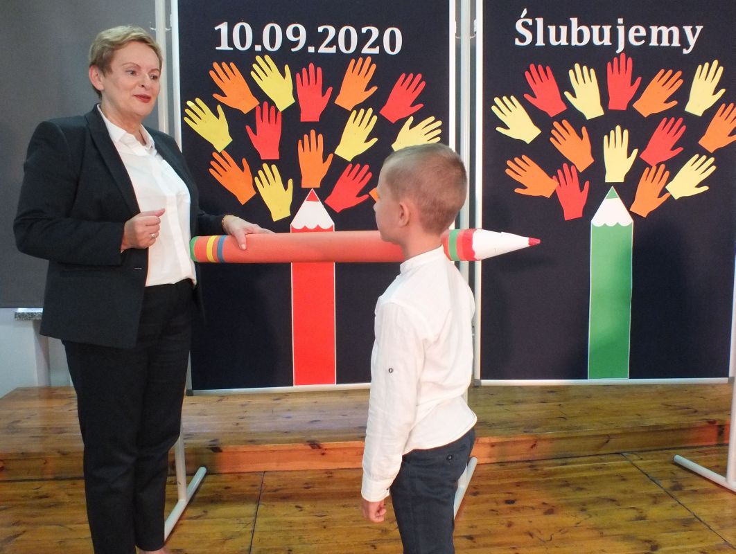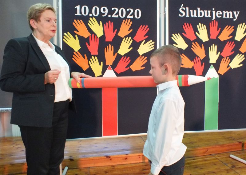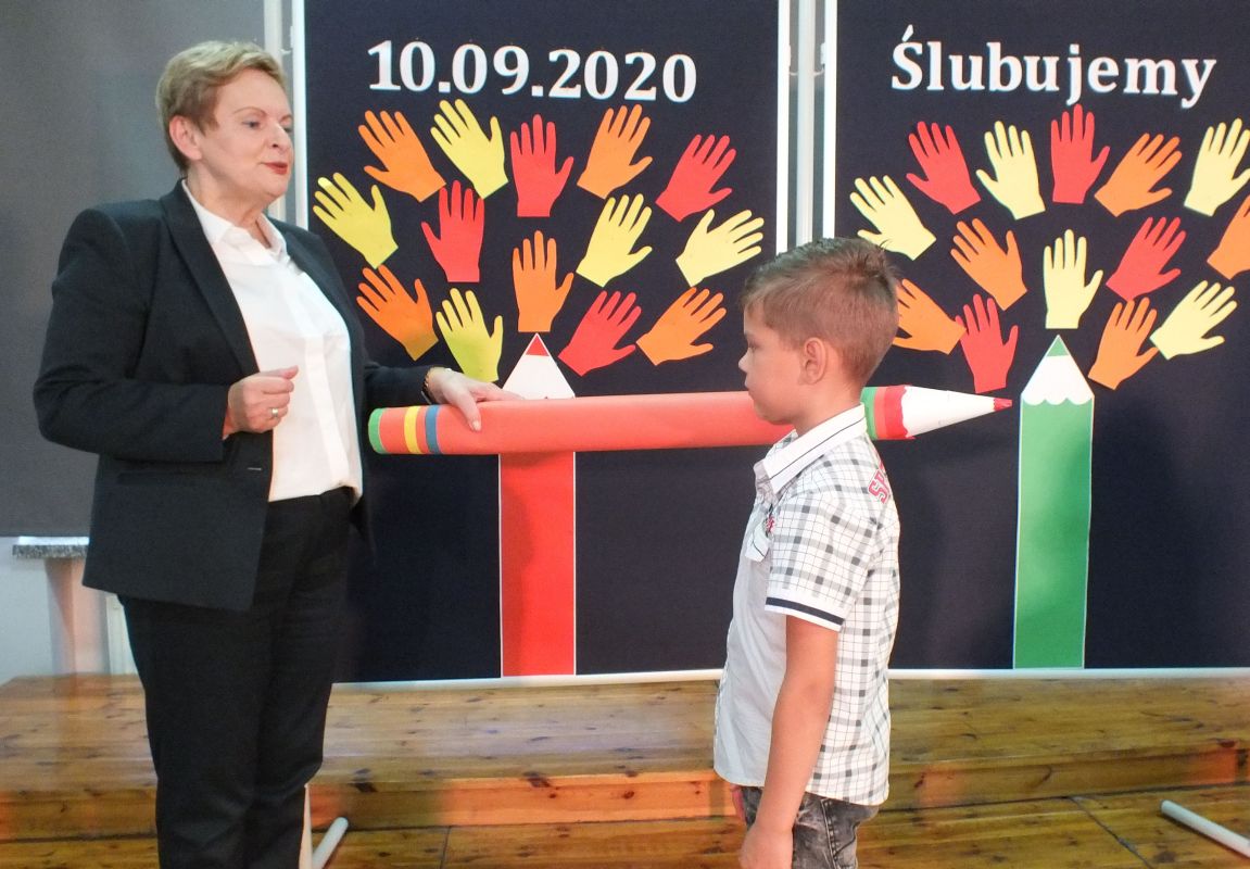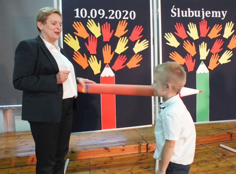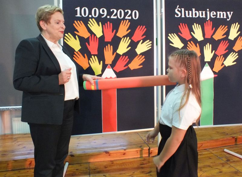 Podniosłym momentem był też obrzęd pasowania na ucznia, którego dokonała pani dyrektor, symbolicznie dotykając ramienia dużym ołówkiem.