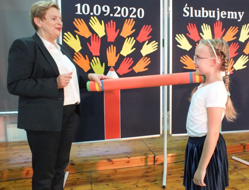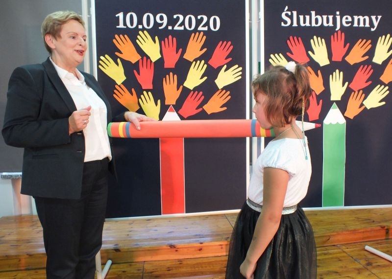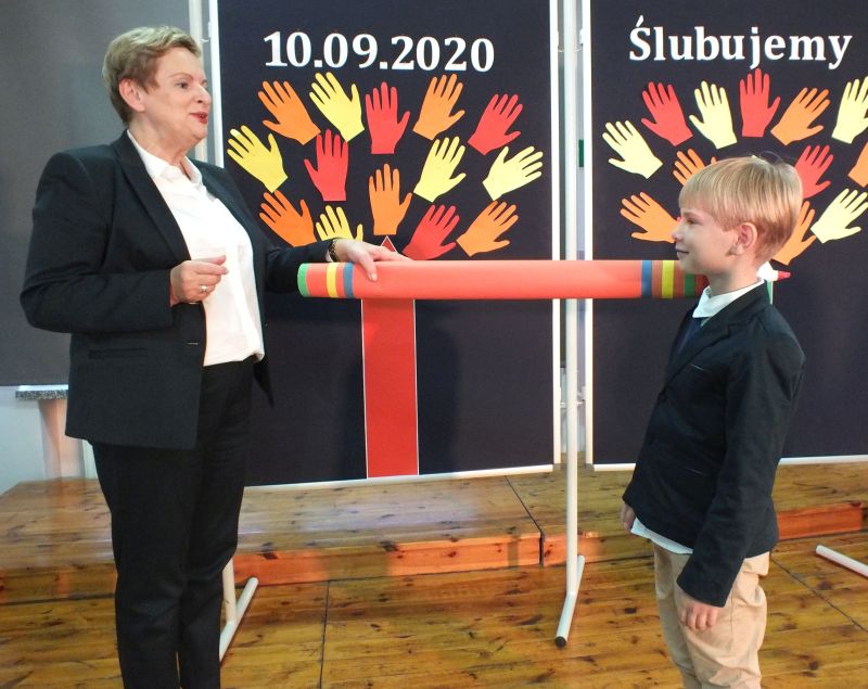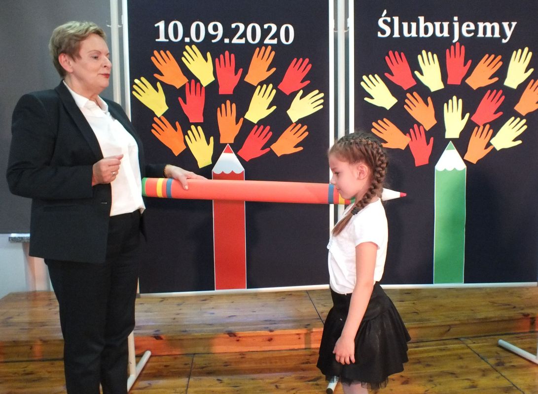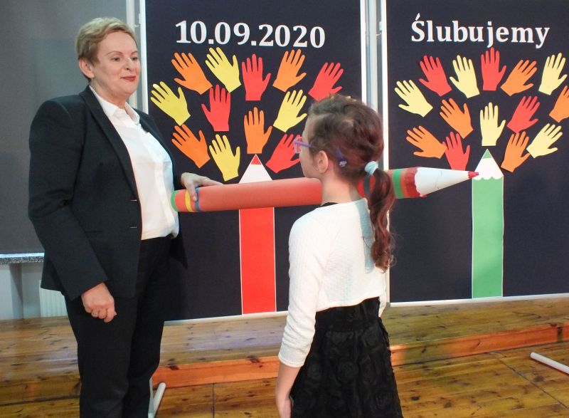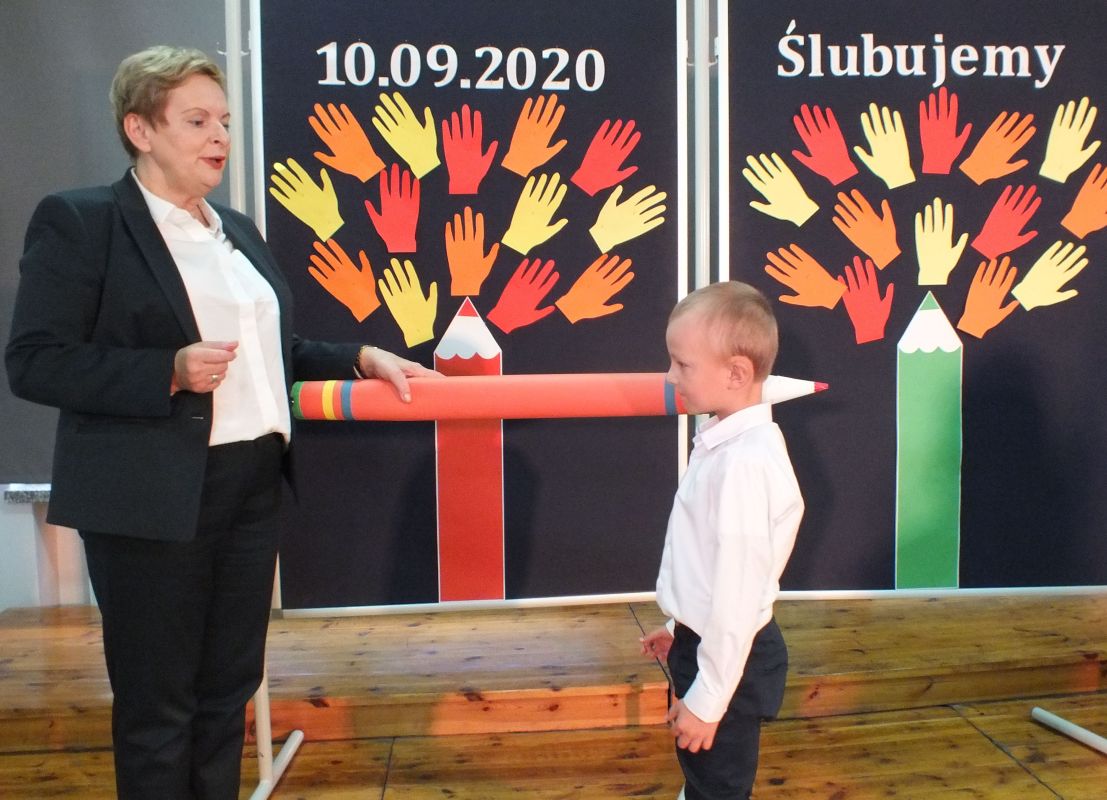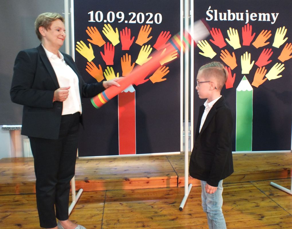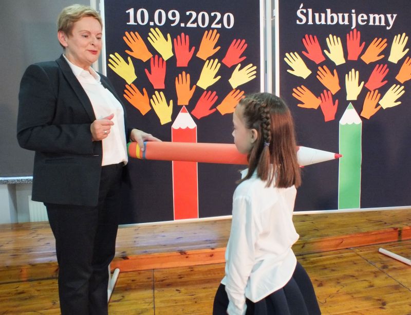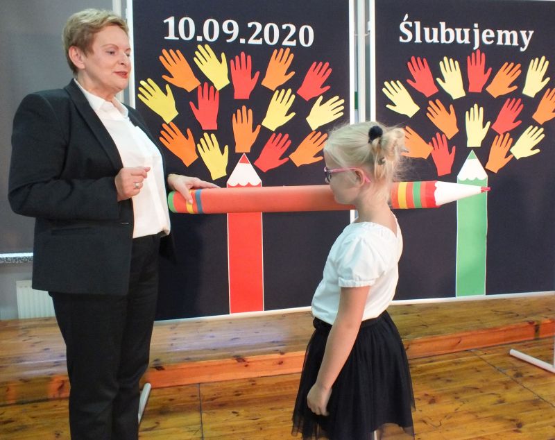 Podniosłym momentem był też obrzęd pasowania na ucznia, którego dokonała pani dyrektor, symbolicznie dotykając ramienia dużym ołówkiem.