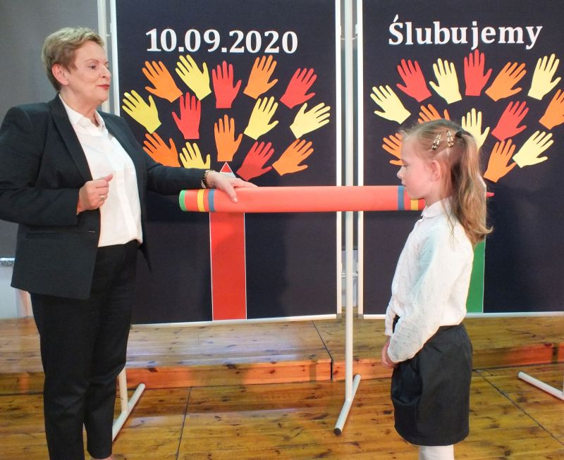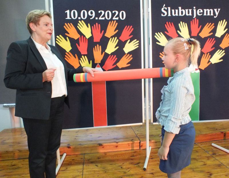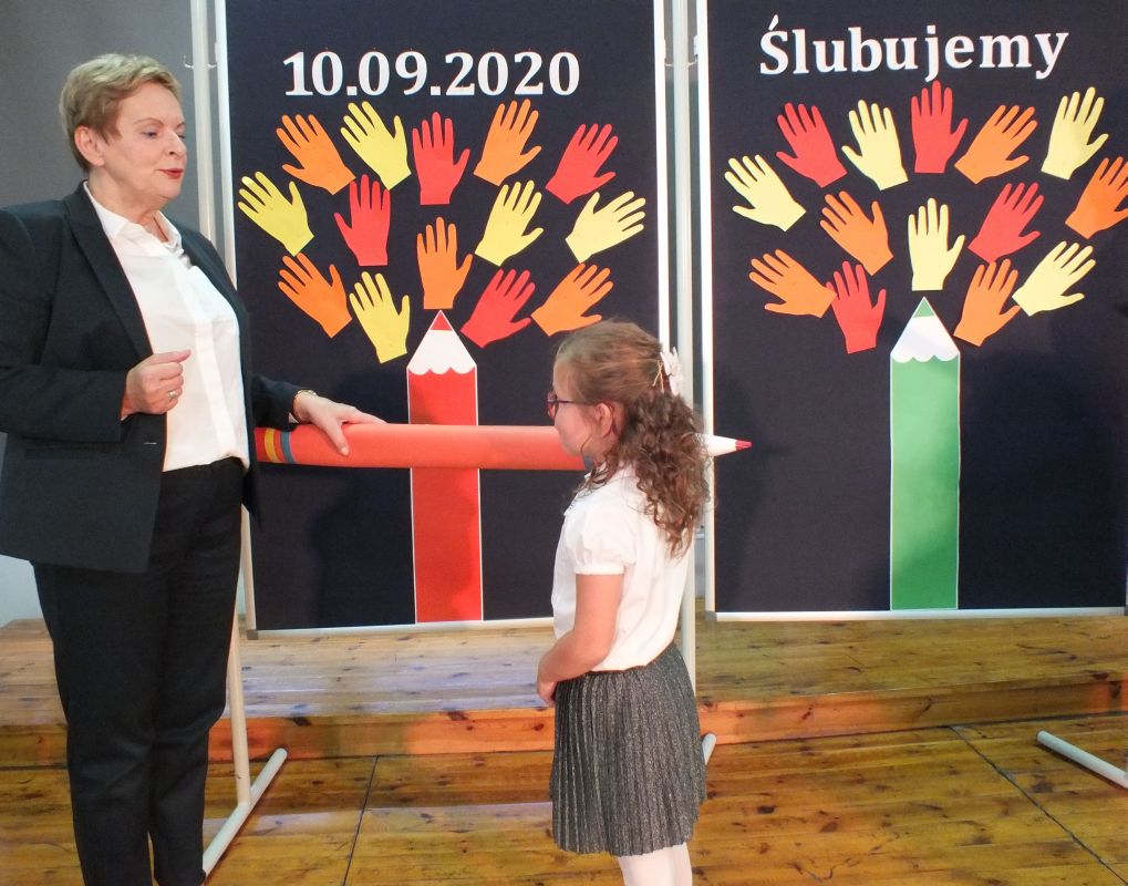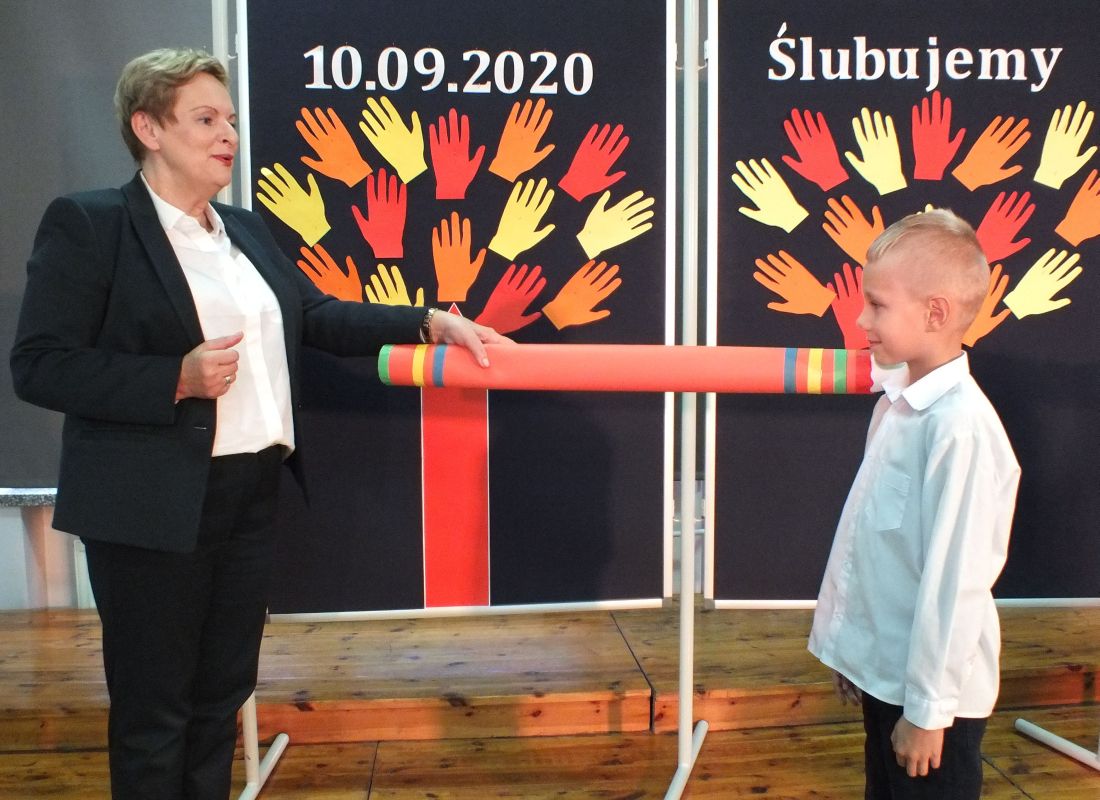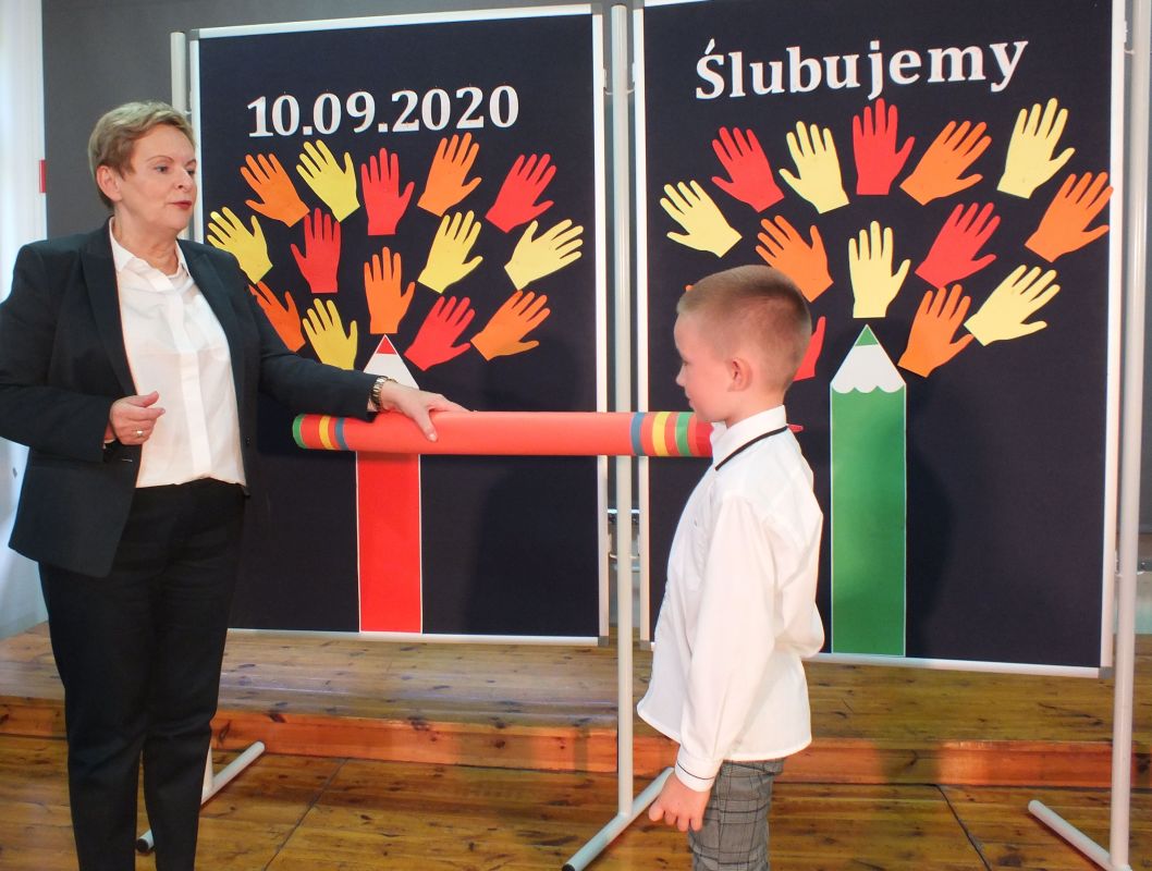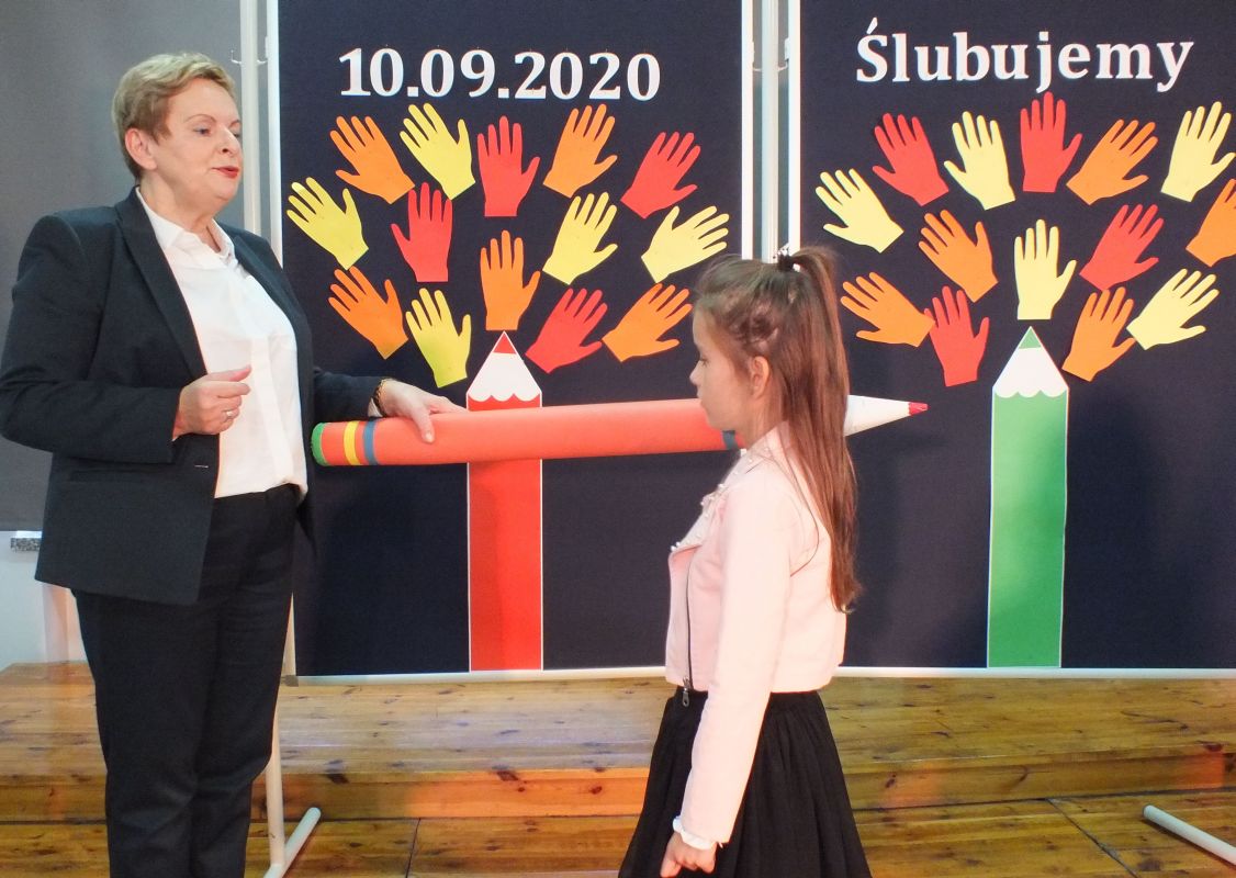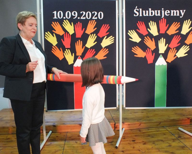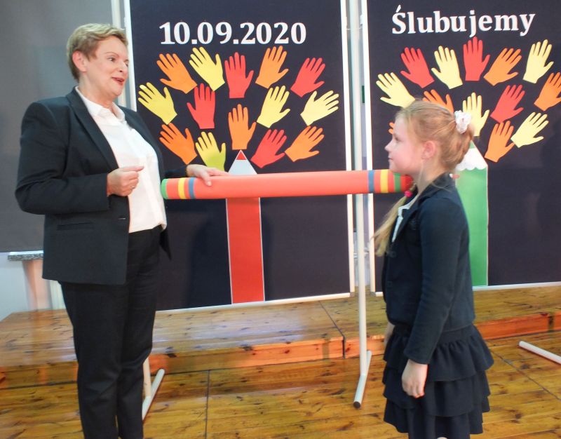 Podniosłym momentem był też obrzęd pasowania na ucznia, którego dokonała pani dyrektor, symbolicznie dotykając ramienia dużym ołówkiem.
