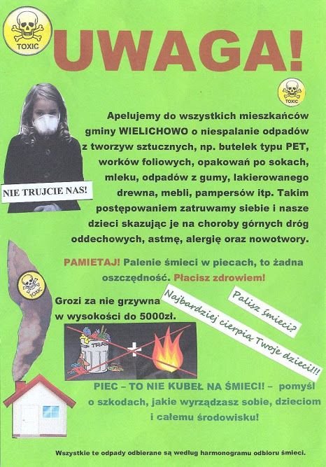 W październiku rozpoczął się sezon grzewczy, dlatego uczniowie Zespołu Szkół im. Polskich Noblistów w Wielichowie odwiedzają mieszkańców Wielichowa i proszą o nie palenie śmieci w piecach przydomowych oraz rozdają ulotki informacyjne przygotowane wiosną w ramach konkursu gminnego na ulotkę promującą niepalenie śmieci pt. „Nie pal śmieci – dbaj o zdrowie dzieci”. Rozdawane ulotki są autorstwa Kingi Krawczyk, uczennicy klasy 6a szkoły podstawowej oraz Huberta Przydróżnego, ucznia klasy 3d gimnazjum. W najbliższych tygodniach można spodziewać się wizyty uczniów na kolejnych ulicach Wielichowa.