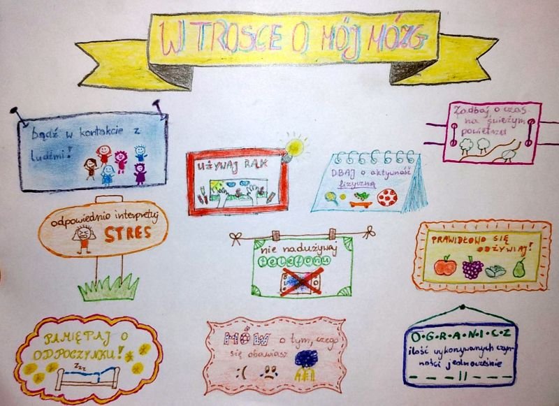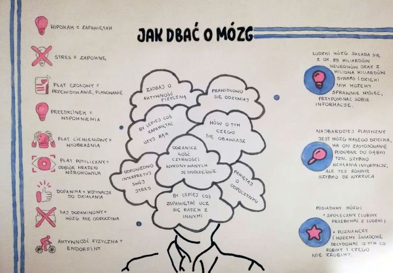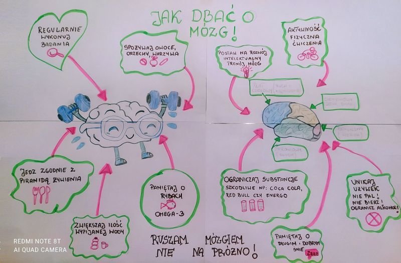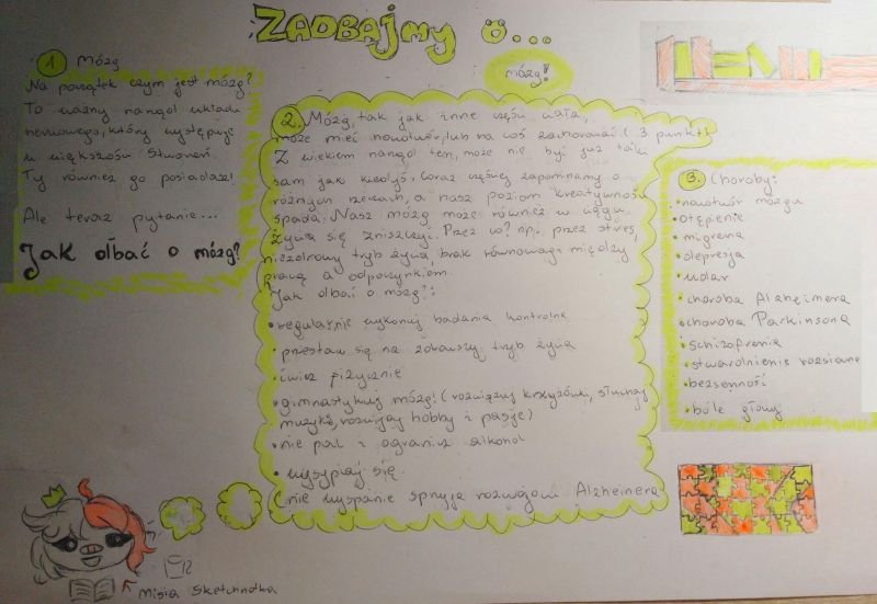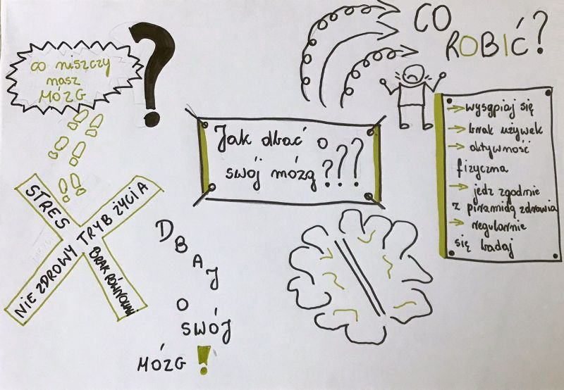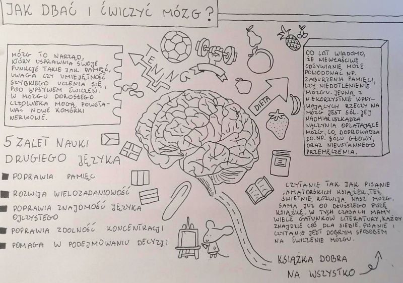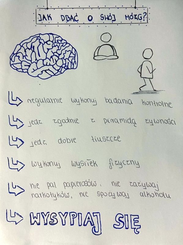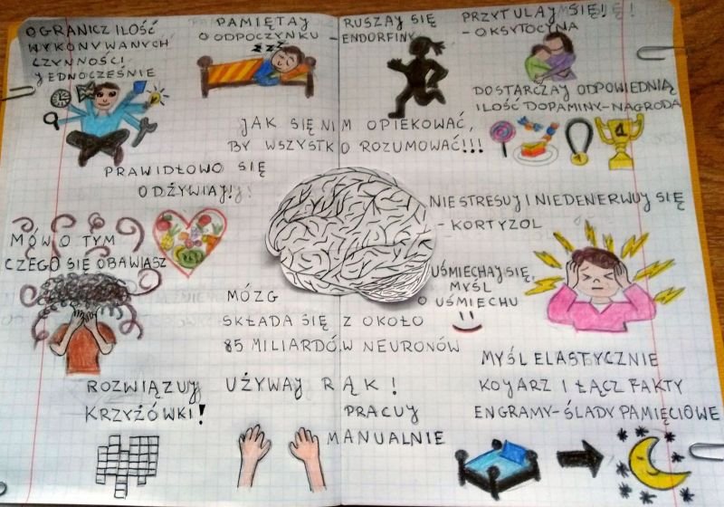 Światowy Tydzień Mózgu obchodzony w marcu to chwila refleksji dla każdego z nas. Zadajemy sobie pytanie- Jak działa mózg człowieka? Na czym polega higiena tego jakże ważnego narządu. Uczniów klas siódmych i ósmych mieli okazję uczestniczyć podczas lekcji biologii w webinarze zorganizowanym przez dr Adrianę Kłoskowską  „Czym karmić mózg?” i na podstawie jej warsztatu wykonali ciekawe sketchnotki na temat: W trosce o mój mózg… .
