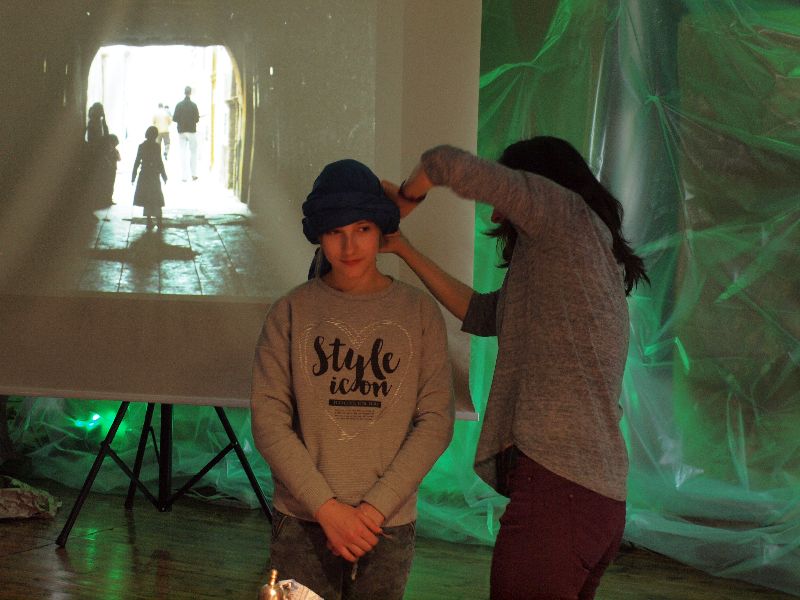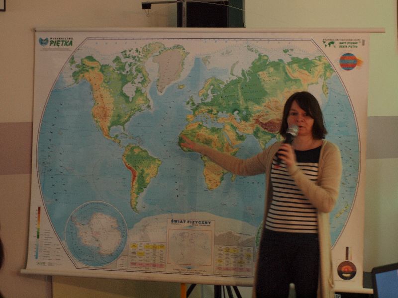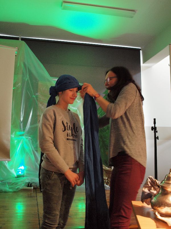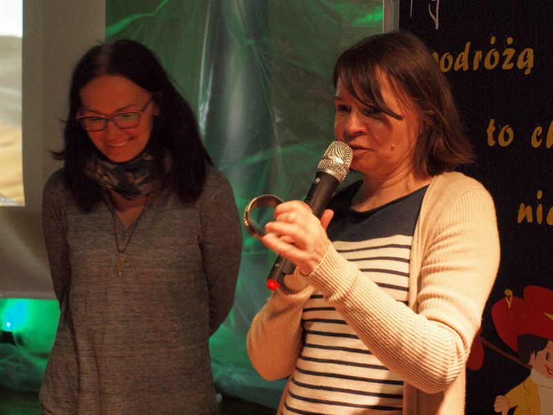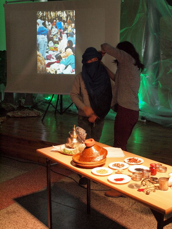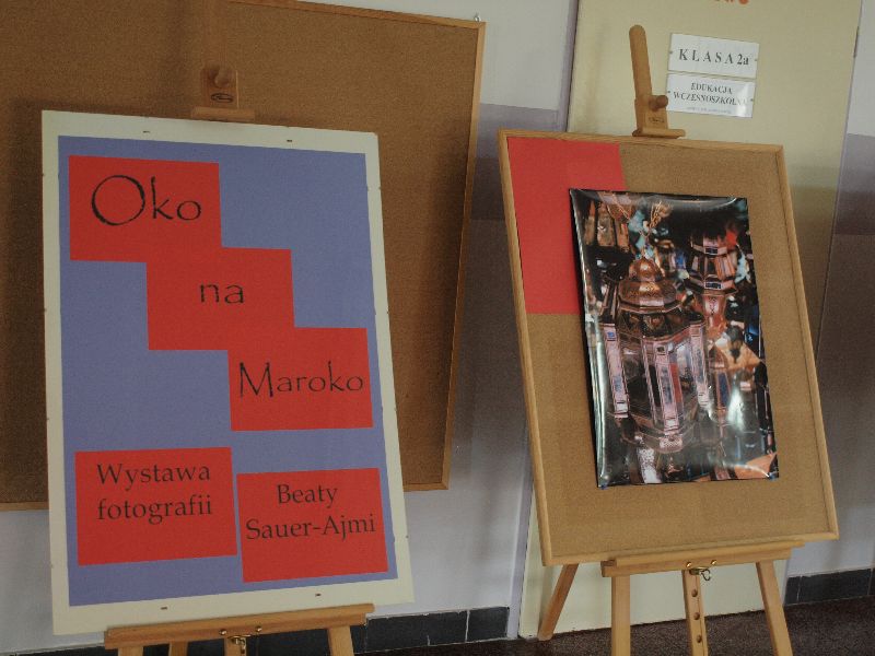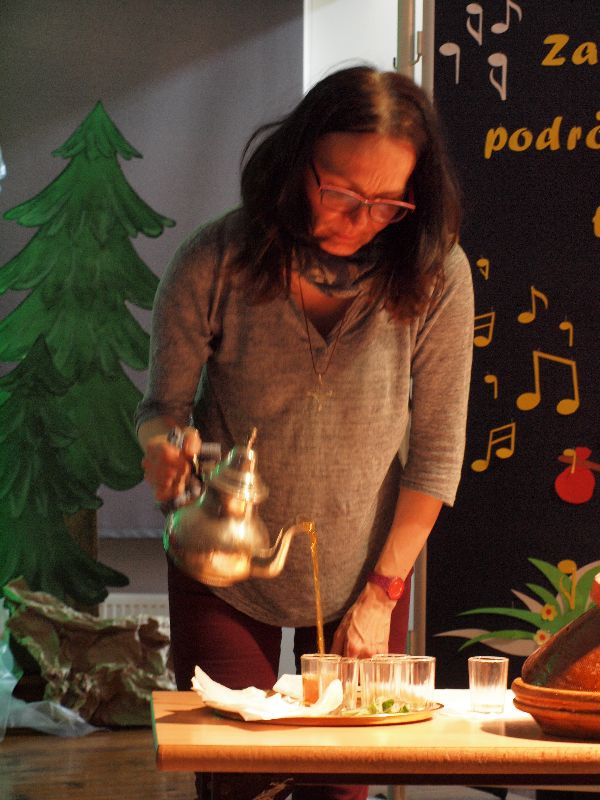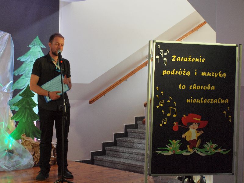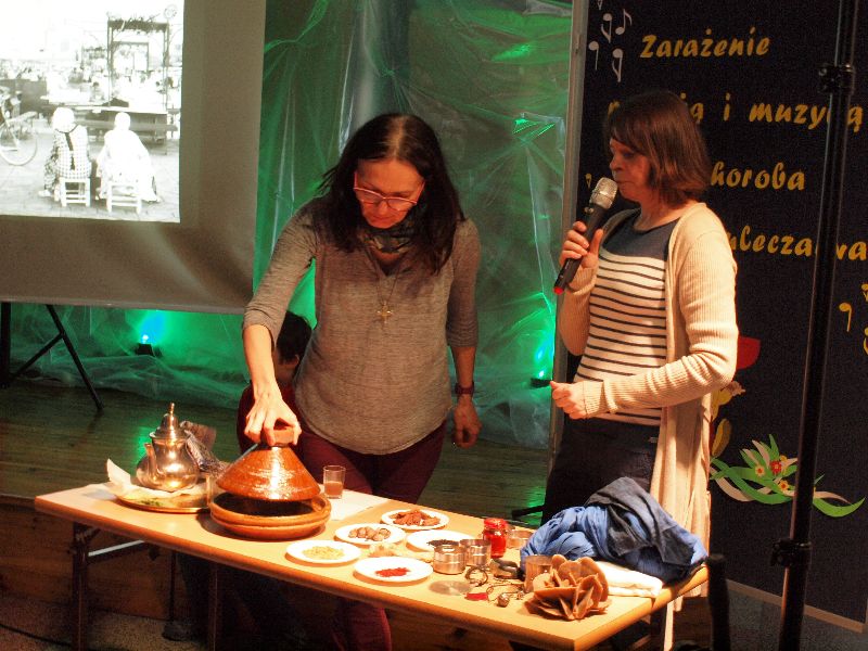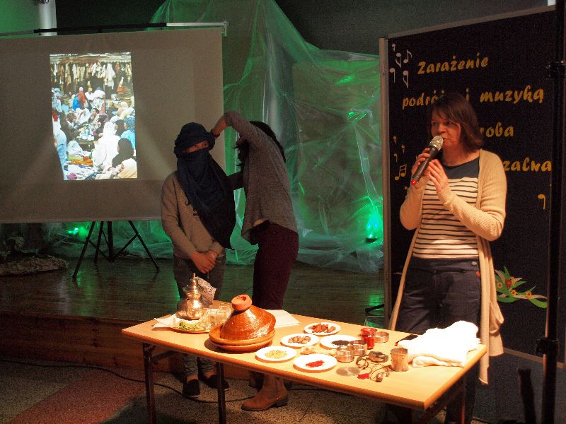 Nowością tegorocznej edycji „Melodyi Włóczykija” było spotkanie z podróżnikiem. Jego uczestnicy mogli przez chwilę obcować z turystyką niezwykle egzotyczną, przez co bardzo interesującą i intrygującą. Do Maroka przenieśli się oni wraz z Beatą Sauer-Ajmi oraz Anetą Kędzią. Obie panie nie tylko opowiadały o kulturze i codziennym życiu w kraju, który pełen jest sprzeczności, ale też postanowiły przybliżyć go zebranym niemal namacalnie. Nie tylko można było obejrzeć pokaz wiązania turbanu, posłuchać charakterystycznej arabskiej muzyki, ale też dotknąć róży pustyni i powąchać różnorodnych przypraw. Większość pań szczególnie zainteresowana była oryginalną biżuterią, jak również naczyniem, w którym nawet we własnym domu przygotowywać można orientalne dania. Spotkaniu z podróżnikiem towarzyszyła wystawa fotografii autorstwa B.Sauer-Ajmi, którą jeszcze przez jakiś czas oglądać będzie można na I piętrze w budynku gimnazjum.
