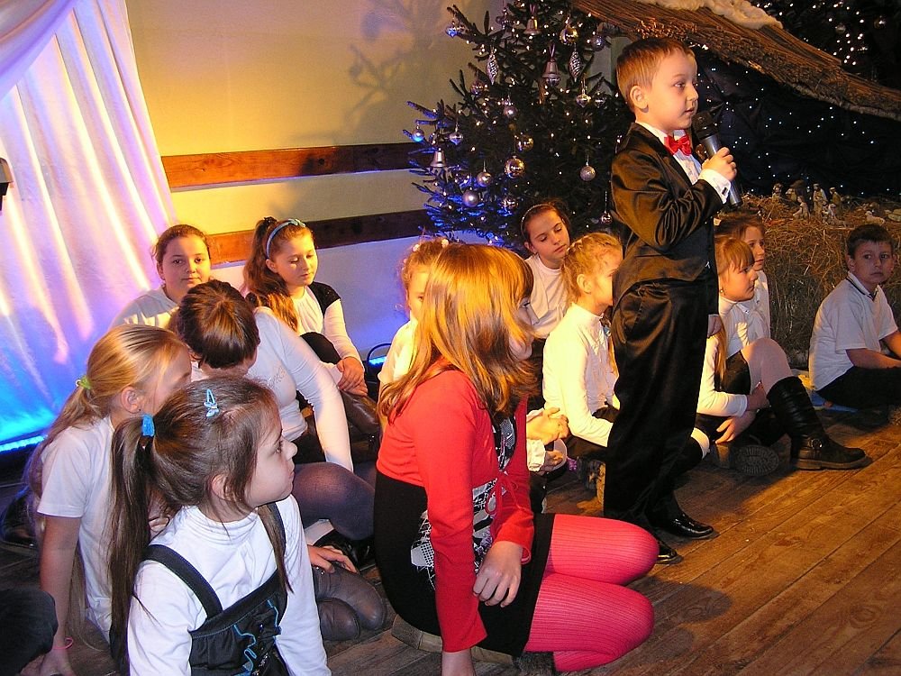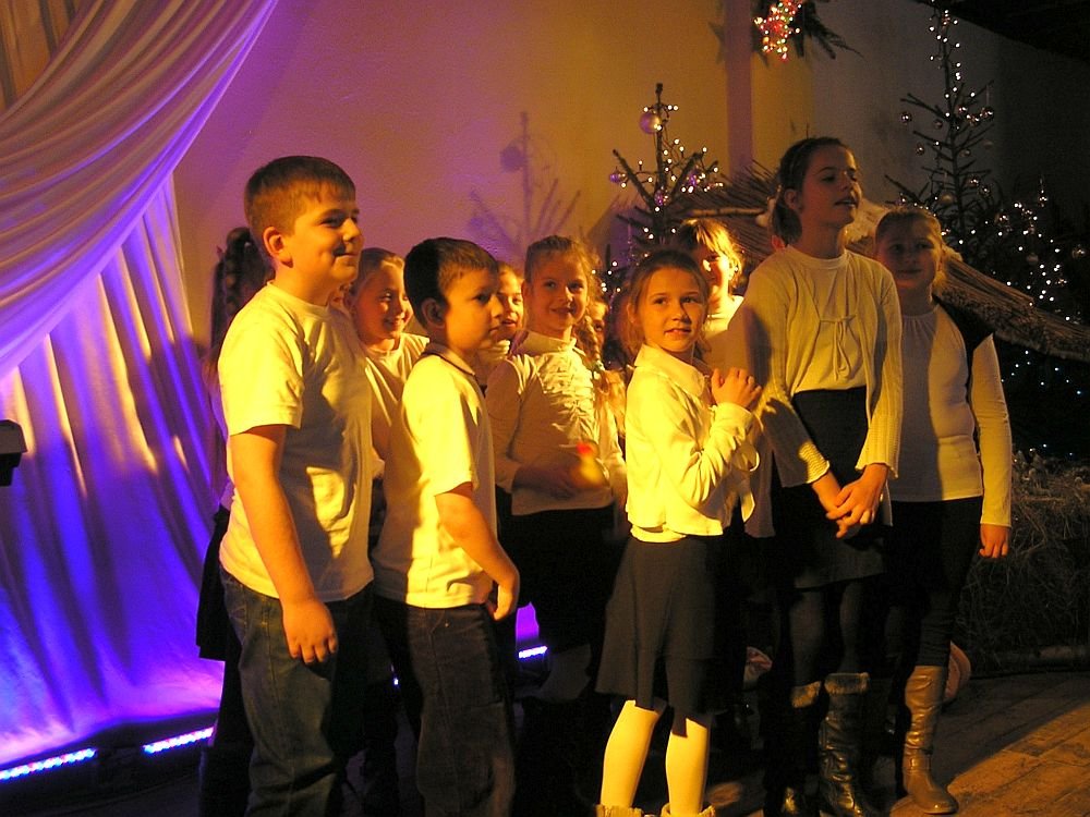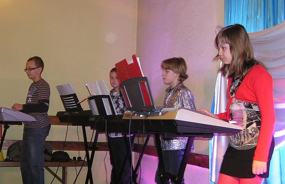 Młodzi wokaliści świetnie bawili się na scenie. Chór gimnazjalny oraz Chórek Wesołych Chmurek połączyli swoje siły w trakcie koncertu. Gimnazjalistki śpiewają coraz ambitniejszy repertuar. Najmłodszym wykonawcą był Kamil Koska z Kamieńca. Keyboardziści: (od lewej) Piotr Leśniczak, Mirosław Janowski, Jakub Michalski i Nikola Koska towarzyszyli wokalistom.