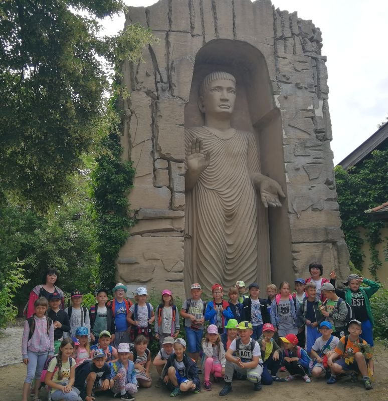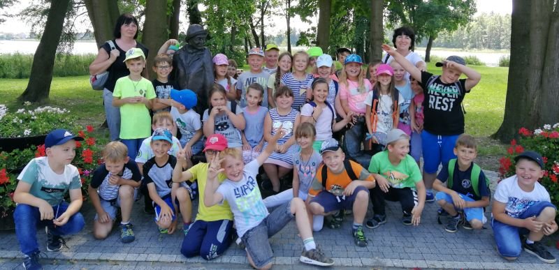 Dnia 12 czerwca 2018r. uczniowie klasy 1a i 1c pojechali na wycieczkę turystyczno – krajoznawczą. Na początku odwiedziliśmy Muzeum Arkadego Fiedlera w Puszczykowie. Ekspozycja prezentuje eksponaty przywiezione z wypraw prowadzonych przez podróżnika.  Duże zainteresowanie dzieci budził Ogród Kultur i Tolerancji, gdzie oglądaliśmy fascynujące posągi, kamienny kalendarz i piramidę, która emanuje pozytywną energią. Przez chwilę też mogliśmy poczuć się jak Krzysztof Kolumb na statku ,,Santa Maria”.  Następnie udaliśmy się do Jezior, gdzie zwiedziliśmy Muzeum Przyrodnicze. Kolejnym, ciekawym wydarzeniem naszej wycieczki były odwiedziny w miejscu, gdzie znajduje się pomnik ,,ławeczka Wisławy Szymborskiej”. Warto dodać, że wykonawcą pomnika jest tatuś Aliny – uczennicy klasy 1c, pan Dawid Szafrański. Na koniec naszej wycieczki zwiedziliśmy makietę kolejową w Borówcu.  Troszkę zmęczeni, ale bardzo zadowoleni wróciliśmy do domu.