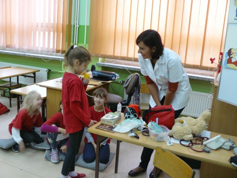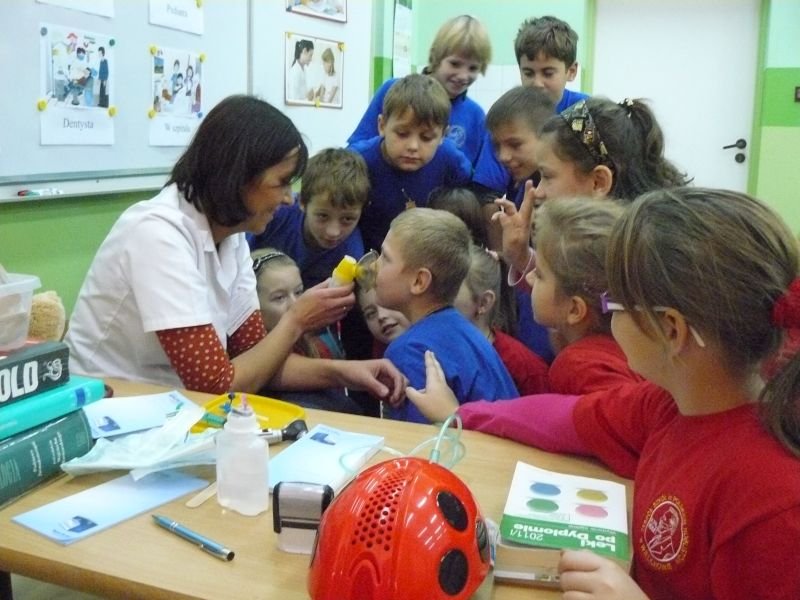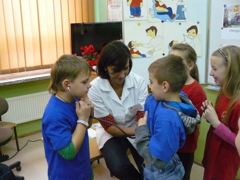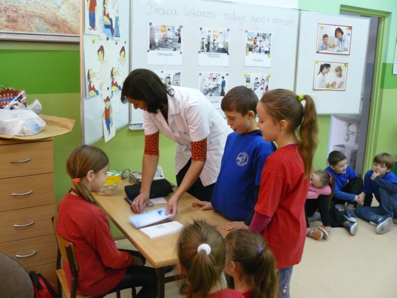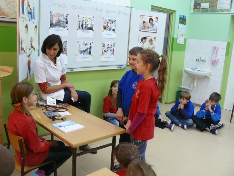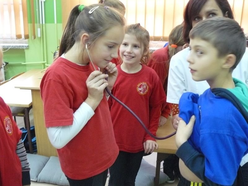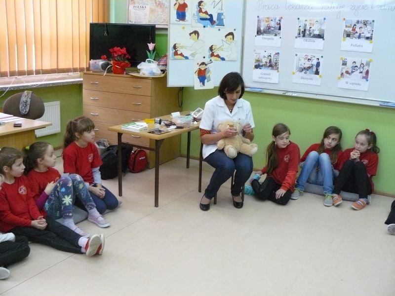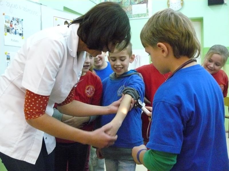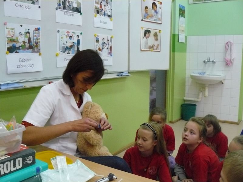 Uczniowie klasy 3a i 3b otrzymali wiele wskazówek związanych z leczeniem pacjenta podczas spotkania z lekarzem, Panią Agatą Cylną - Zborowską, mamą naszego ucznia i absolwentką naszej szkoły. Poznali drogę lekarskiej edukacji, oraz podstawowe zasady przyjmowania pacjentów w gabinecie lekarskim i szpitalu. Największe zainteresowanie wzbudziły u uczniów scenki dramowe, które sami odgrywali pod okiem lekarza z użyciem narzędzi do badań lekarskich oraz obserwacja sposobu zakładania misiowi wenflonu.