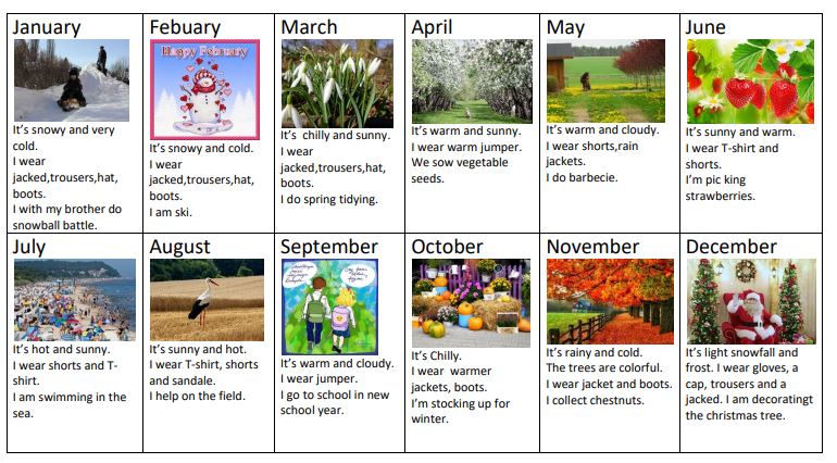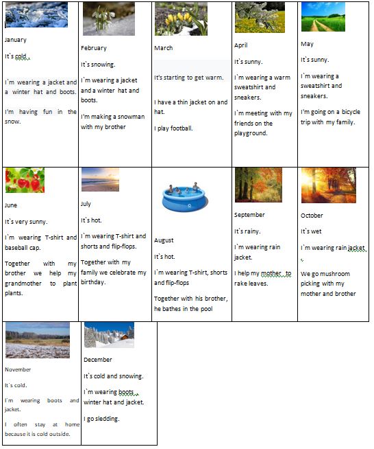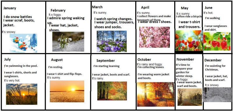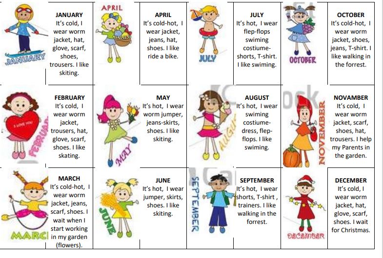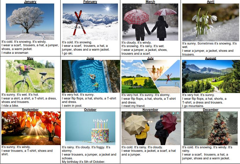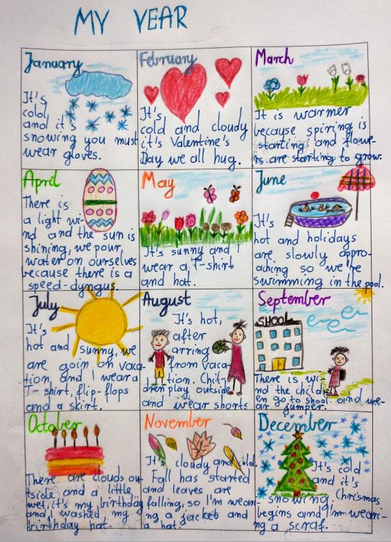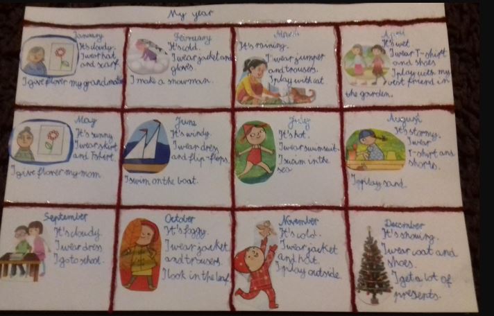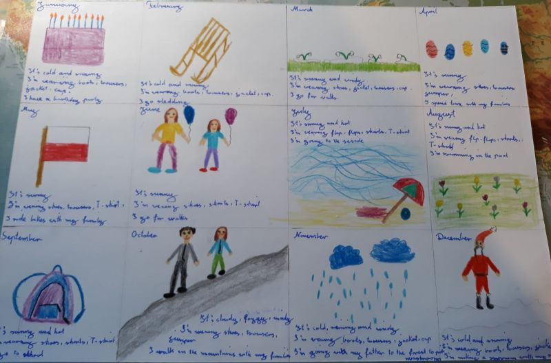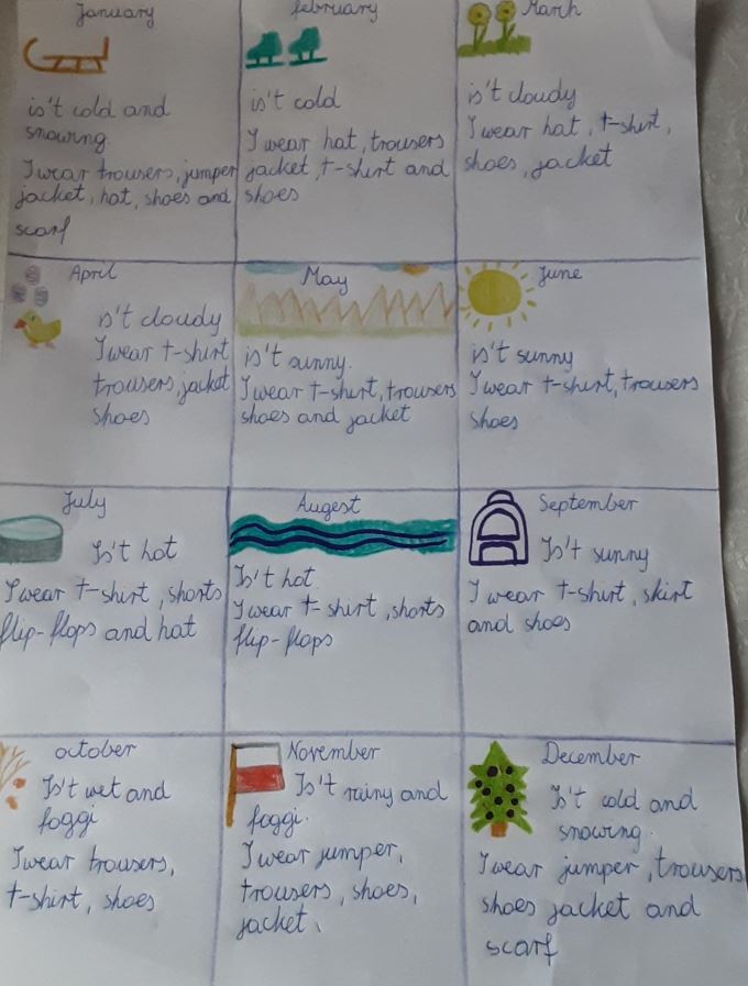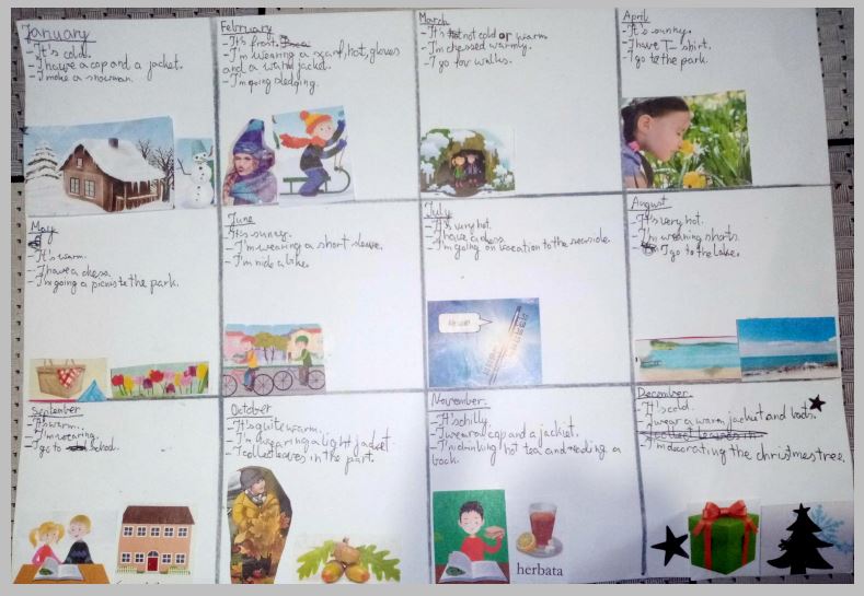 Uczniowie klas czwartych tworzyli kalendarze jako podsumowanie działu, w którym uczyli się angielskich nazw miesięcy, opisu pogody i nazw ubrań.