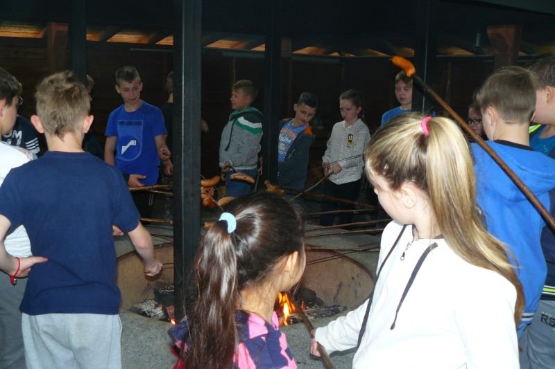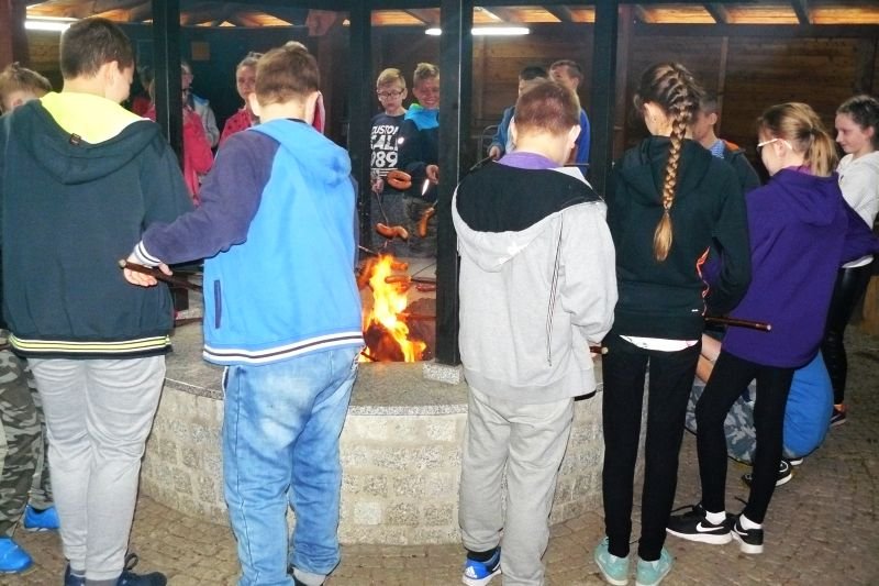 Po powrocie na teren gospodarstwa przy ognisku w wigwamie upiekli sobie kiełbaski, które wszystkim smakowały. Zadowoleni i pełni wiedzy przyrodniczej wrócili do domu.