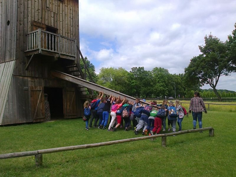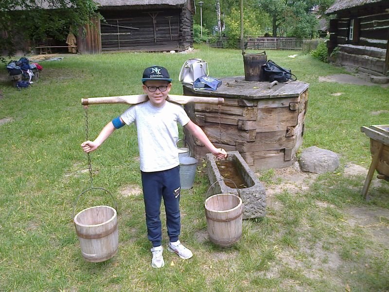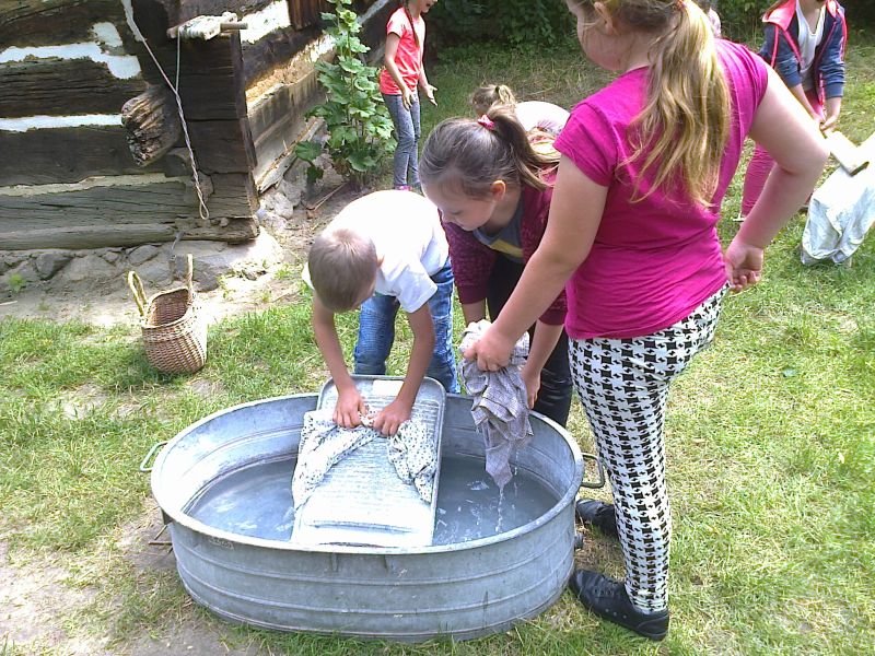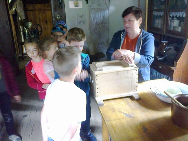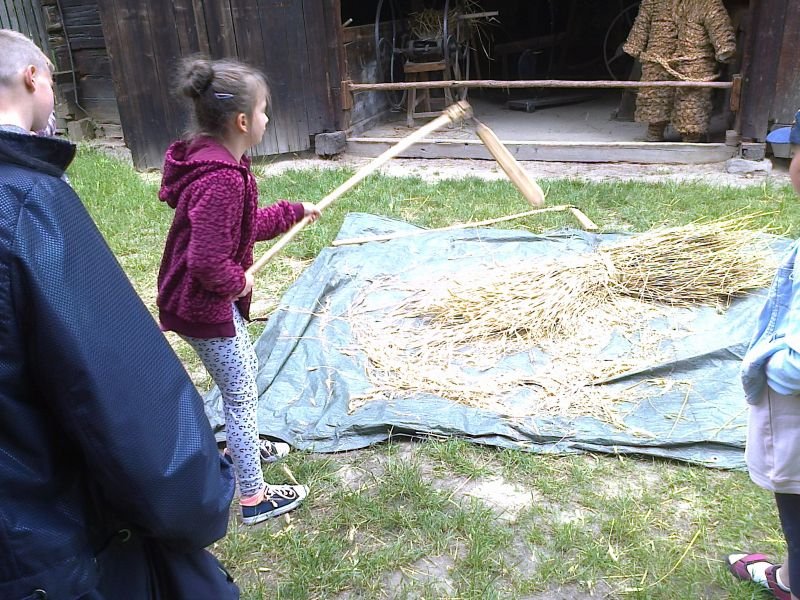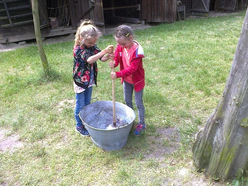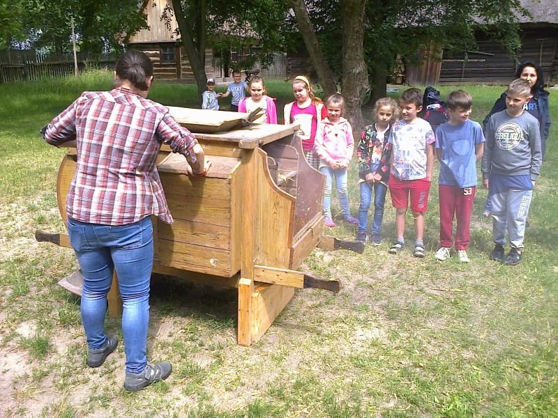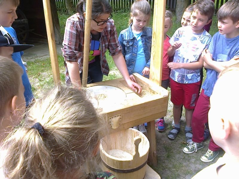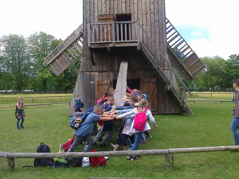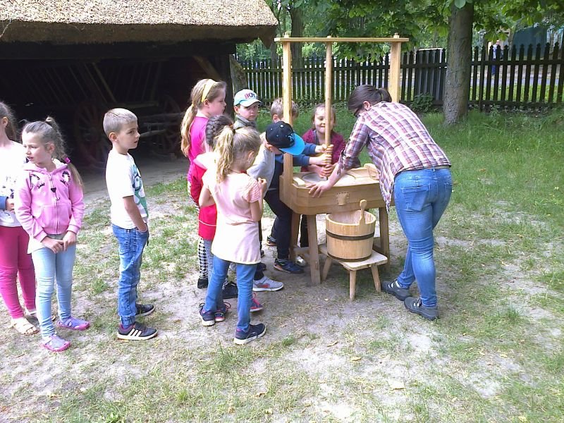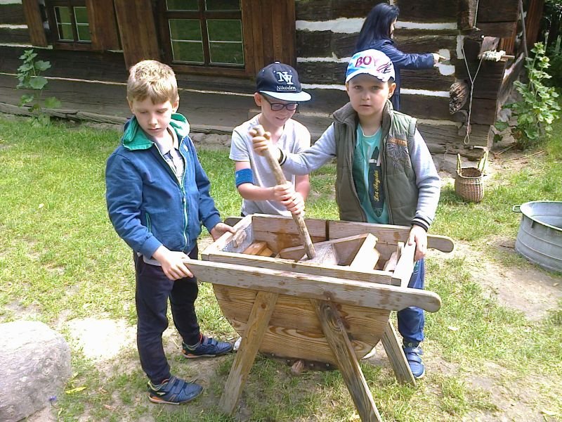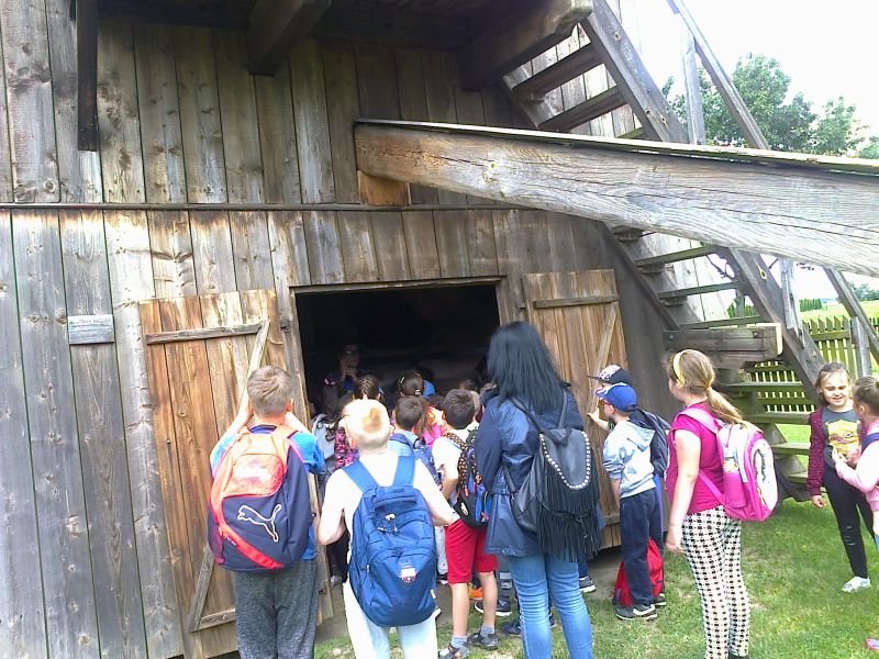 W dniu 14 czerwca 2017r. klasy 1a i 2a wybrały się na wycieczkę do Skansenu Budownictwa Ludowego Zachodniej Wielkopolski we Wolsztynie. Uczestniczyliśmy w interaktywnych zajęciach zatytułowanych: „Tradycyjne zajęcia domowe”. Podążając za panią przewodnik zwiedziliśmy karczmę oraz zagrodę chłopską ze zwierzętami, gdzie dowiedzieliśmy się, jak wyglądały prace domowe w dawnym gospodarstwie chłopskim. Następnie samodzielnie te prace wykonywaliśmy, m.in. nosiliśmy wodę w nosidłach, praliśmy na tarze, wyrabialiśmy masło, mieliliśmy zboże na żarnach, młóciliśmy cepami. Potem podziwialiśmy stary wiatrak, który do tej pory mile zboże na mąkę, a nawet wszyscy daliśmy radę obrócić go w stronę wiatru. Na koniec w ognisku upiekliśmy kiełbaski i po odpoczynku wróciliśmy do Wielichowa.