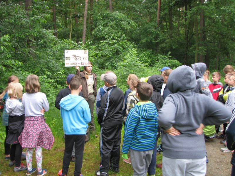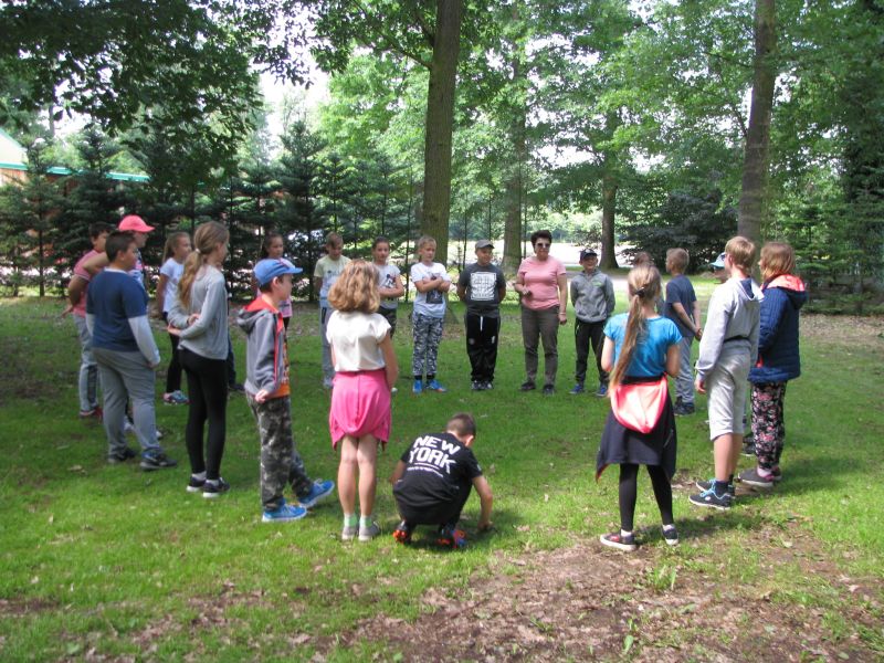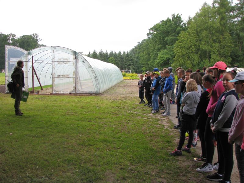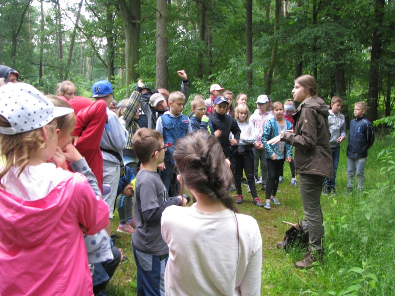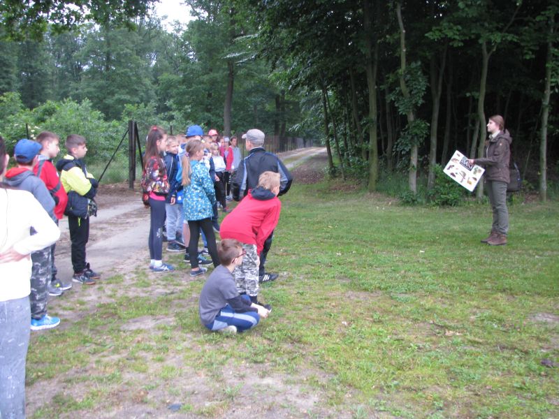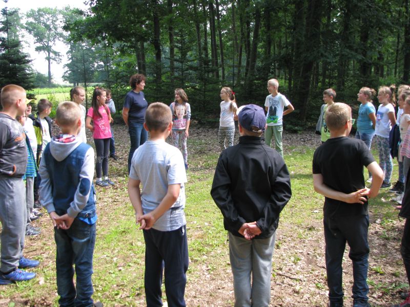 W dniu 12 czerwca 2017r. uczniowie klas czwartych wspólnie ze swoimi wychowawczyniami oraz nauczycielką przyrody uczestniczyli w zajęciach terenowych w Gospodarstwie Szkółkarskim w Racocie. Po przybyciu na miejsce spotkali się z panią leśnik Magdaleną Malcherek z Nadleśnictwa Kościan, która ciekawie opowiadała im o tym, jak powstaje las, co człowiek z niego czerpie i jak go odbudowuje. Mówiła uczniom o zwyczajach oraz potrzebach leśnych zwierząt oraz o zagrożeniach, które mogą nas ze strony zwierząt spotkać i jak sobie z nimi radzić. Uczestnicy rozpoznawali najbardziej pospolite drzewa i rośliny w lesie.