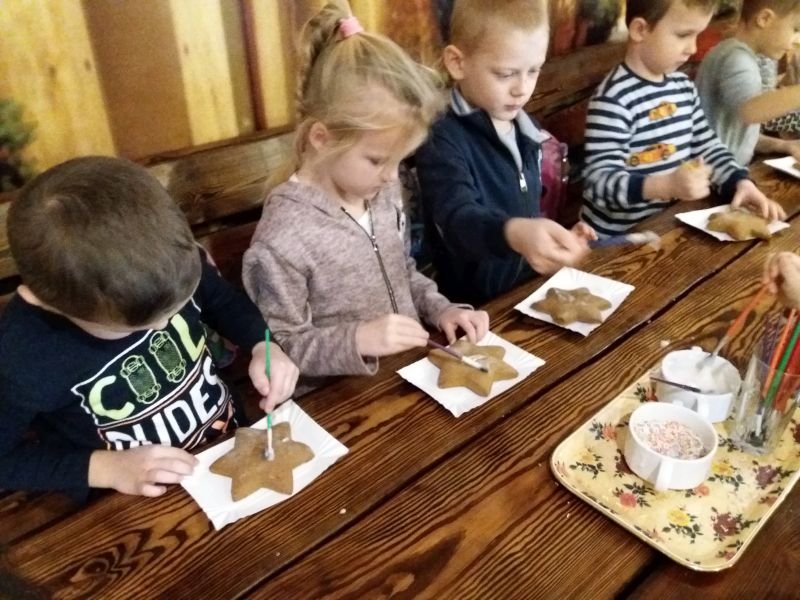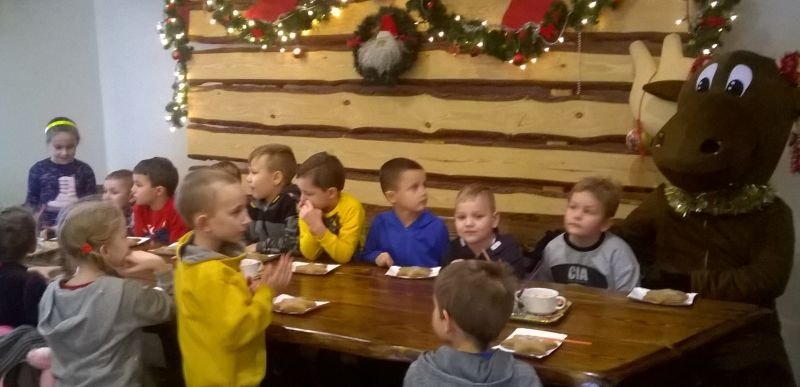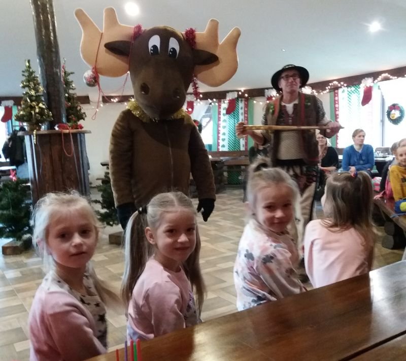 W dniu 17 grudnia 2018 roku tuż przed świętami dzieci z oddziałów przedszkolnych wybrały się na wycieczkę do Kościana, aby uczestniczyć w zabawie poszukiwania Świętego Mikołaja. Spotkali się tam z Panią Gospodynią i jej znajomymi: Góralem, łosiem Heńkiem i Nufrikiem. Maluchy śpiewały wraz z gospodarzami świąteczne piosenki, ubierały choinki i dekorowały pierniki. Po degustacji pysznych pierniczków dzieci udały się do siedziby Mikołaja, gdzie zostały obdarowane małymi upominkami. Finałem mikołajkowej niespodzianki był pobyt w „małpim gaju”, gdzie dzieci mogły oddać się spontanicznym zabawom. Przedszkolaki zmęczone, ale szczęśliwe wróciły do domów z nadzieją odnalezienia wymarzonego prezentu.
