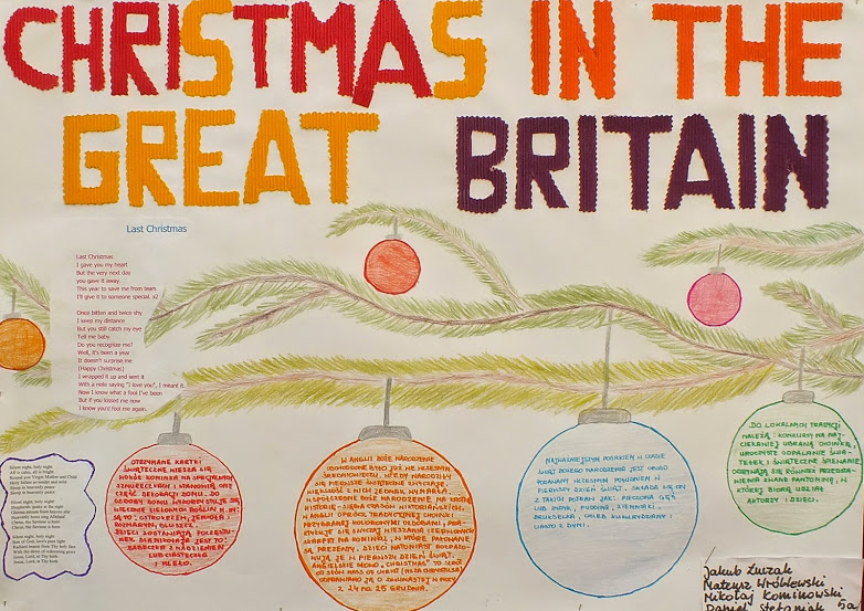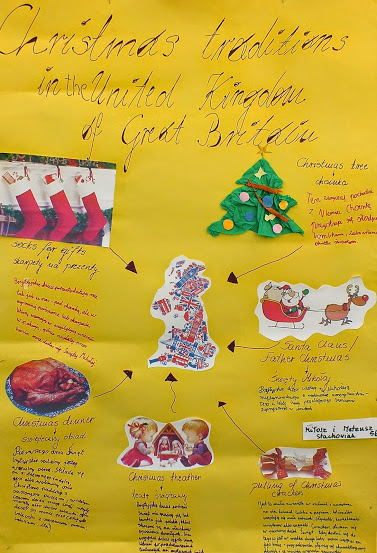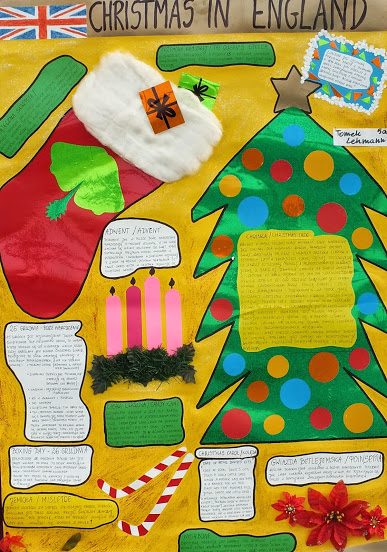 Jak co roku, uczniowie klas piątych i szóstych szkoły podstawowej brali udział w projekcie językowo-plastycznym związanym z krajami anglojęzycznymi. W tym roku szkolnym, w listopadzie i grudniu, uczniowie zbierali informacje o tradycjach Bożego Narodzenia. Projekt miał na celu rozbudzanie zainteresowania kulturą i specyfiką krajów, w których mówi się po angielsku w kontekście świat Bożego Narodzenia, poznawanie specyficznego słownictwa, rozwijanie zdolności plastycznych oraz kształtowanie umiejętności współdziałania w grupie. W czasie pracy nad projektem uczniowie poznawali historię obchodzenia świat, podania i legendy, ciekawostki, zwyczaje, obrzędy, potrawy, sposoby darowania prezentów, lokalne tradycje, typowe dekoracje, życzenia oraz kolędy. Zwieńczeniem uczniowskich poszukiwań było wykonanie dowolną techniką plastyczną plakatu lub prezentacji multimedialnej. Najlepsze prace zostały zaprezentowane społeczności uczniowskiej w formie wystawy w „łączniku” szkolnym, a spośród nich wybrano najlepsze: