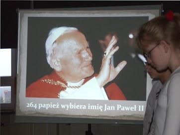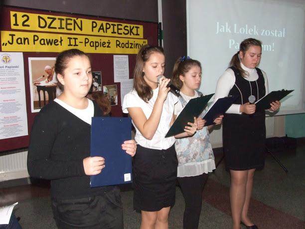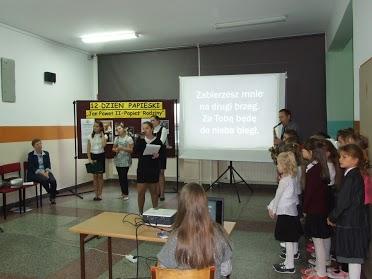 Każdego roku w naszej szkole obchodzony jest Dzień Papieski. Tym razem pod hasłem: "Jan Paweł II - Papież Rodziny" Z tej okazji w szkole podstawowej odbył się uroczysty apel dnia 24 października 2012r. przygotowany przez p. M. Rombel. Uczniowie klas V i VI w pięknym programie artystycznym przypomnieli nam najważniejsze wydarzenia z życia Jana Pawła II, wszyscy mogli obejrzeć miejsca związane z życiem naszego papieża, a następnie razem z chórkiem wykonali ulubioną pieśń Papieża - Barkę a także inne pieśni.