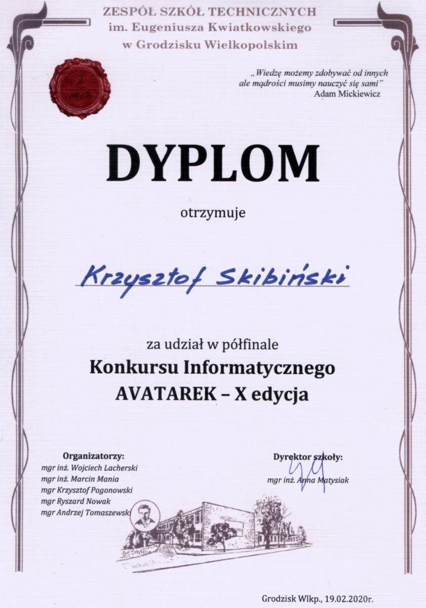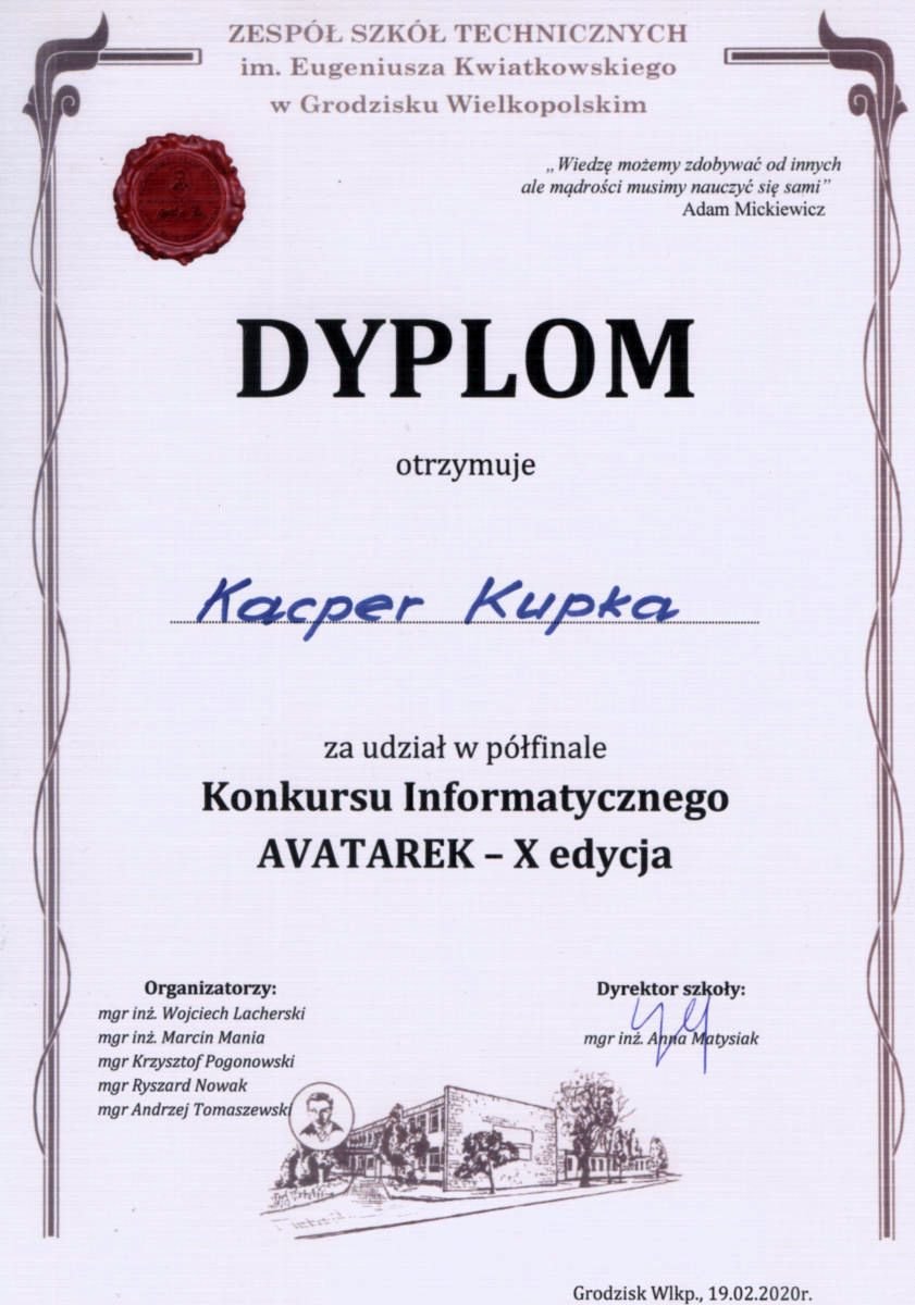 19 lutego 2020 roku w Zespole Szkół Technicznych w Grodzisku Wlkp. odbył się półfinał X już edycji Konkursu Informatycznego AVATAREK organizowanego dla szkół podstawowych m.in. miasta i powiatu poznańskiego oraz grodziskiego. Konkurs (eliminacje i półfinał) organizowany jest w 7 okręgach naszego kraju, tj. okręg poznański, rokietnicki, łódzki, pilski, kaliski, gliwicki oraz grodziski. Patronat nad konkursem sprawuje m.in. Kuratorium Oświaty, Ośrodek Doskonalenia Nauczycieli oraz Polskie Towarzystwo Informatyczne z Poznania, a także lokalne Powiaty.
