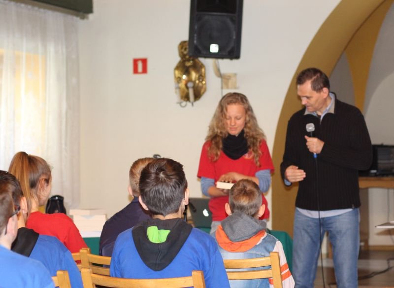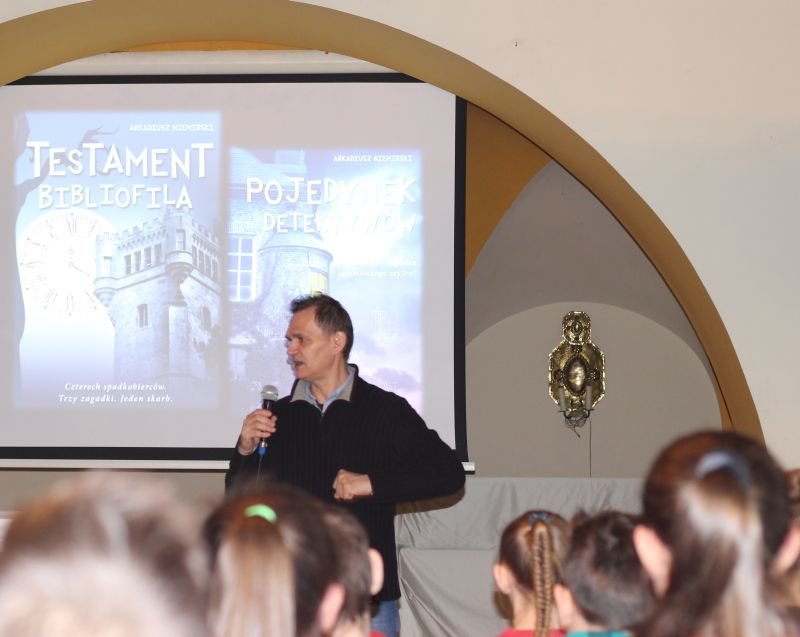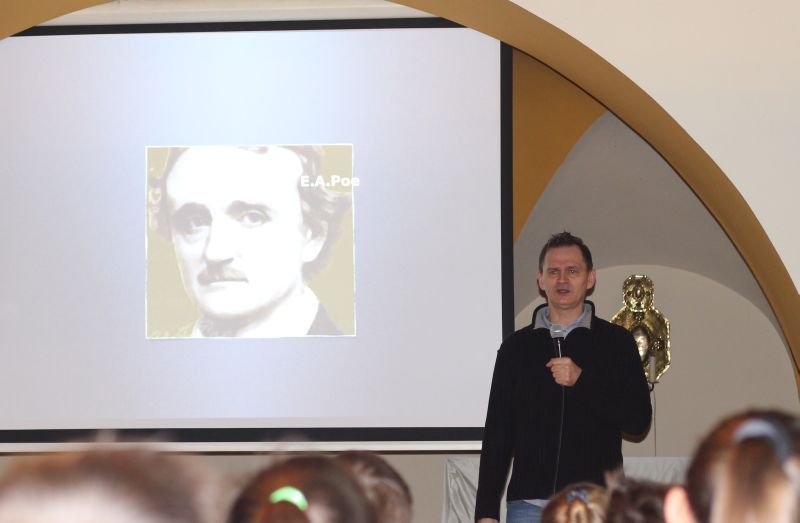 Autor przedstawił w formie prezentacji multimedialnej swój życiorys, opowiadając w ciekawy, pełen humoru sposób między innymi o tworzeniu kabaretu, współpracy z Programem III Polskiego Radia oraz z czasopisami „Tylko Rock” i „Teraz Rock”, a także swoich fascynacjach twórczością Zbigniewa Nienackiego i zespołem Procol Harum. Ponadto przybliżył uczniom najsłynniejszych twórców powieści detektywistycznych, takich jak np.: A.C. Doyle, A. Christie, R. Chandler czy A. MacLean.