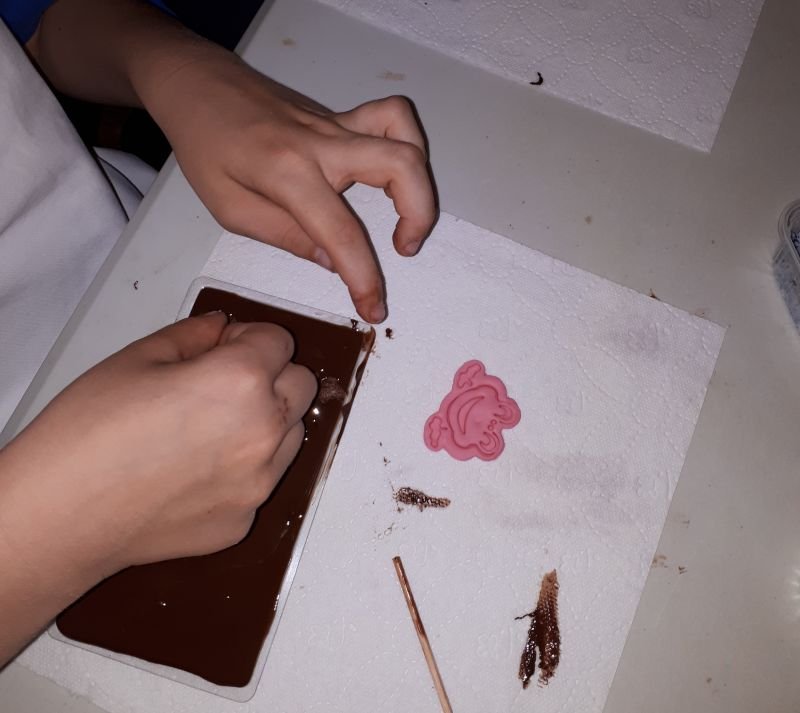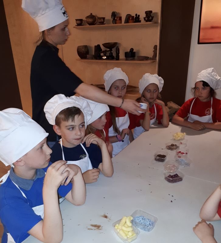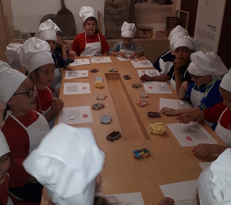 Wczesnym popołudniem zjedliśmy smaczny obiad na terenie zoo. Następnie pojechaliśmy do centrum Poznania do Muzeum Czekolady na warsztaty pt. ”Czekoladowa przygoda”, na których tworzyliśmy własną tabliczkę czekolady. Na wstępie każdy uczestnik otrzymał strój deseranta (fartuch i czapkę kucharską) oraz mył ręce. Potem należało wykonać niepowtarzalną tabliczkę czekolady. Podczas, gdy w chłodni tabliczki tężały, wysłuchaliśmy opowiadania i obejrzeliśmy film o historii czekolady od ziarna na plantacjach do tabliczki i degustowaliśmy ziarna kakao. Po zapakowaniu schłodzonych czekolad wyruszyliśmy w drogę powrotną do Wielichowa.