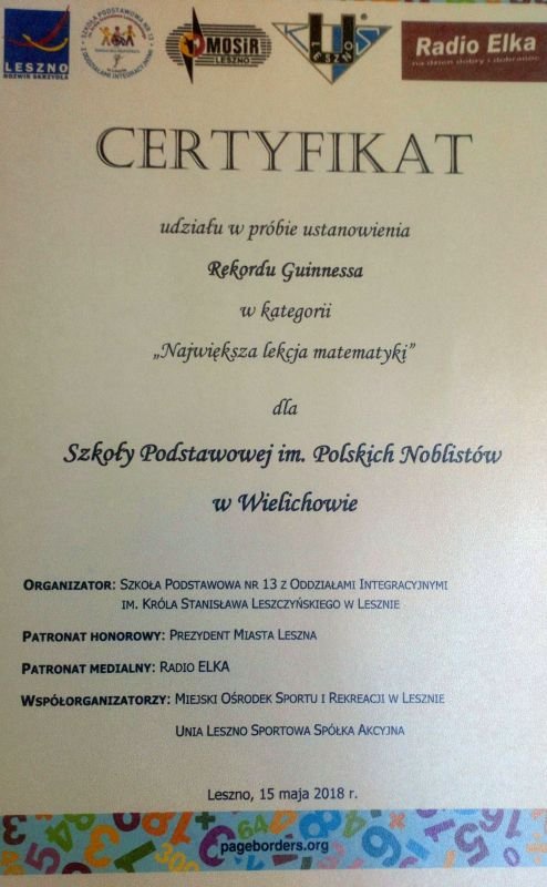 We wtorek 15 maja uczniowie klas piątych i szóstych wraz z wychowawcami brali udział w biciu Rekordu Guinessa. Uczestniczyli oni w największej lekcji matematyki na świecie, która odbyła się na stadionie żużlowym im. Alfreda Smoczyka w Lesznie. Motywem tej niezwykłej lekcji był temat „Magia czy matematyka?”. Po dzwonku rozpoczynającym lekcję, uczniowie zmagali się z  zadaniami dotyczącymi kwadratów magicznych. Wspólnie zadania rozwiązywało 4635 osób, odpowiadając na pytania nauczycielki kartkami koloru zielonego bądź czerwonego. Oczywiście, lekcja zakończyła się krótką kartkówką. Przed zajęciami wystąpiła Młodzieżowa Orkiestra Dęta z Włoszakowic wraz z mażoretkami. Po nauce uczestnicy mogli obejrzeć trening żużlowców Unii Leszno.