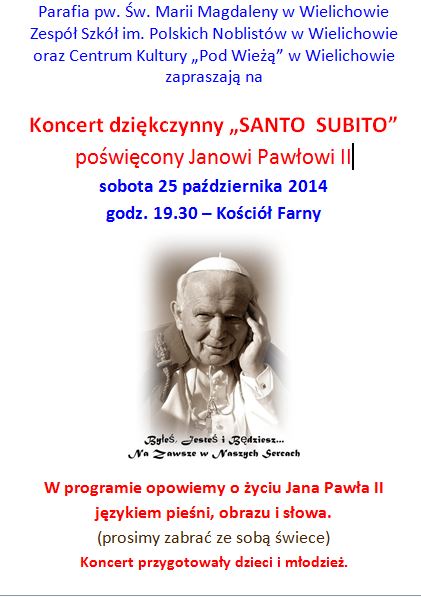 W imieniu dzieci i młodzieży z naszej szkoły zapraszam serdecznie na Koncert Papieski, który odbędzie się w sobotę 25 października 2014r. o godz. 19.30 w Kościele Farnym pw. Św. Marii Magdaleny w Wielichowie. Pragniemy wyrazić słowem i pieśnią dziękczynienie za kanonizację naszego Wielkiego Rodaka – Świętego Jana Pawła II.