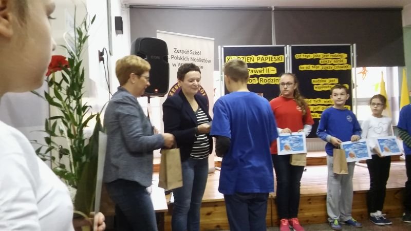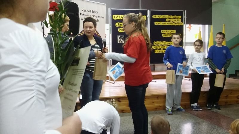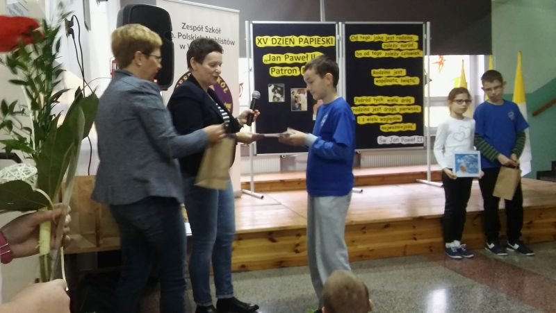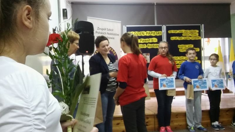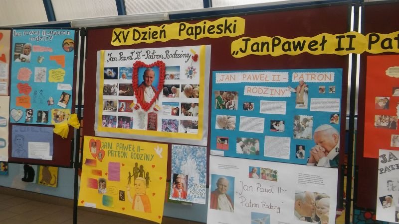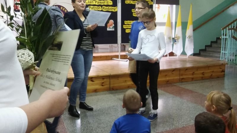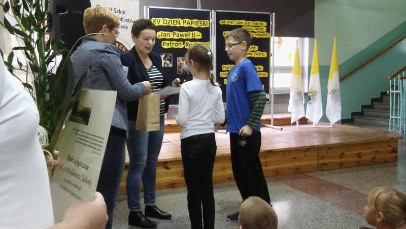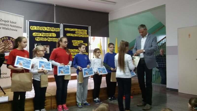W tym roku nieco inaczej niż zwykle w Szkole Podstawowej w Wielichowie świętowano XV Dzień Papieski, który obchodzony był pod hasłem: „Jan Paweł II – Patron Rodziny”. Klasy V i VI mogły się wykazać zdolnościami plastycznymi przygotowując prace na konkurs pod tym samym tytułem. W swoich pracach uczniowie mieli zinterpretować hasło i umieścić wypowiedzi papieża Jana Pawła II na temat rodziny. Wszystkie prace zostały umieszczone na wystawie, tak, by mogli je podziwiać wszyscy uczniowie naszej szkoły. Tydzień później nasza wystawa została wzbogacona o znaczki z wizerunkiem Św. Jana Pawła II. Wystawa ta jest imponująca, bo zawiera ponad 4 tysiące znaczków. A wszystko dzięki Panu Waldemarowi Ślebiodzie z Kamieńca, który zgodził się wystawić swoje znaczki, spotkać się z uczniami i opowiedzieć o tym jak powstała tak wielka kolekcja. Pan Waldek gościł w naszej szkole w środę 21 października br. Podczas spotkania z uczniami szkoły podstawowej i gimnazjum dzielił się tym, kim dla Niego był i jest Ojciec Święty Jan Paweł II. Opowiedział też jak powstała tak ogromna kolekcja znaczków i w jaki sposób je nabywał. Pan Waldek chętnie też odpowiadał na pytania dzieci, których było niemało. Na koniec tego ciekawego spotkania dyrektor Bogumiła Andrzejewska podziękowała naszemu gościowi za wizytę w naszej szkole i wręczyła dyplomy oraz nagrody wyróżnionym w konkursie uczniom. W tym roku nagrody ufundował Ks. Proboszcz Wieńczysław Nowak z parafii p.w. Św. Marii Magdaleny w Wielichowie. Nagrodzeni uczniowie: * Anna Banach kl. 5a – miejsce I * Tomasz Lehmann kl. 6a – miejsce II * Emilia Tylińska kl. 5a – miejsce III * Mateusz Wróblewski kl. 6a – miejsce III * Daria Napieralska kl. 6b – miejsce III * Kinga i Oskar Krawczyk – wyróżnienie Przy tej okazji pragniemy serdecznie zaprosić do obejrzenia tej wystawy znaczków wszystkich chętnych mieszkańców naszej gminy. Wystawa znajduje się w łączniku między budynkami szkoły podstawowej i gimnazjum w Wielichowie.