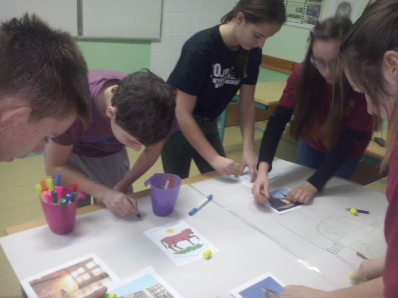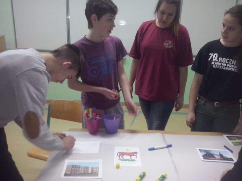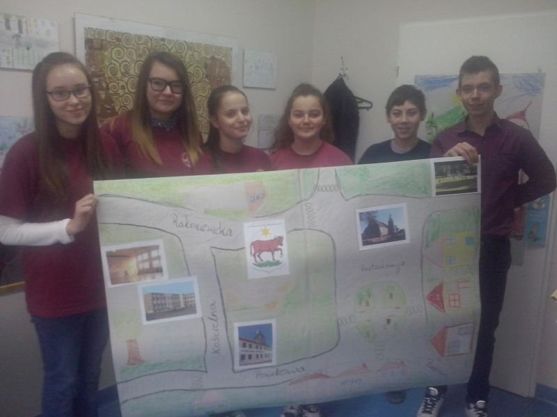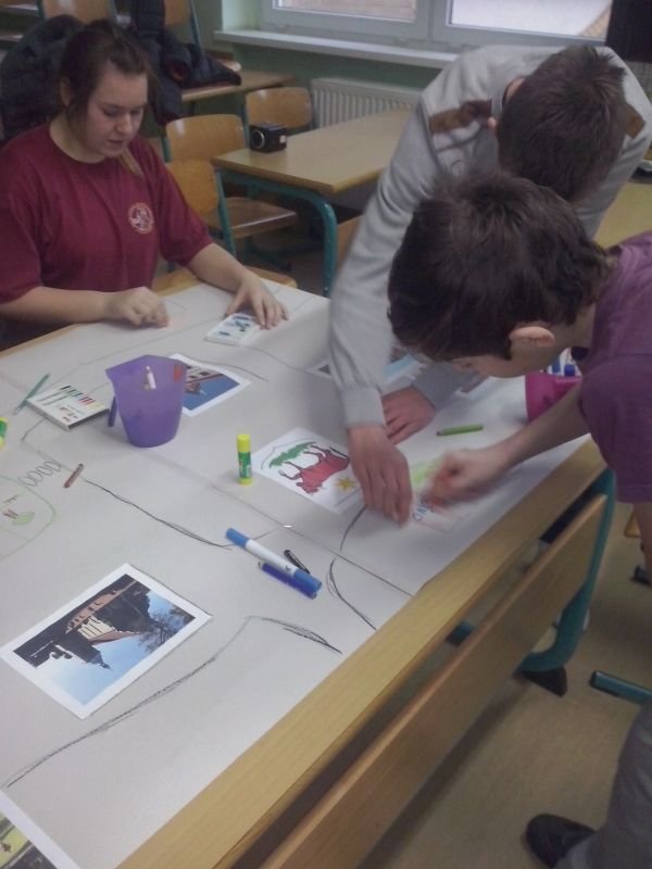 Podczas pierwszego spotkania zrealizowaliśmy scenariusz zajęć zawarty w publikacji „Podejmowanie działań na rzecz zmian w środowisku lokalnym” i stworzyliśmy mapę naszego najbliższego otoczenia, na której zaznaczyliśmy miejsca, w których najczęściej przebywamy.