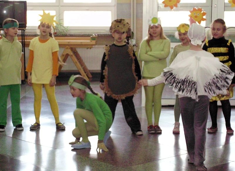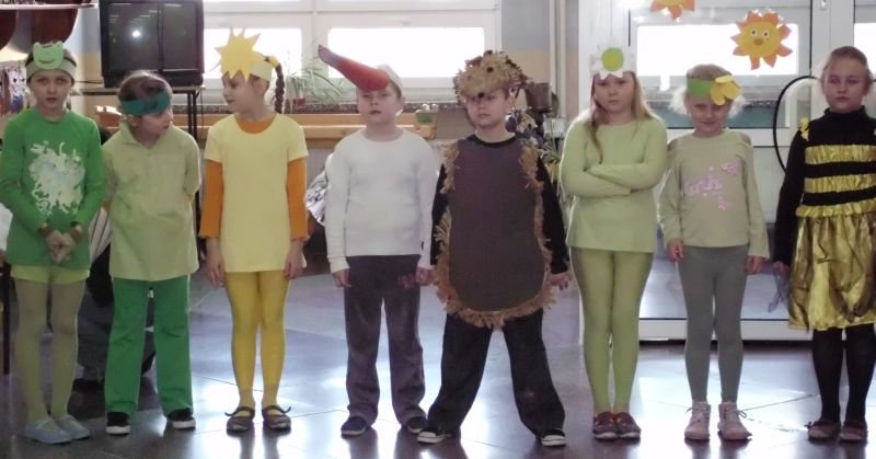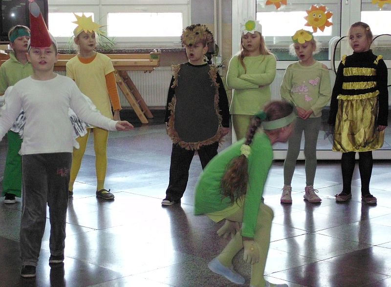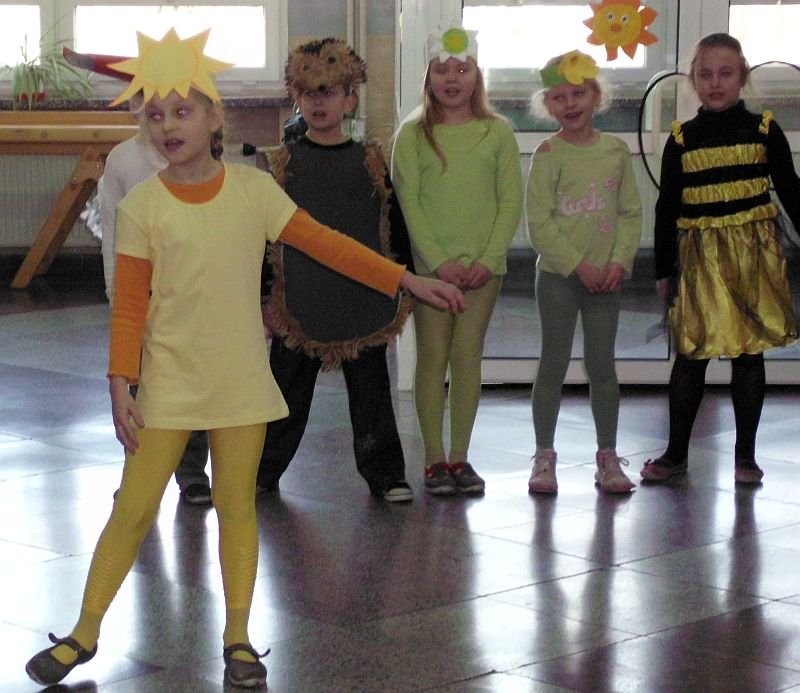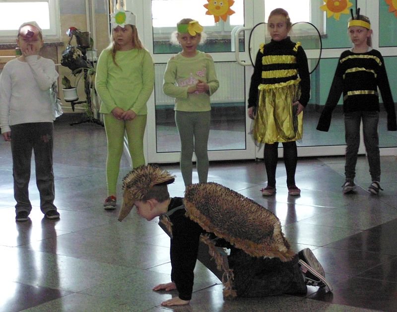 Klasa 1b przygotowała krótkie przedstawienie dla koleżanek i kolegów z ,,zerówki". Dzieci wcieliły się w role bocianów, żab, pszczółek, kwiatków i jeża. Słowami inscenizacji i piosenki zakomunikowały wszystkim,że "PRZYSZŁA WIOSNA".