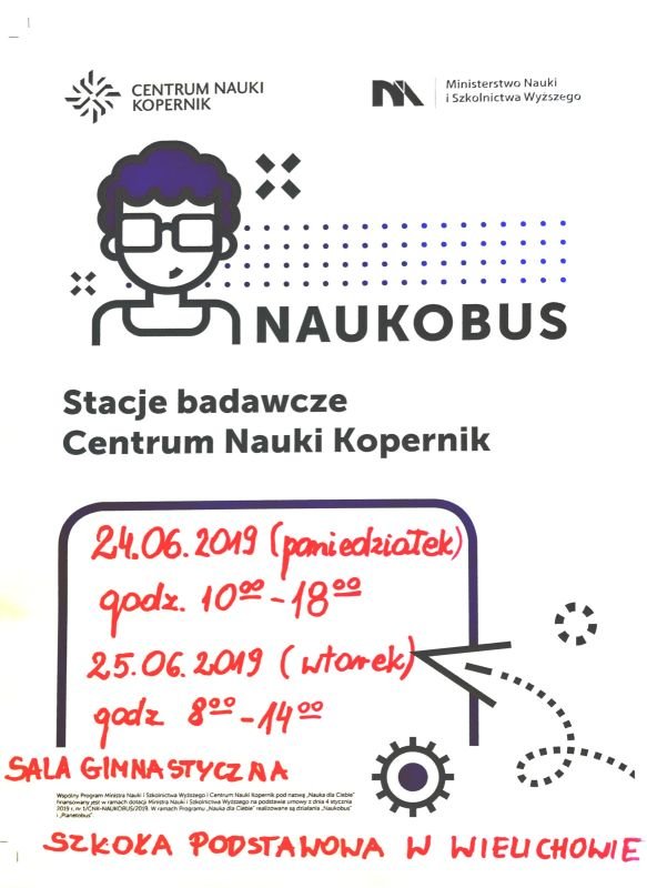 W dniach 24 i 25 czerwca do Wielichowa przyjedzie NAUKOBUS. Zapraszamy wszystkich do Szkoły Podstawowej im. Polskich Noblistów w Wielichowie, gdzie w sali gimnastycznej edukatorzy z Centrum Nauki Kopernik przeniosą nas w niezwykły świat wiedzy i nauki. Dzięki możliwości samodzielnego eksperymentowania i żywego kontaktu z nauką będzie można lepiej zrozumieć otaczający nas świat. Do zobaczenia!